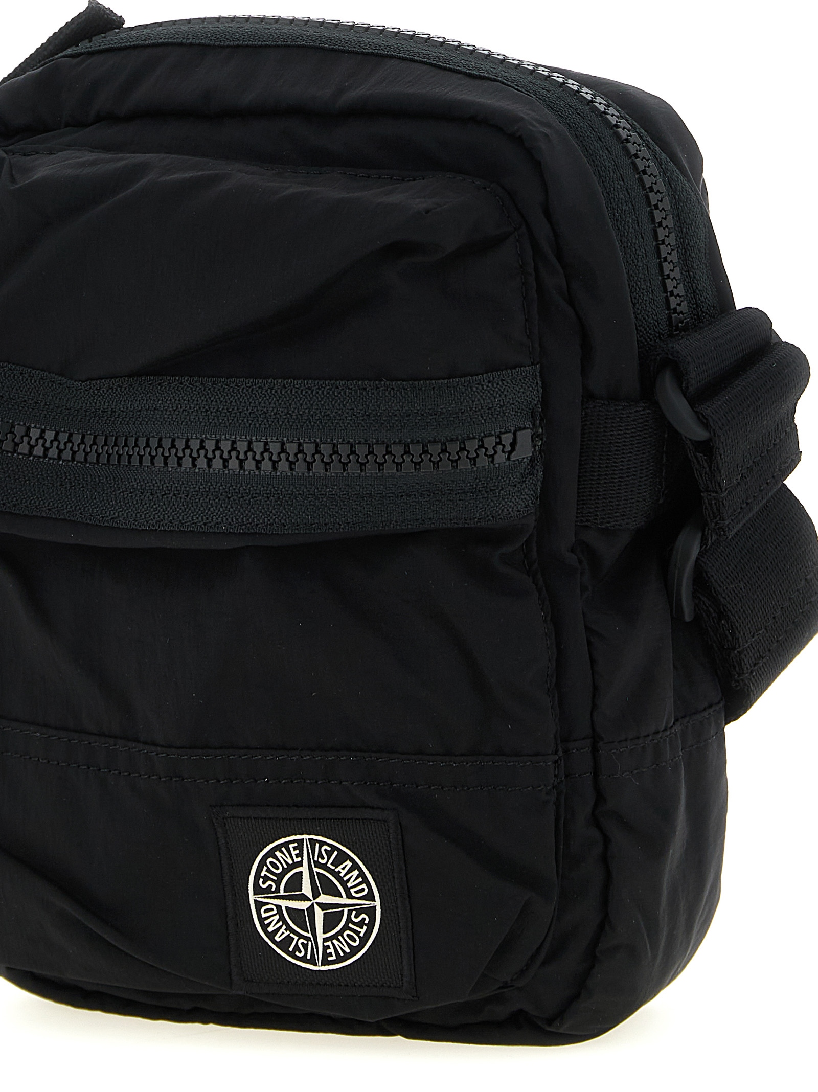 Garment-dyed Nylon Metal shoulder strap with wrinkled double color recipe, polyurethane lining, ‘Compass’ logo patch and front zip pocket, top zip closure, back pocket, adjustable shoulder strap.