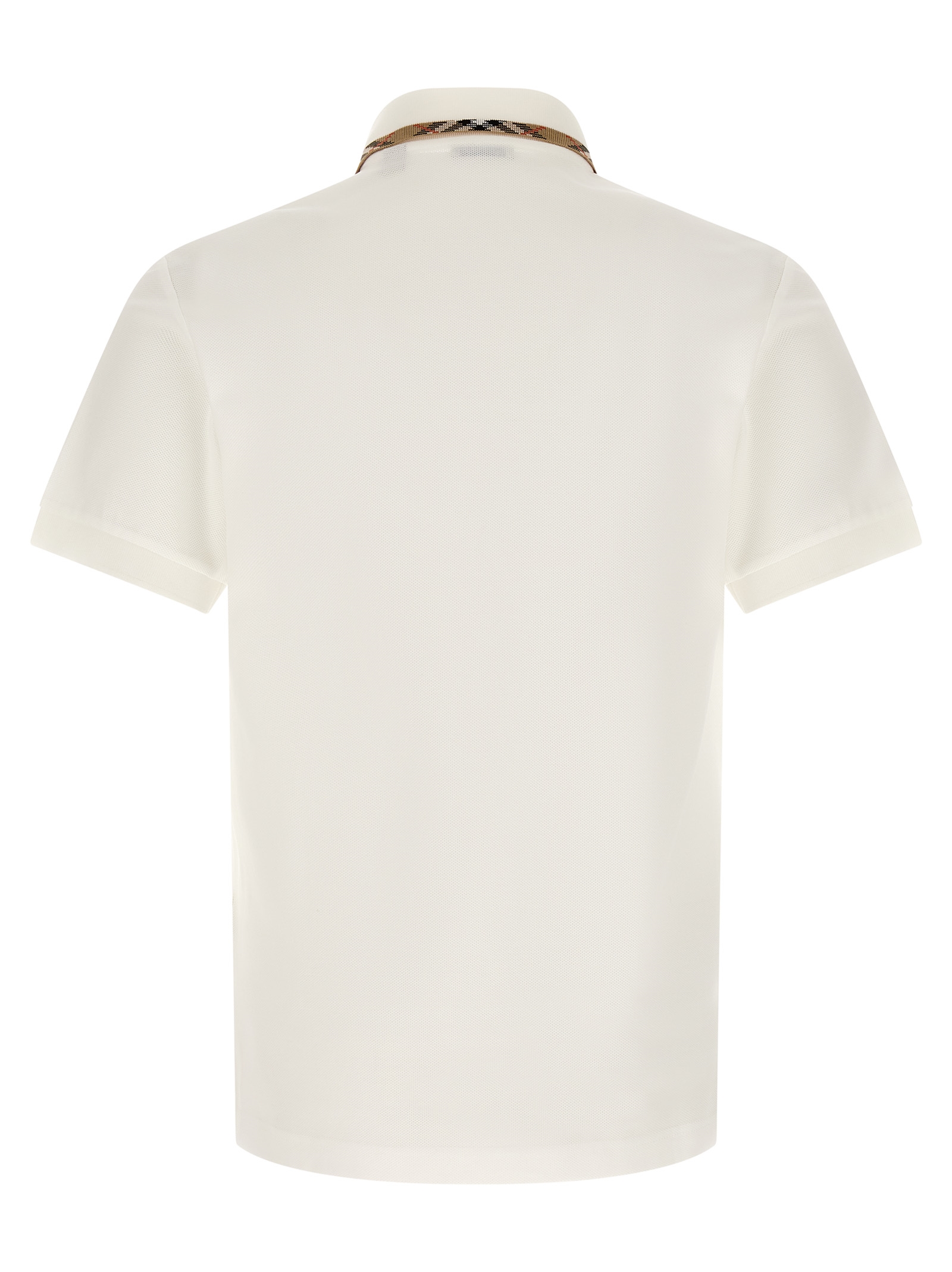 ‘Eddie’ cotton piqué polo shirt with tone-on-tone ‘Equestrian Knight Design’ embroidered logo on the front, collar with Burberry Check intarsia and buttons, short cuffed sleeves, side slits on an asymmetrical hem.