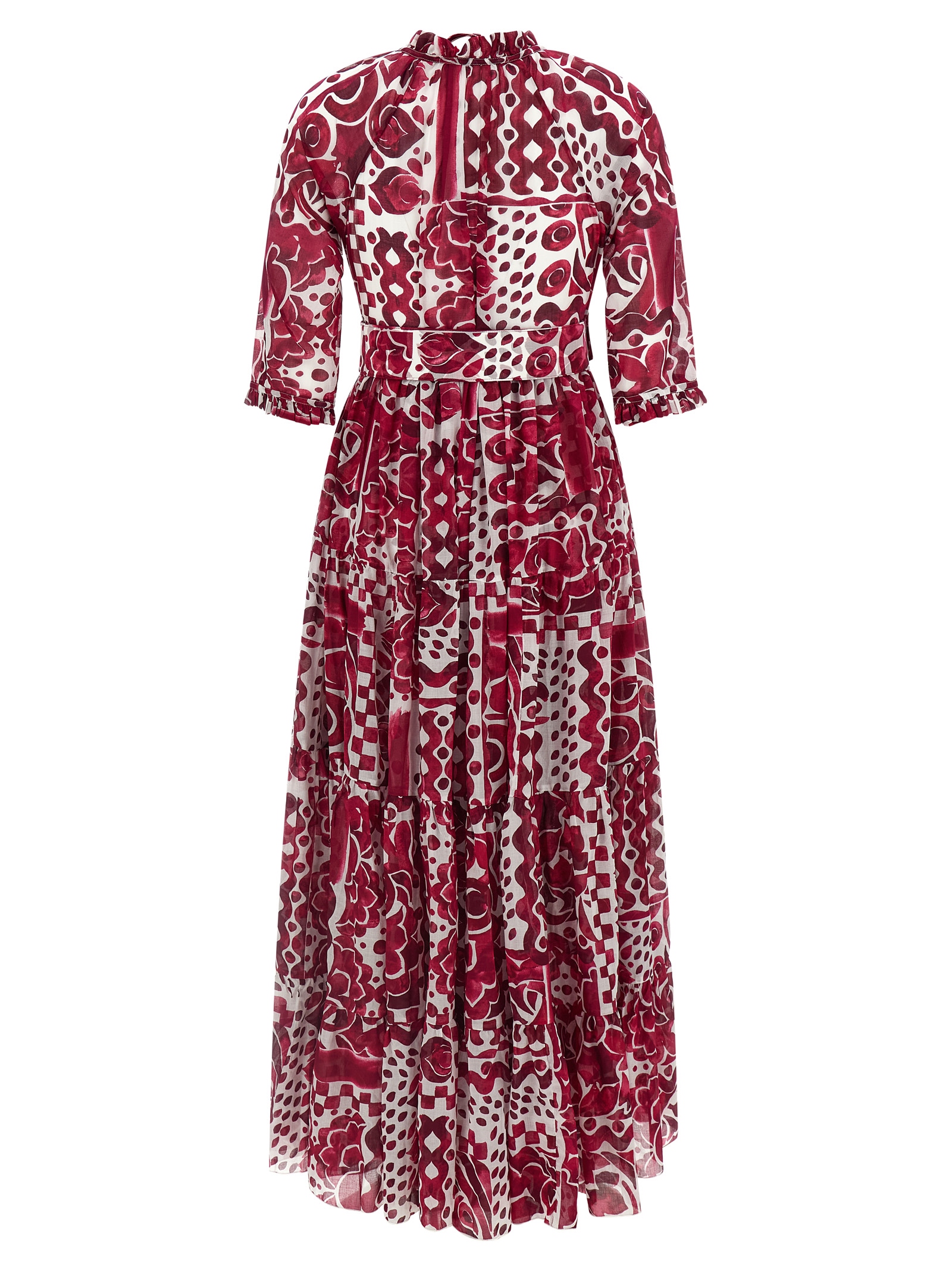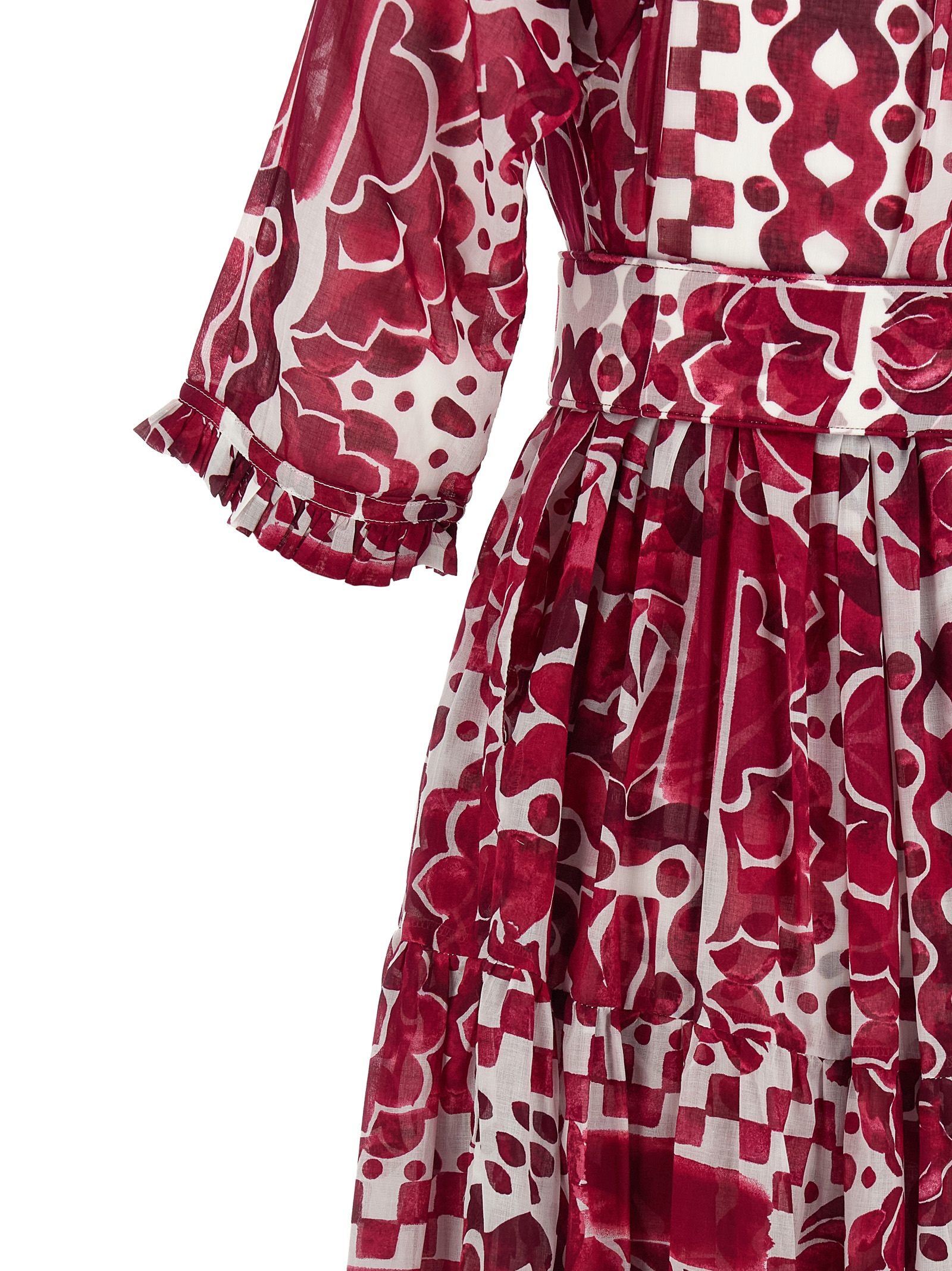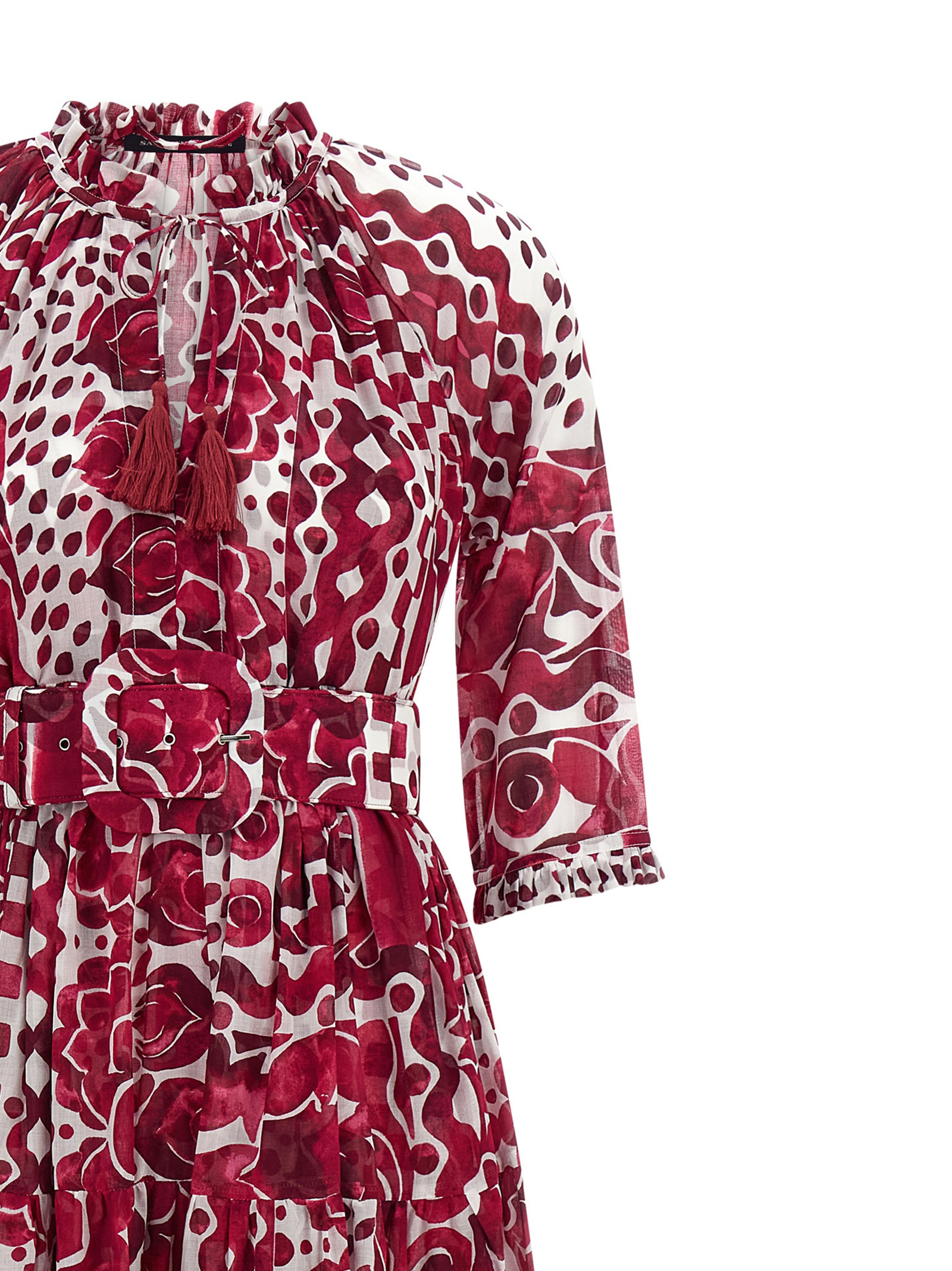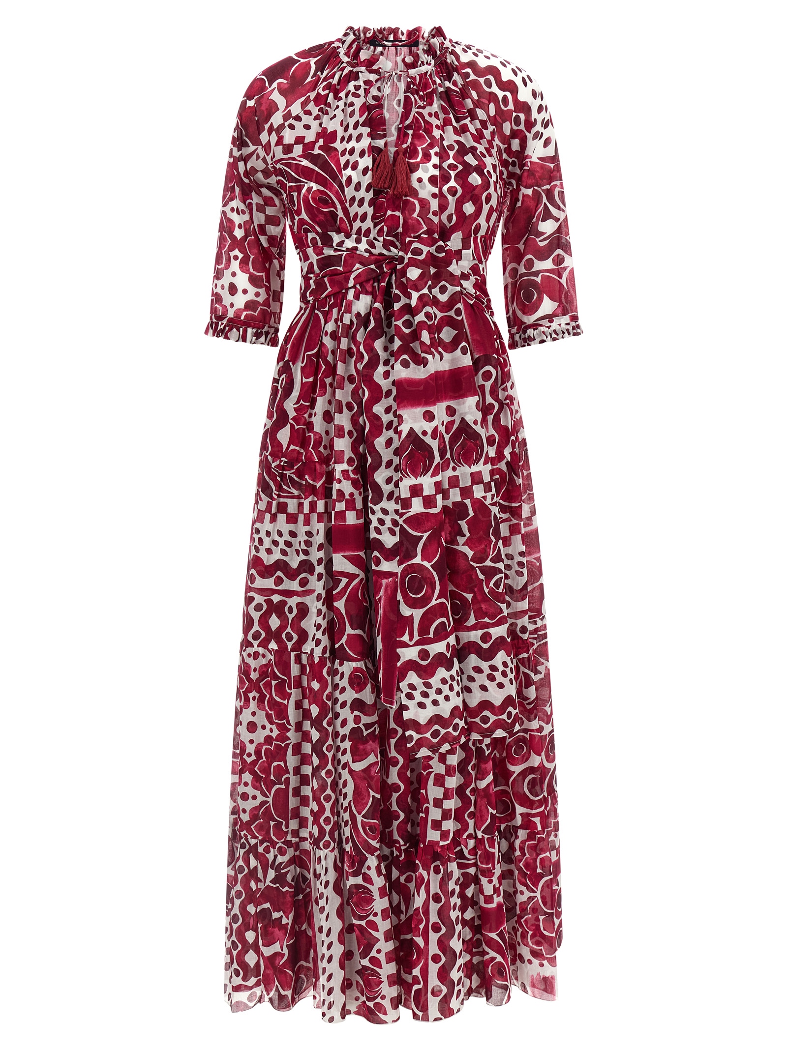 Long ‘Eden’ dress in all-over print cotton muslin, V-neck with one button closure, ruffle collar and tassel drawstring, wide skirt, underskirt, pockets, 3/4 sleeves with ruffles on the sleeve bottom, removable matching belt and sash.