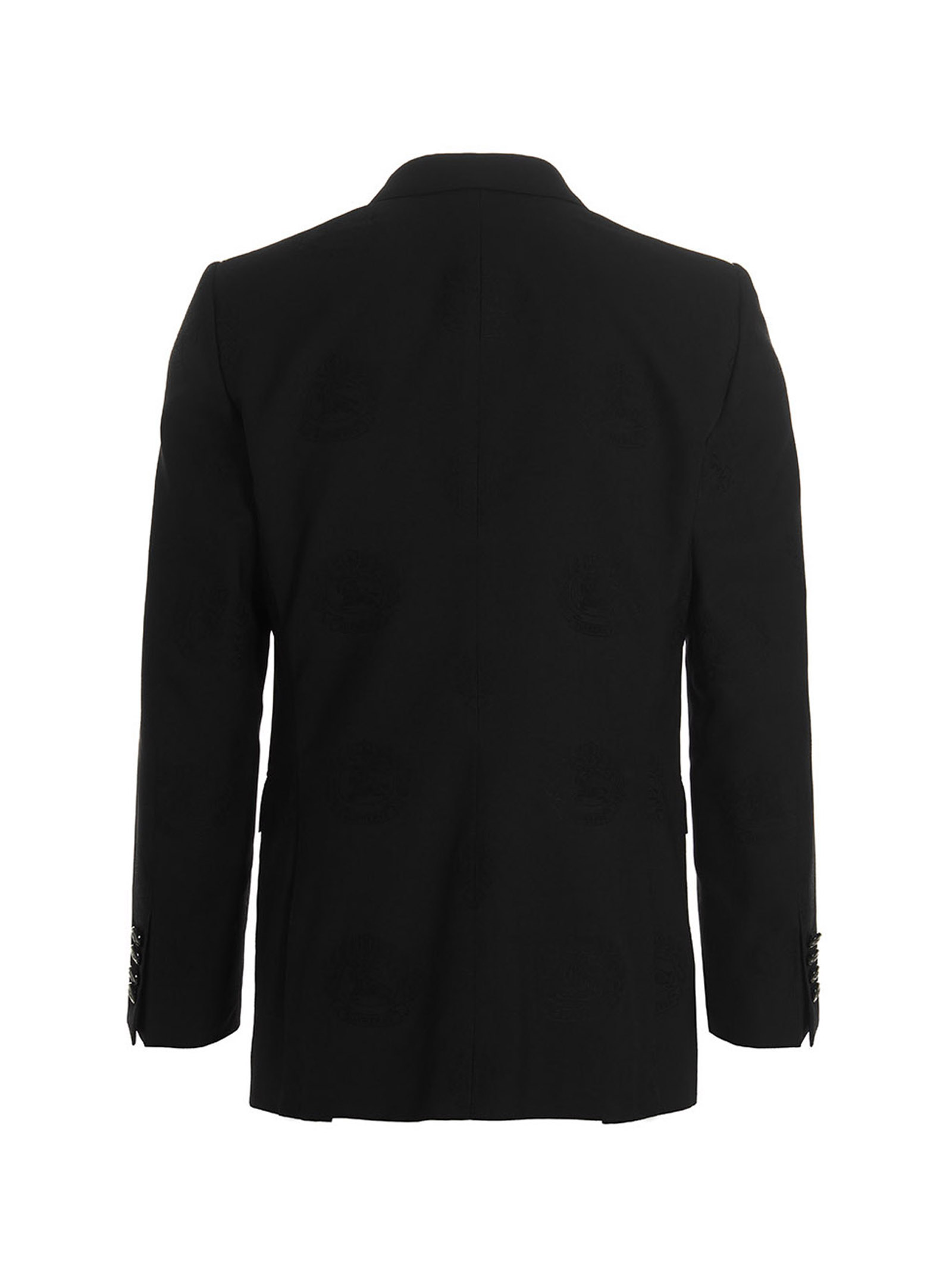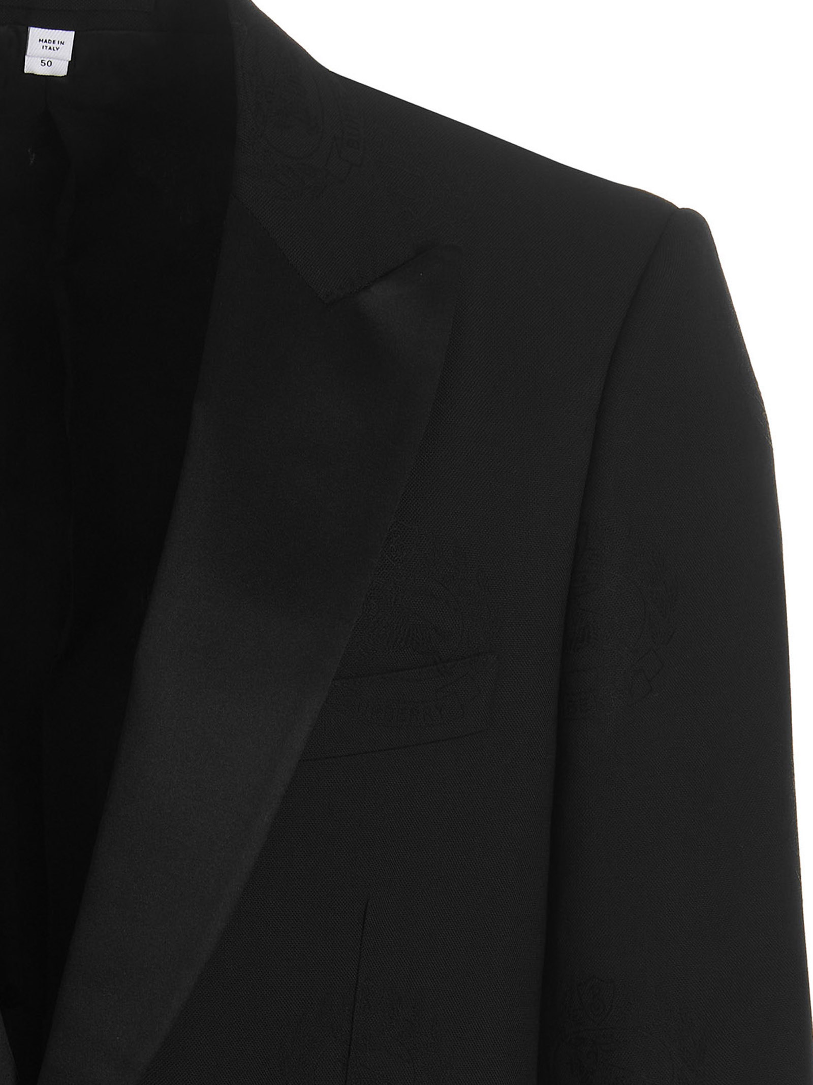 ‘Edinburgh’ tailored tuxedo blazer jacket in wool and cotton with bonded linen, oak leaves and tonal jacquard logo, structured shoulders, single-breasted closure with logo buttons, pointed lapels, welt pocket on the chest, flap pockets, inner button welt pockets, inner button pocket, functional button cuffs, double split at the back.