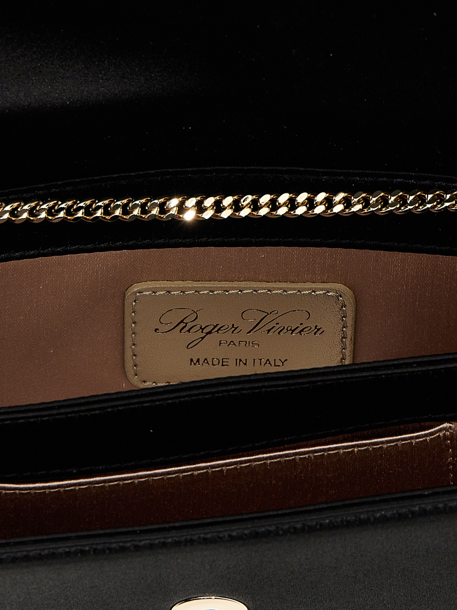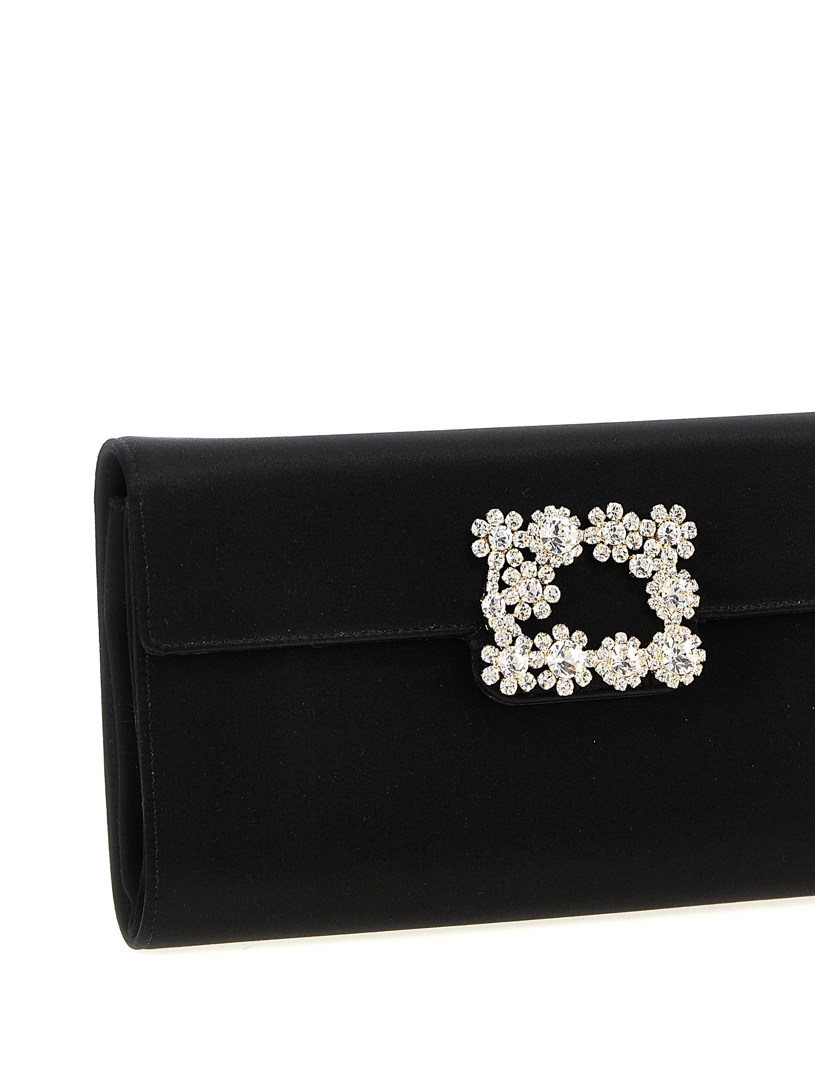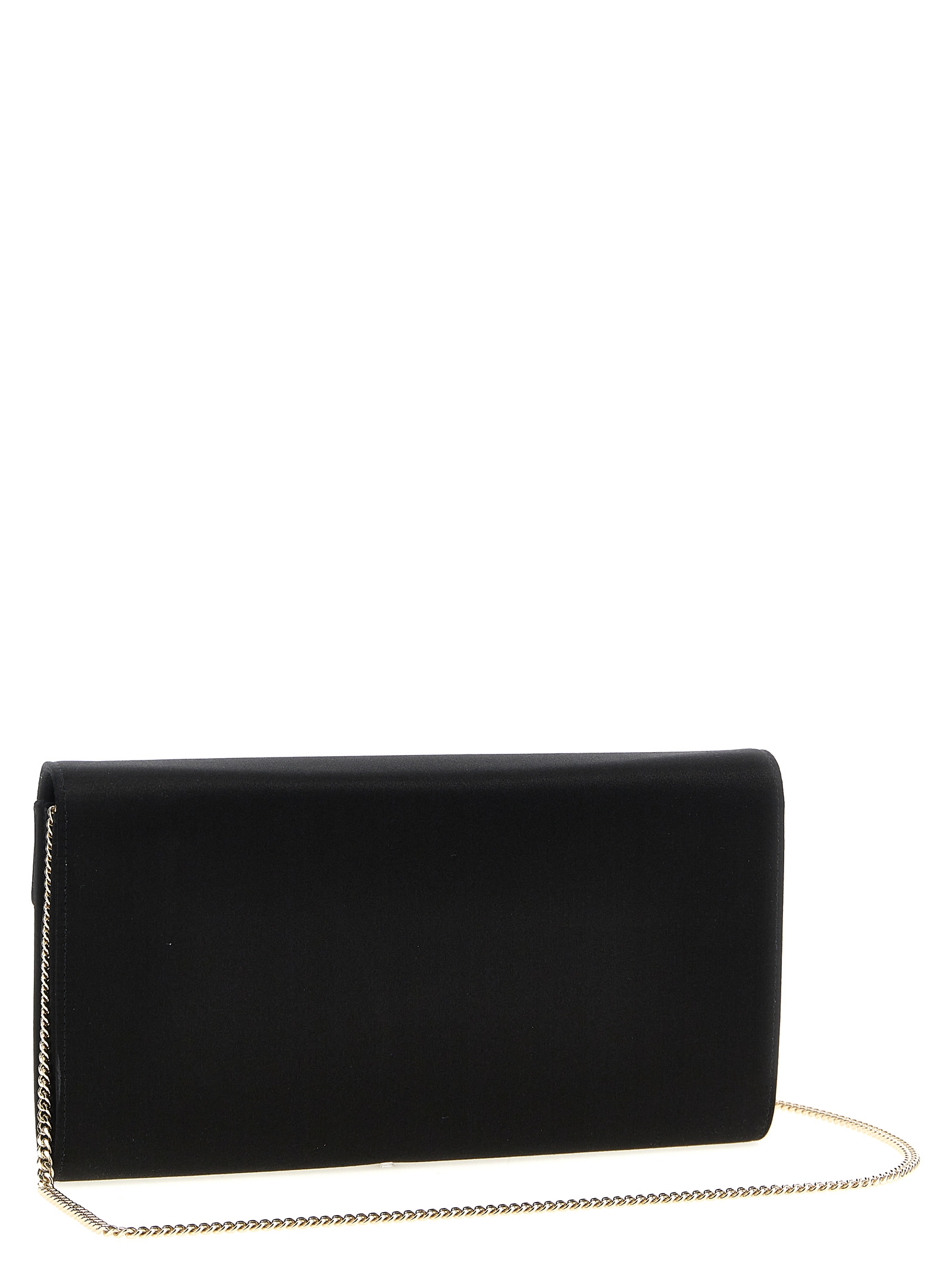 ‘Efflorescence’ satin clutch, snap flap closure with front jewel buckle application, sliding chain shoulder strap.