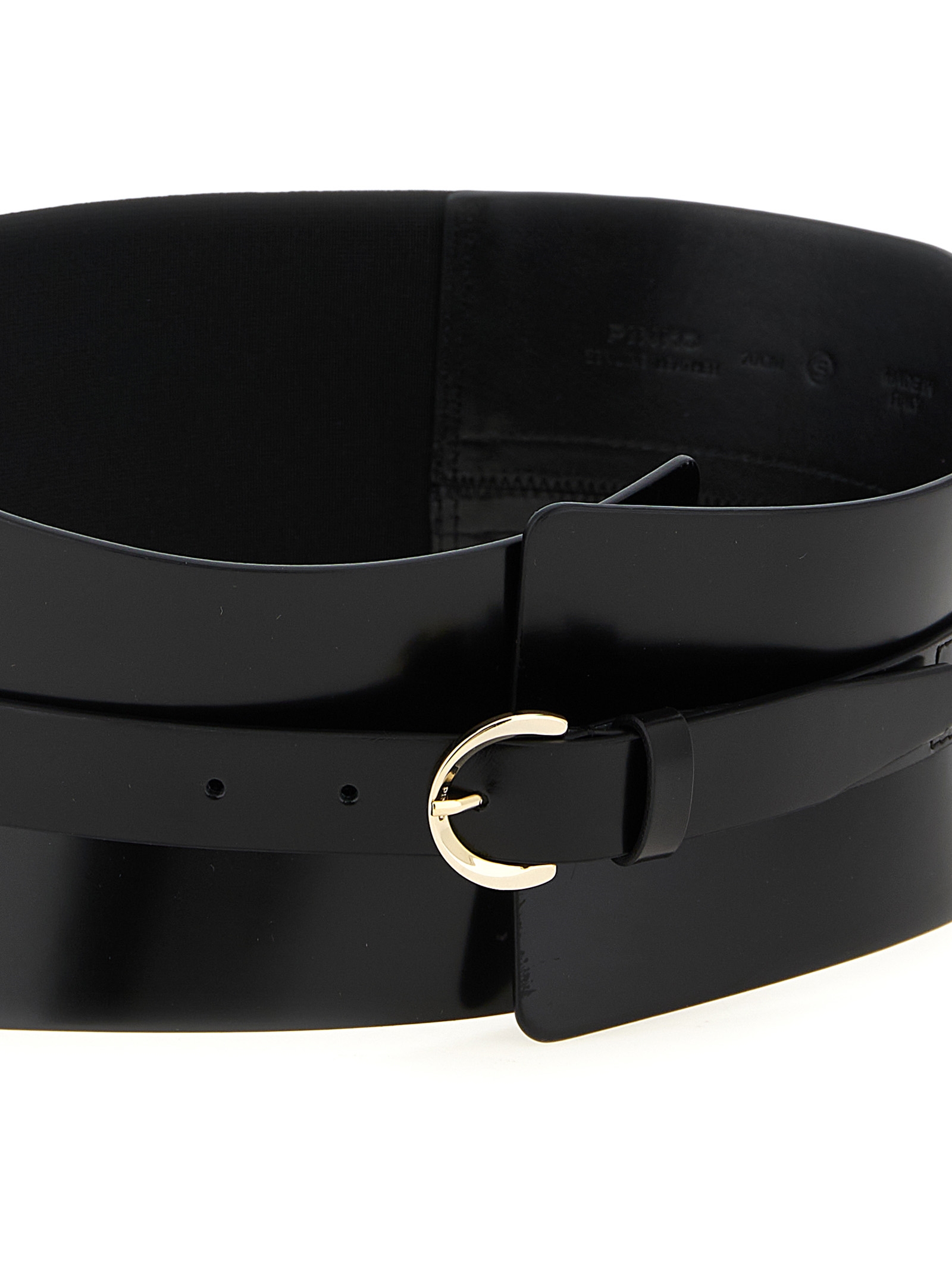 Busset-style elastic belt with buckle, leather inserts, gold metal trim.