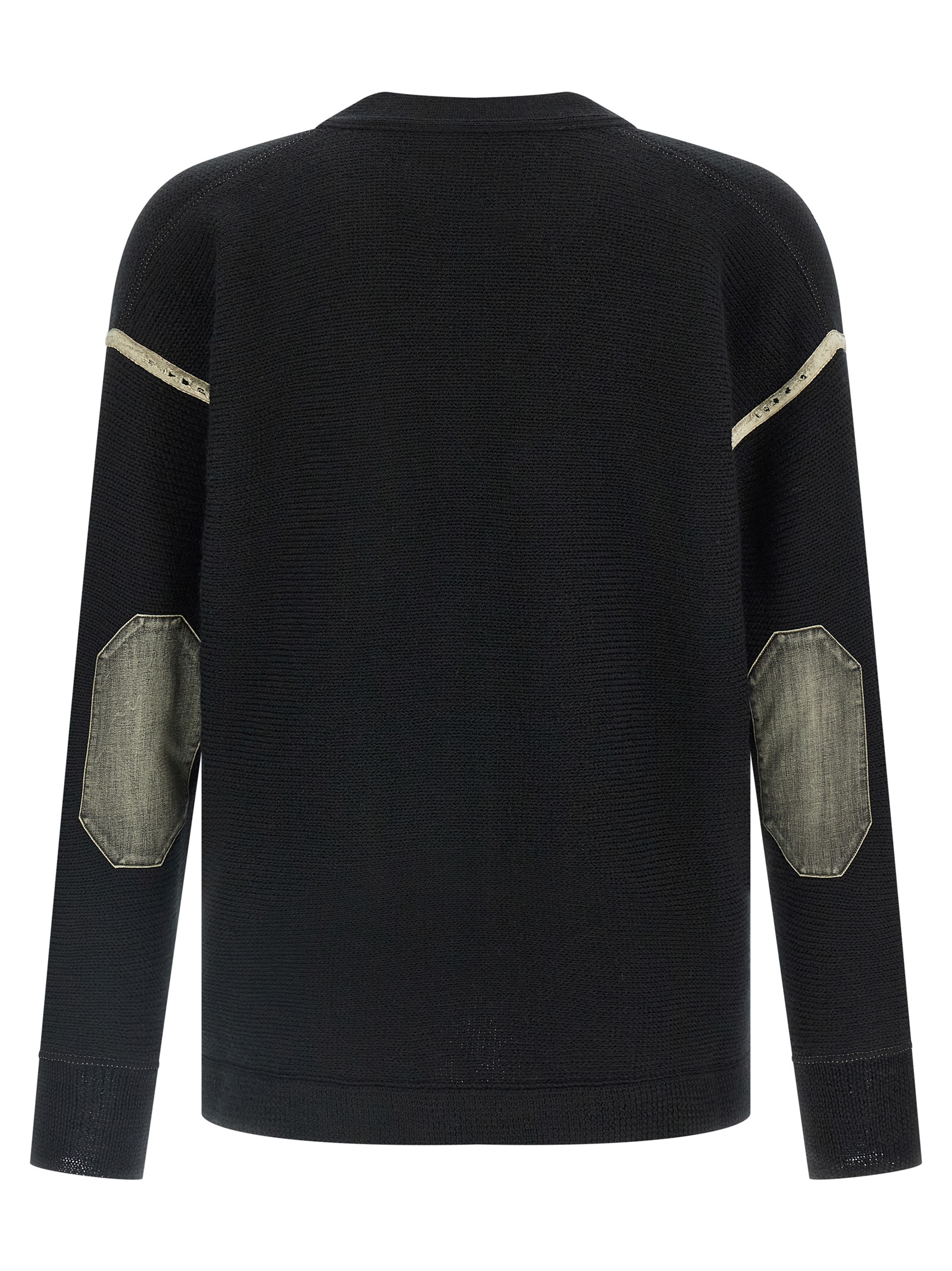 Virgin wool cardigan with V-neck, front button closure, long cuffed sleeves, dropped shoulder, contrasting used-effect cotton detail, and stonewashed cotton denim elbow patch.