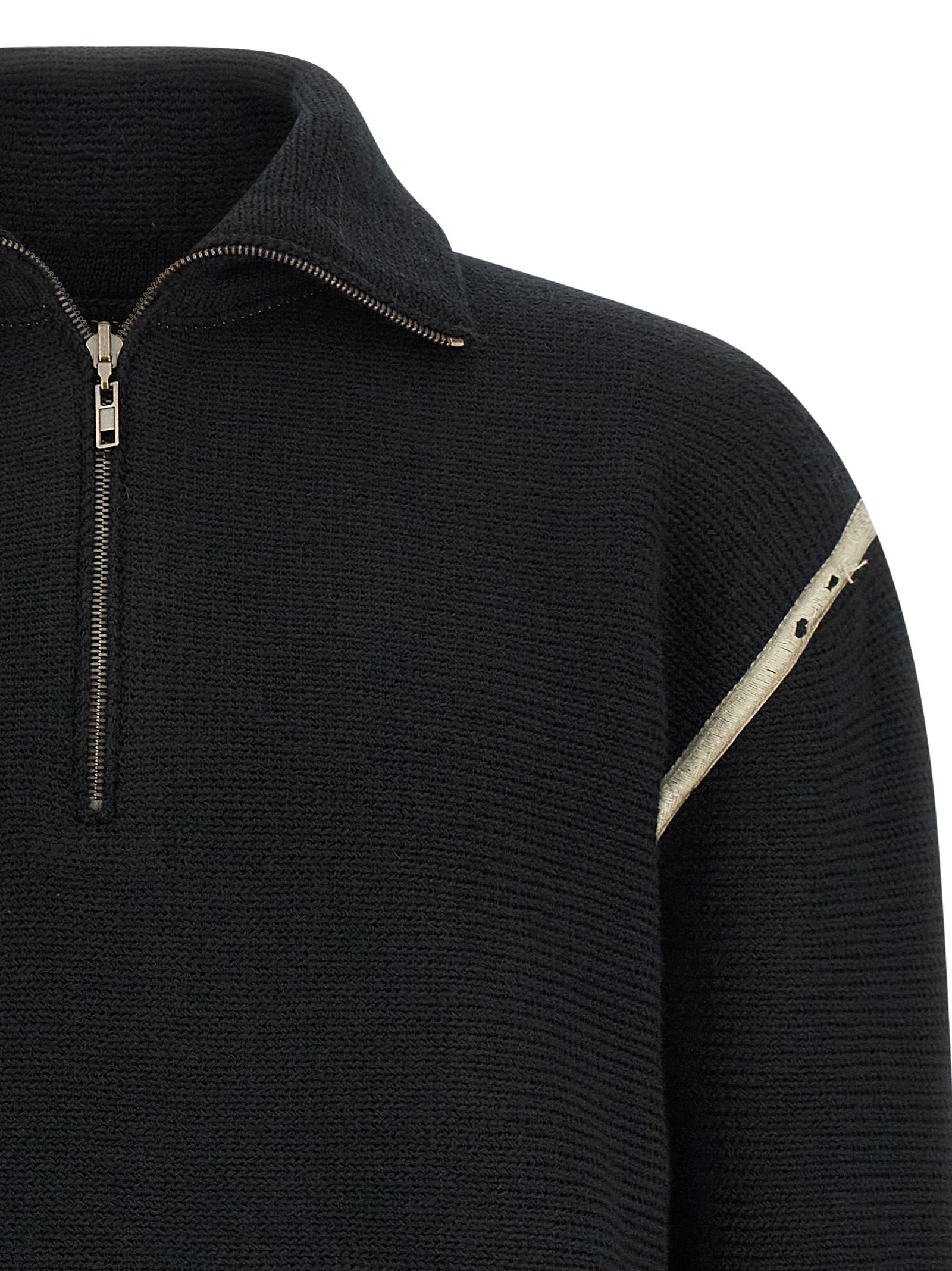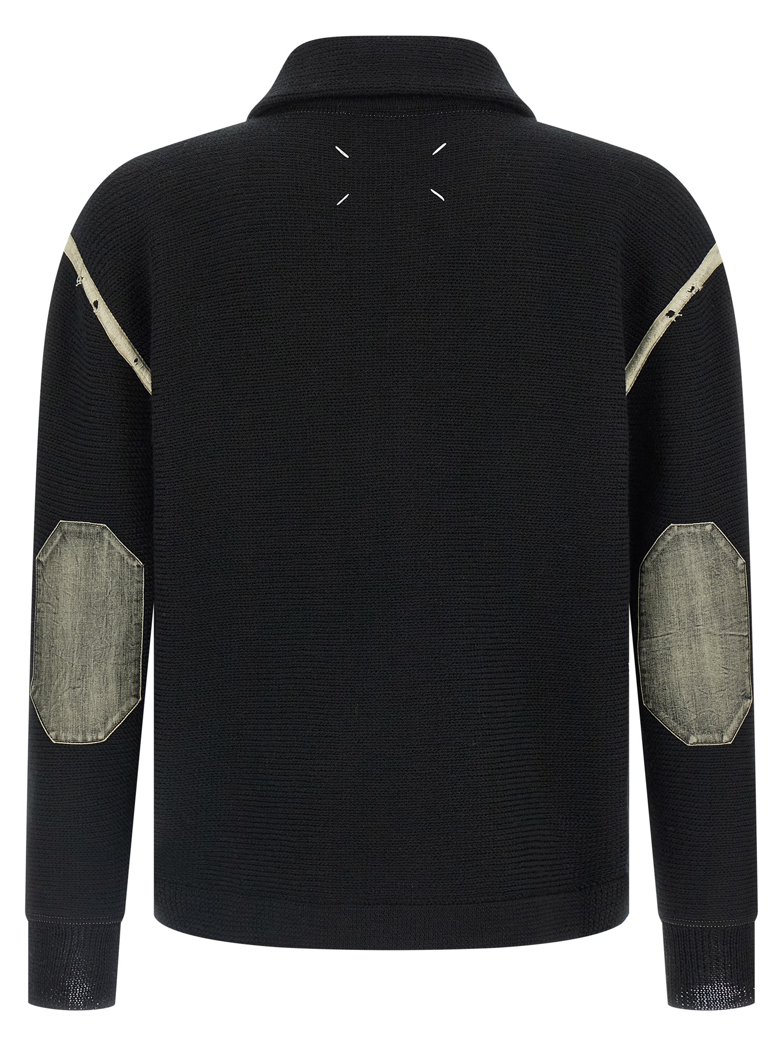 Virgin wool sweater with high neck, half-zip, long cuffed sleeves, dropped shoulders, contrasting used-effect cotton detail and stonewashed cotton denim elbow patch.