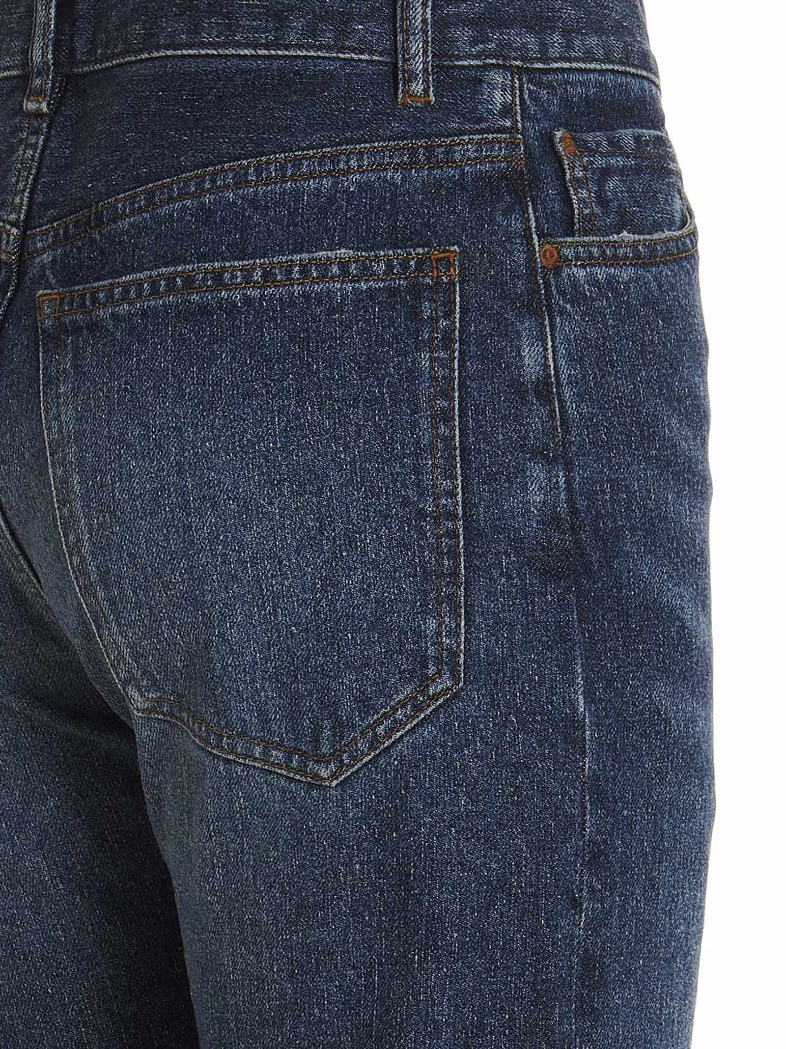 Cotton and hemp blend denim jeans with logo embroidery at the waist, a button closure, five pockets and used-effect details.