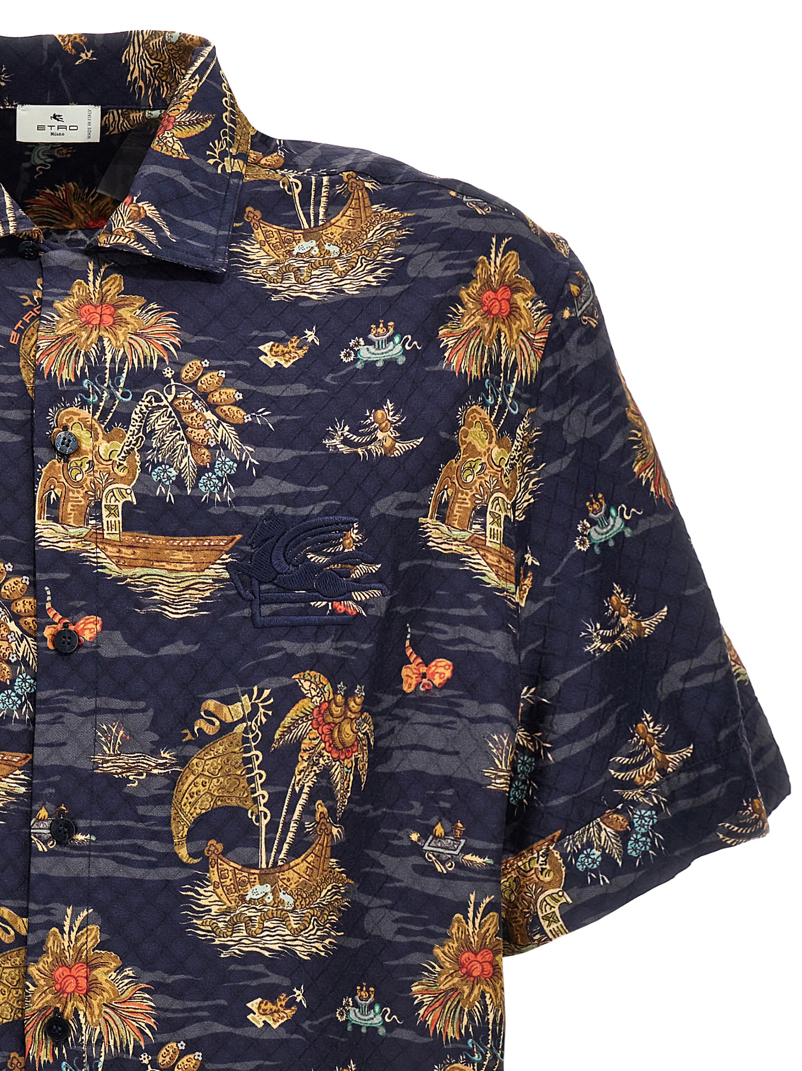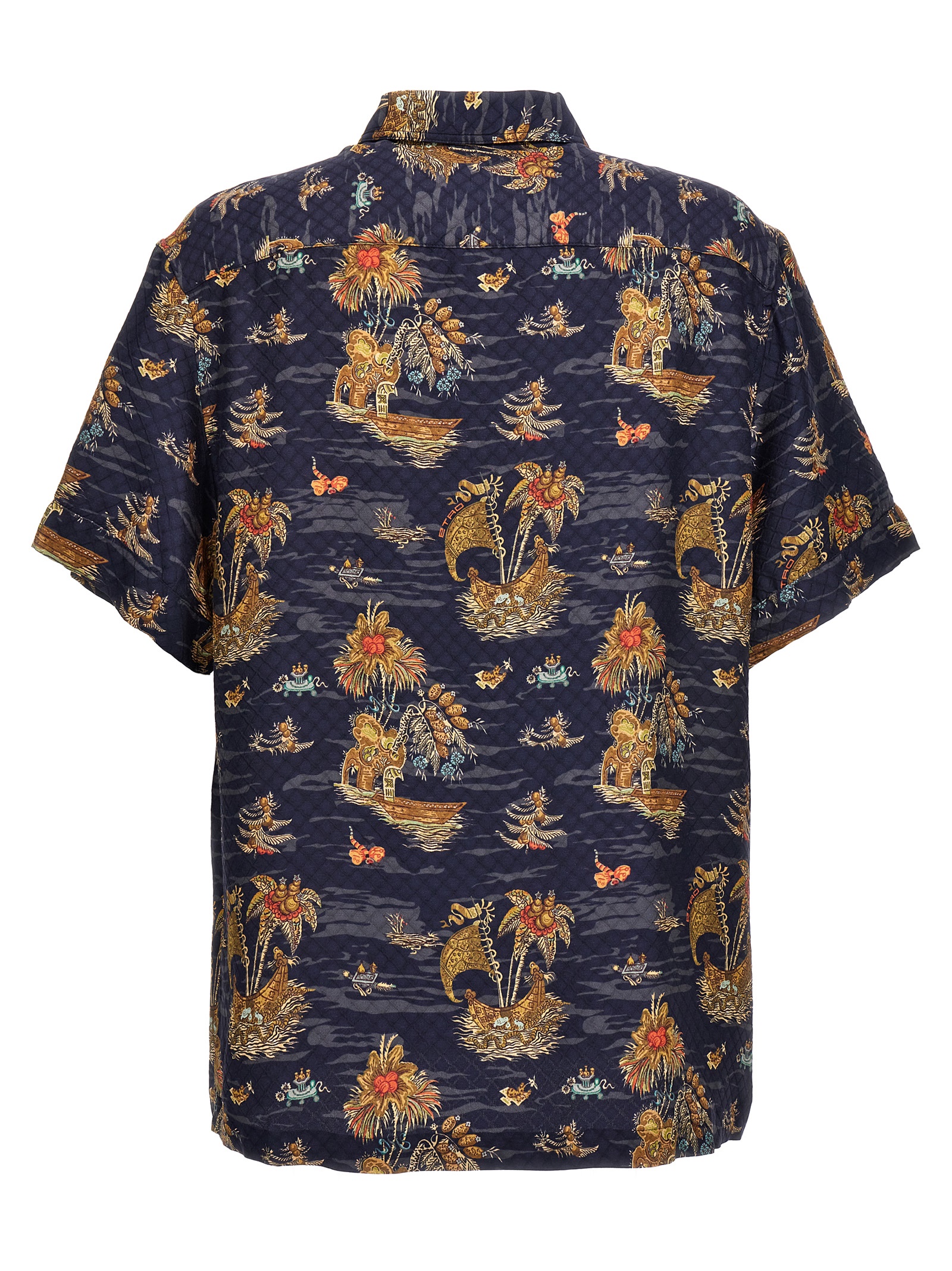 Silk shirt with all-over print, front embroidered logo, button closure, and short sleeves.