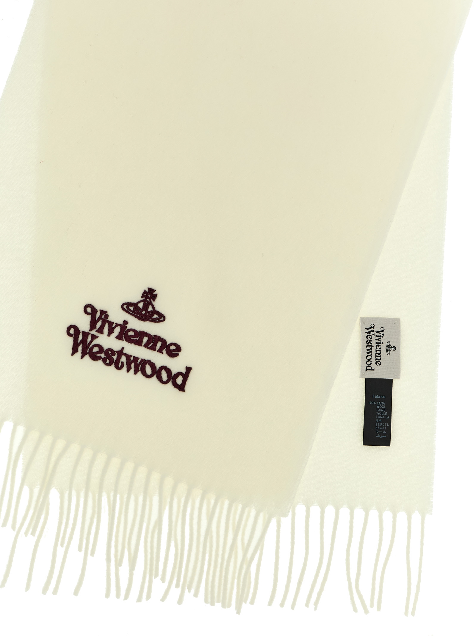 ‘Embroidered’ fine-weave wool scarf, contrasting logo embroidery, fringed edges.
