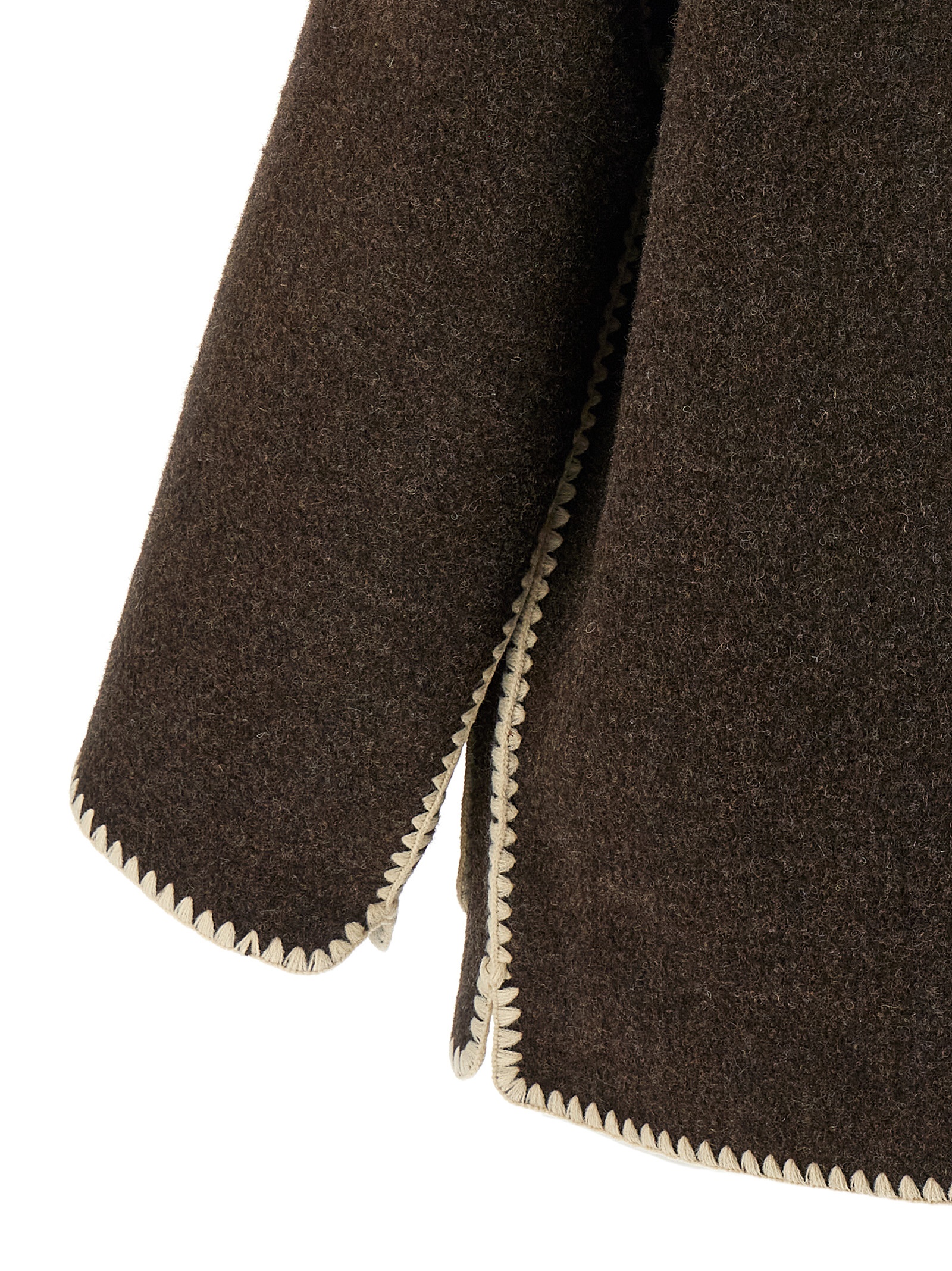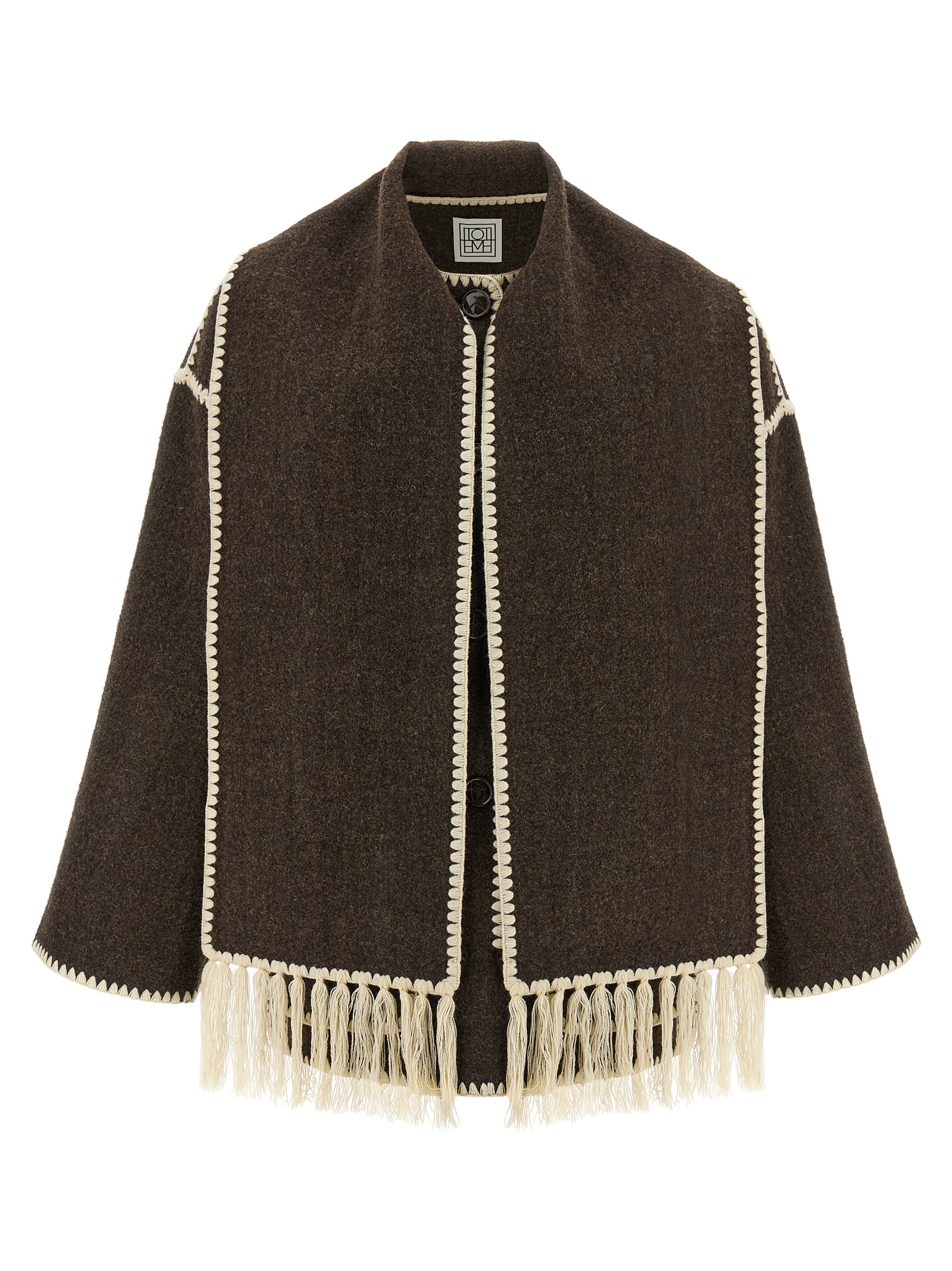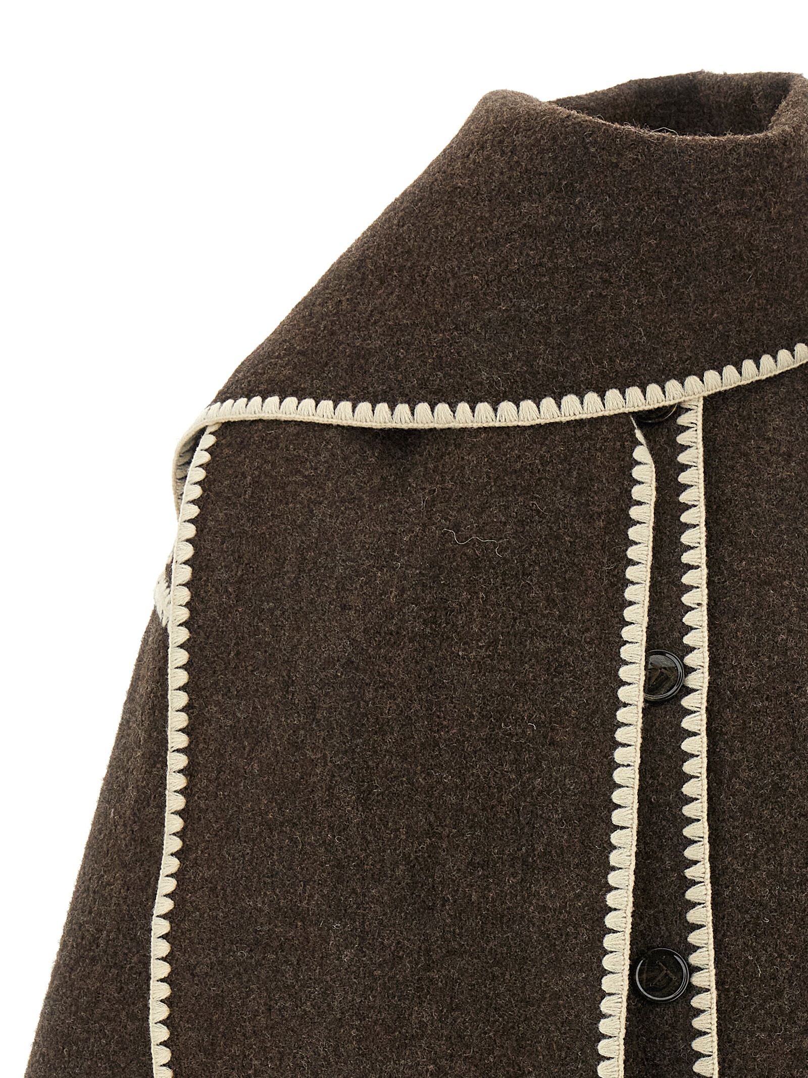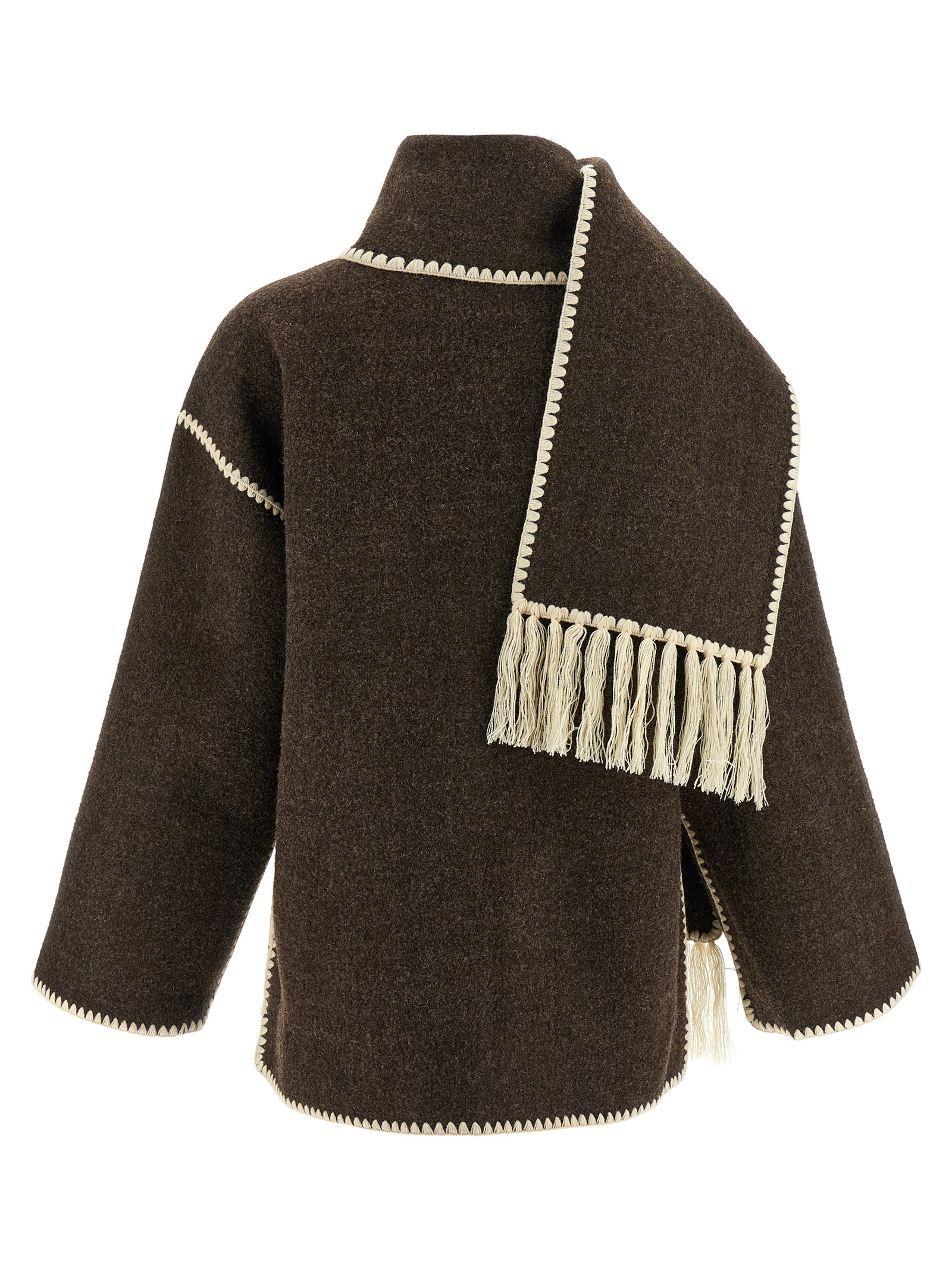 ‘Embroidered Scarf Jacket Harvest’ wool blend coat with button closure, pockets, long and wide sleeves, scarf to tie around the neck.