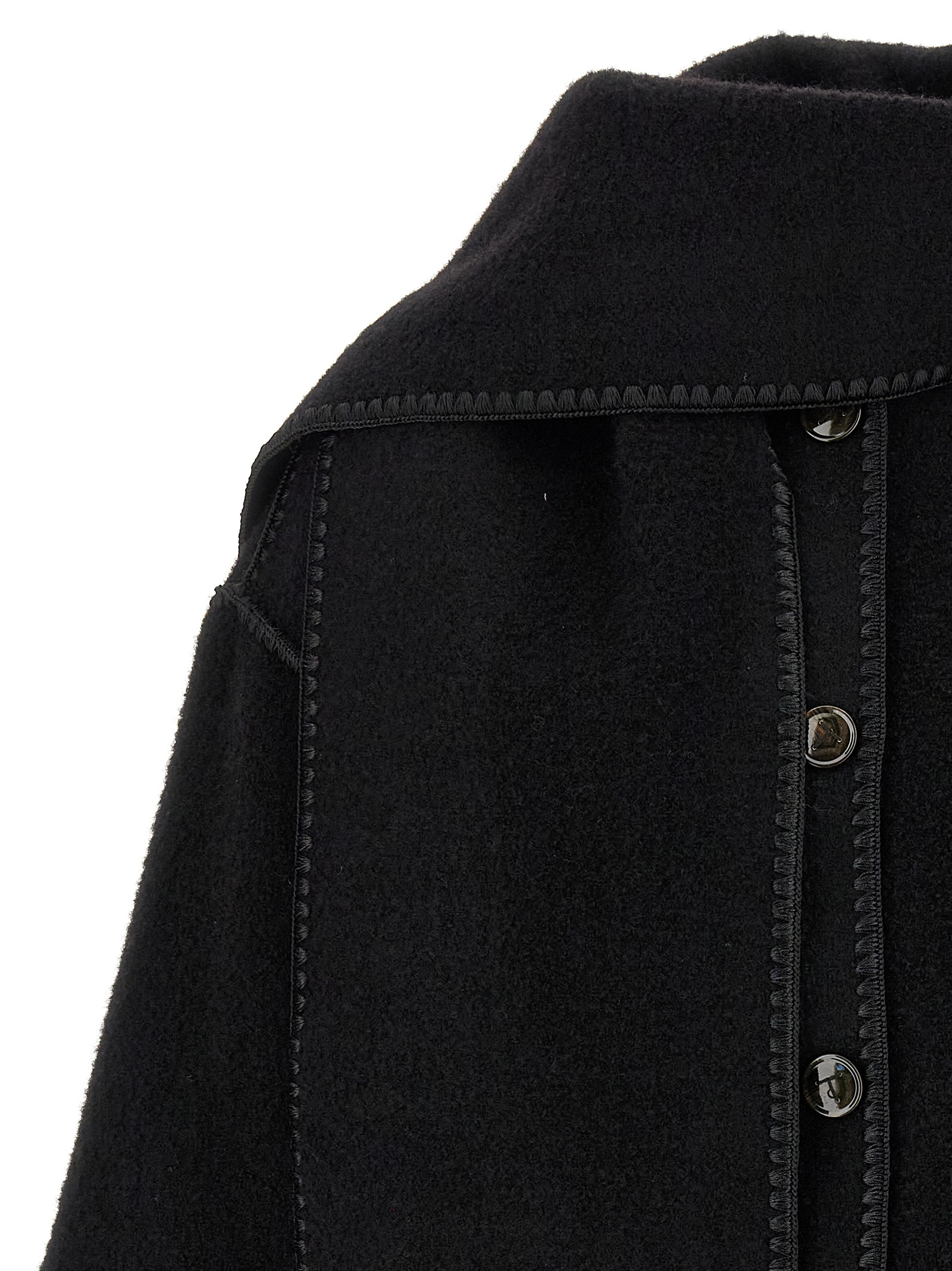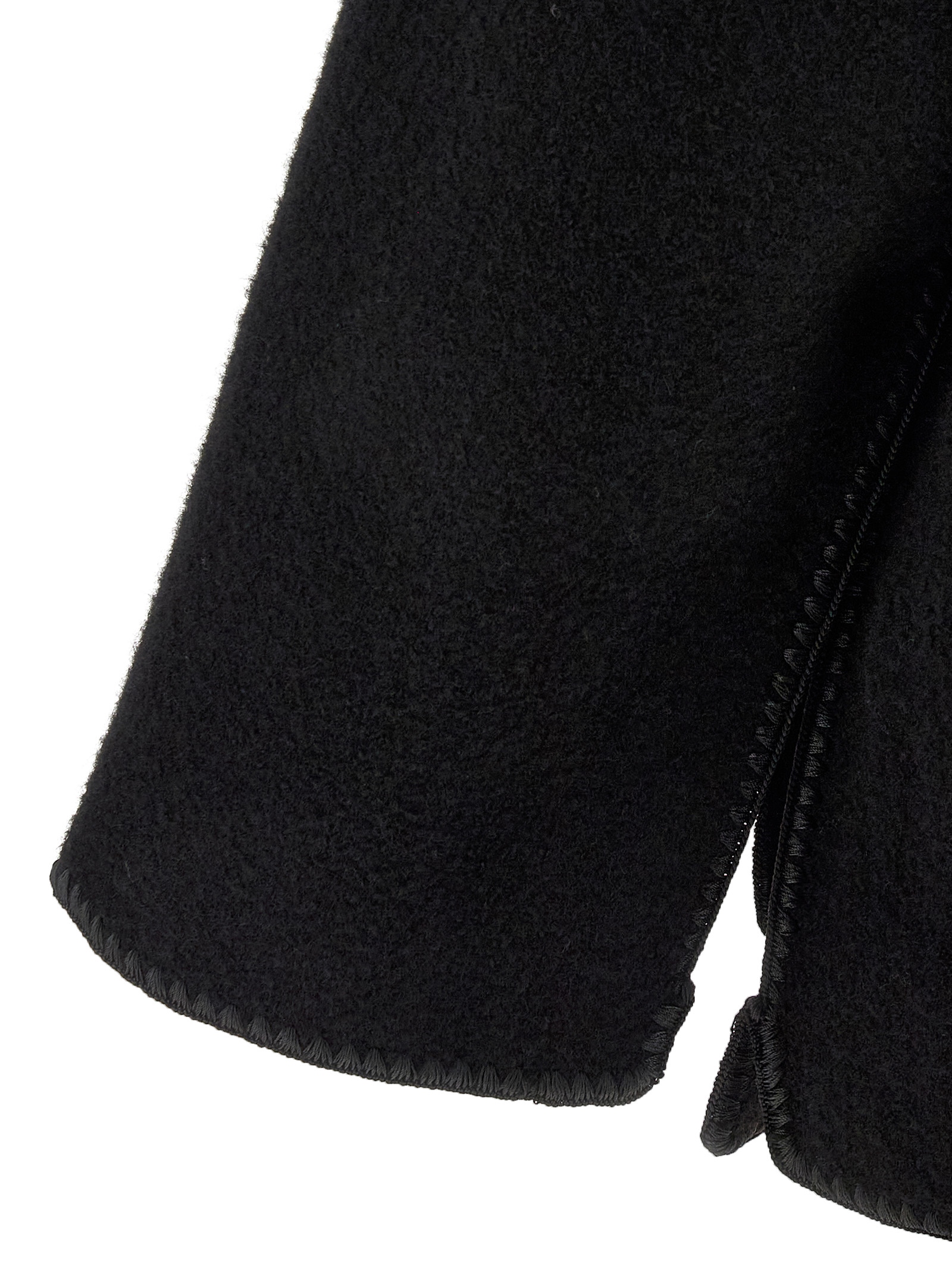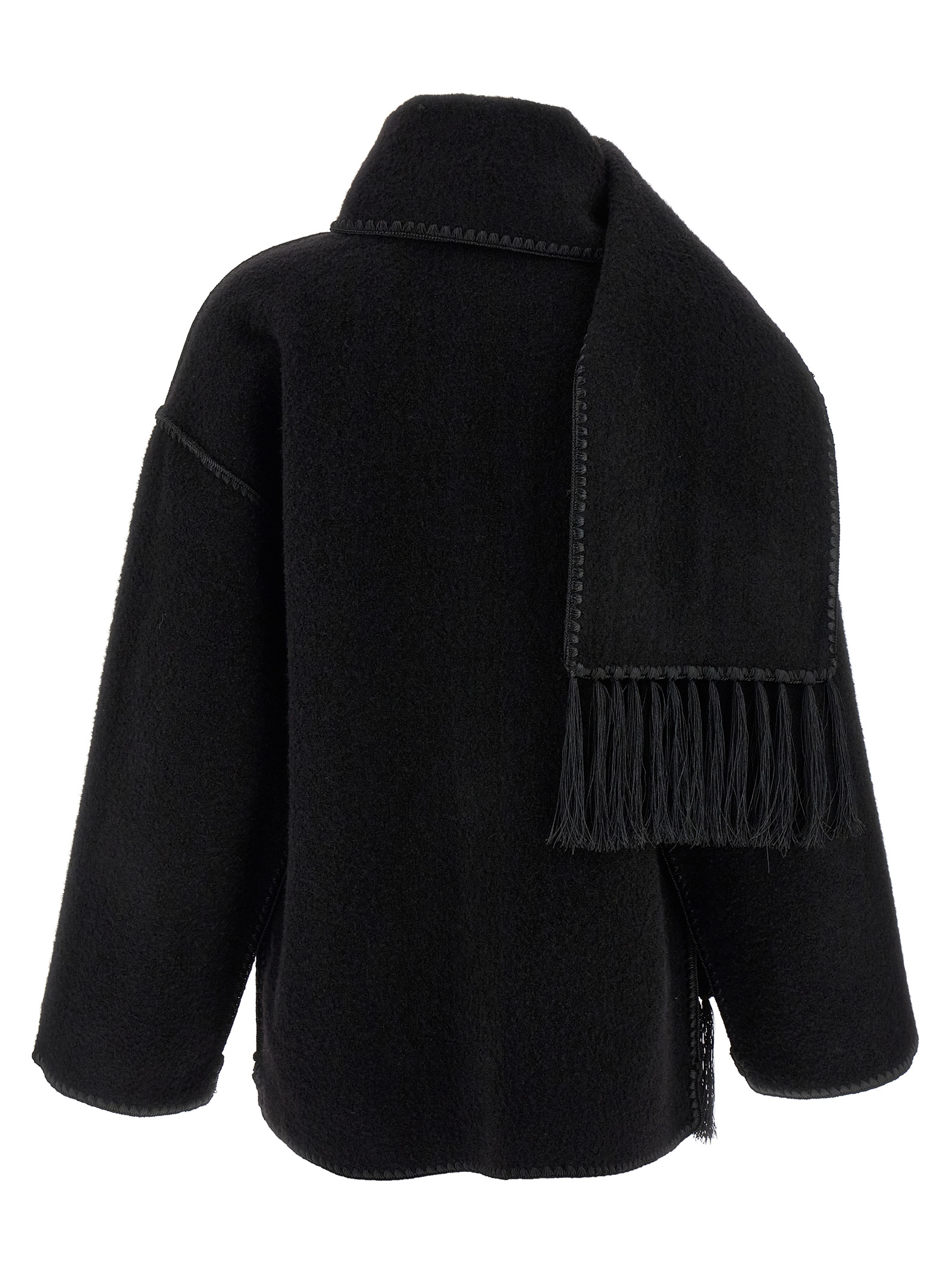 ‘Embroidered Scarf Jacket Harvest’ wool blend coat with button closure, pockets, long and wide sleeves, scarf to tie around the neck.