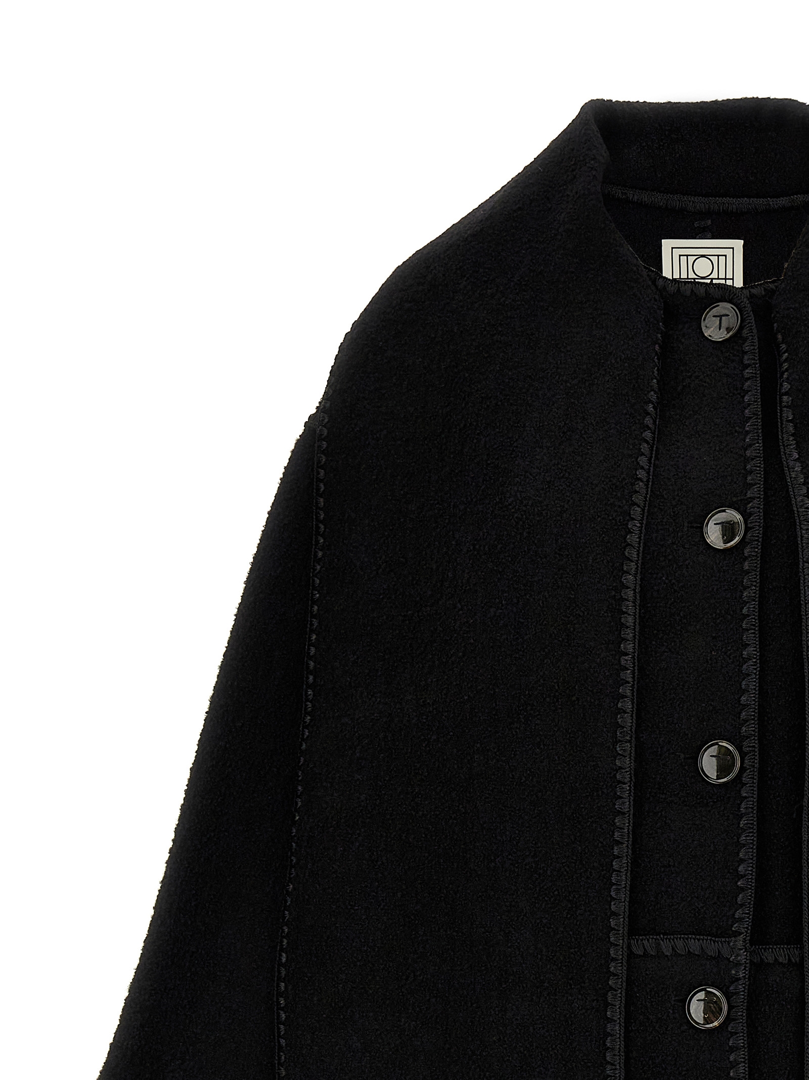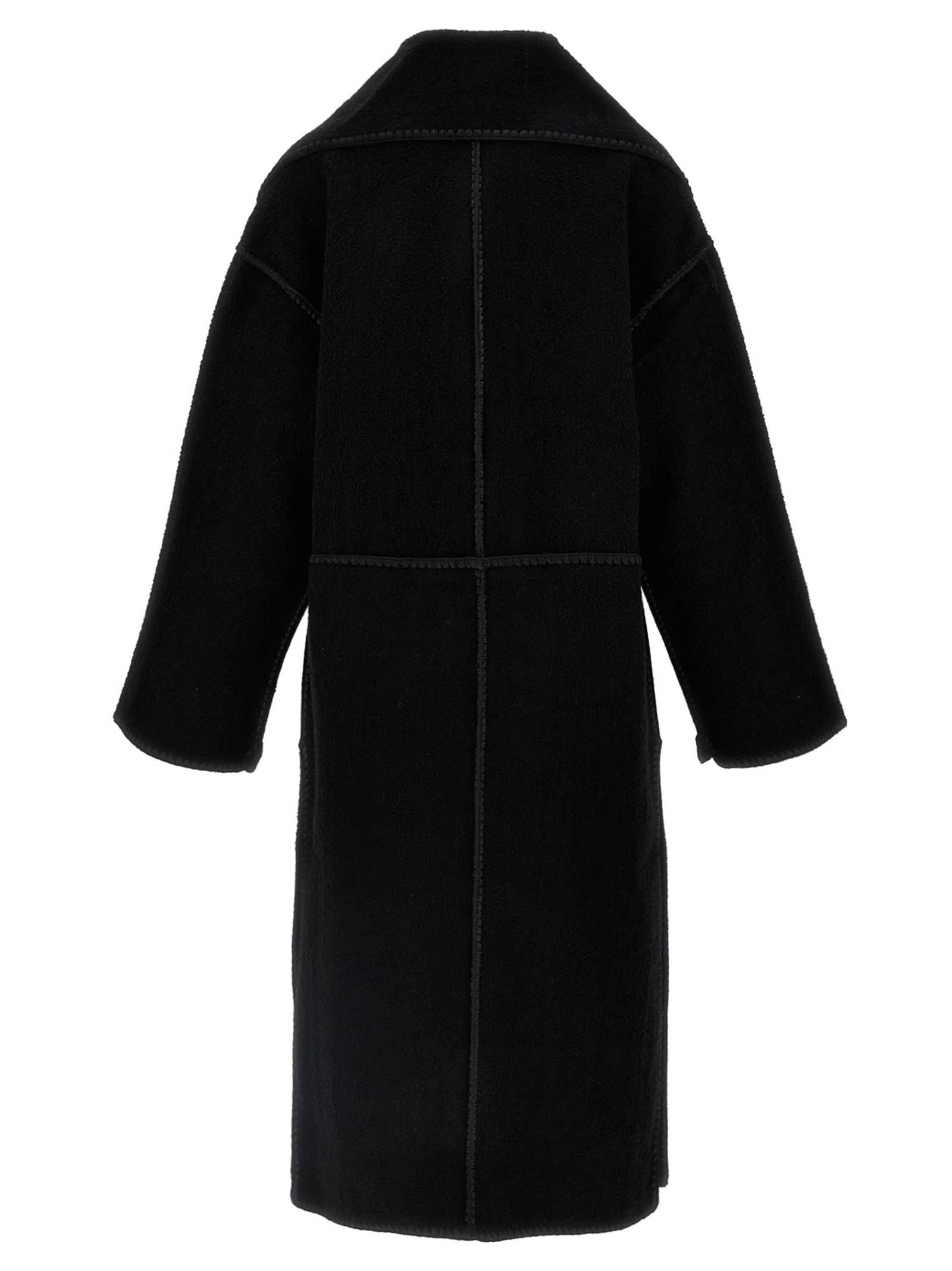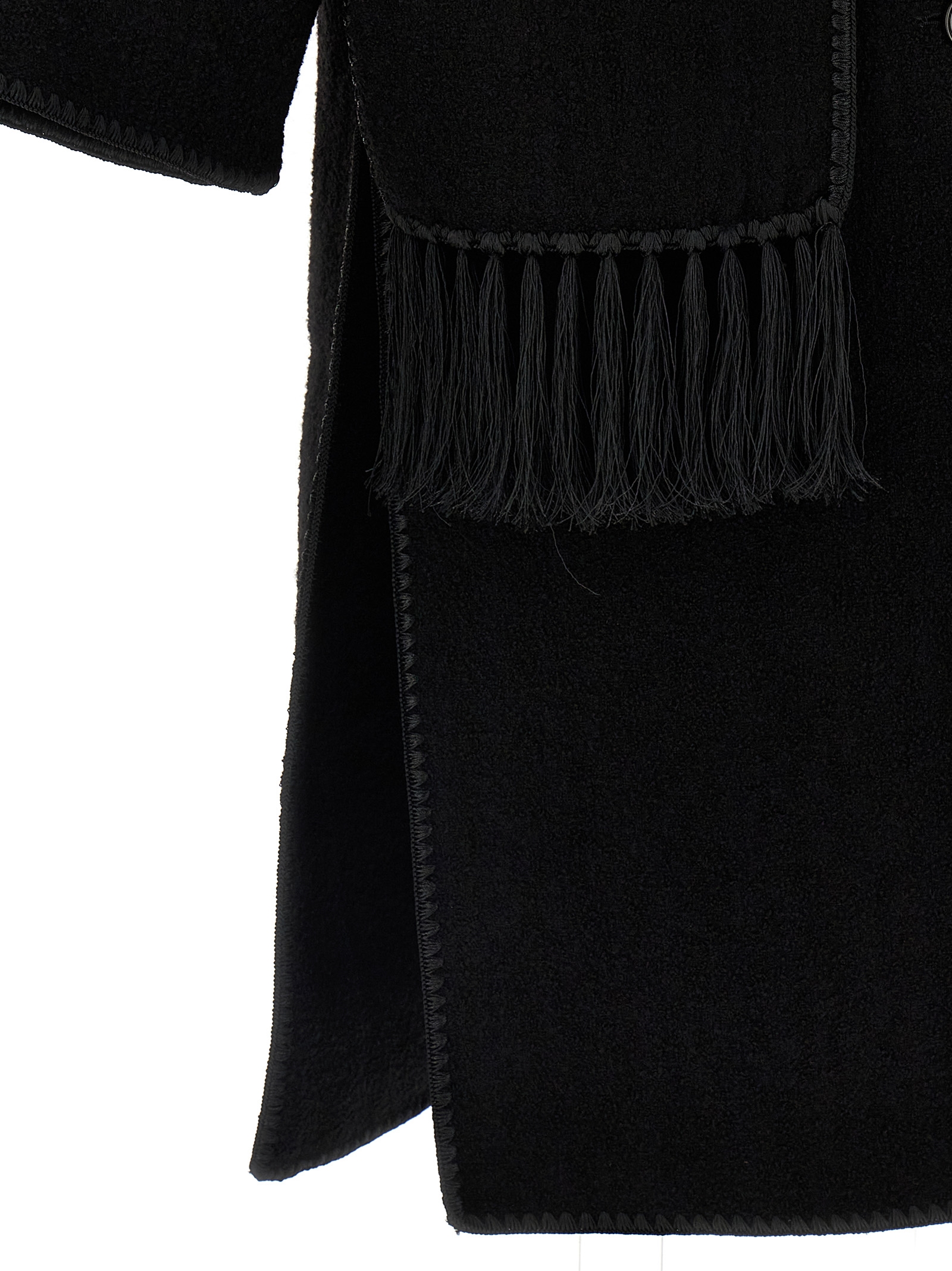 Long ‘Embroidered Scarf Jacket Harvest’ wool blend coat with button closure, pockets, long and wide sleeves, scarf to tie around the neck.