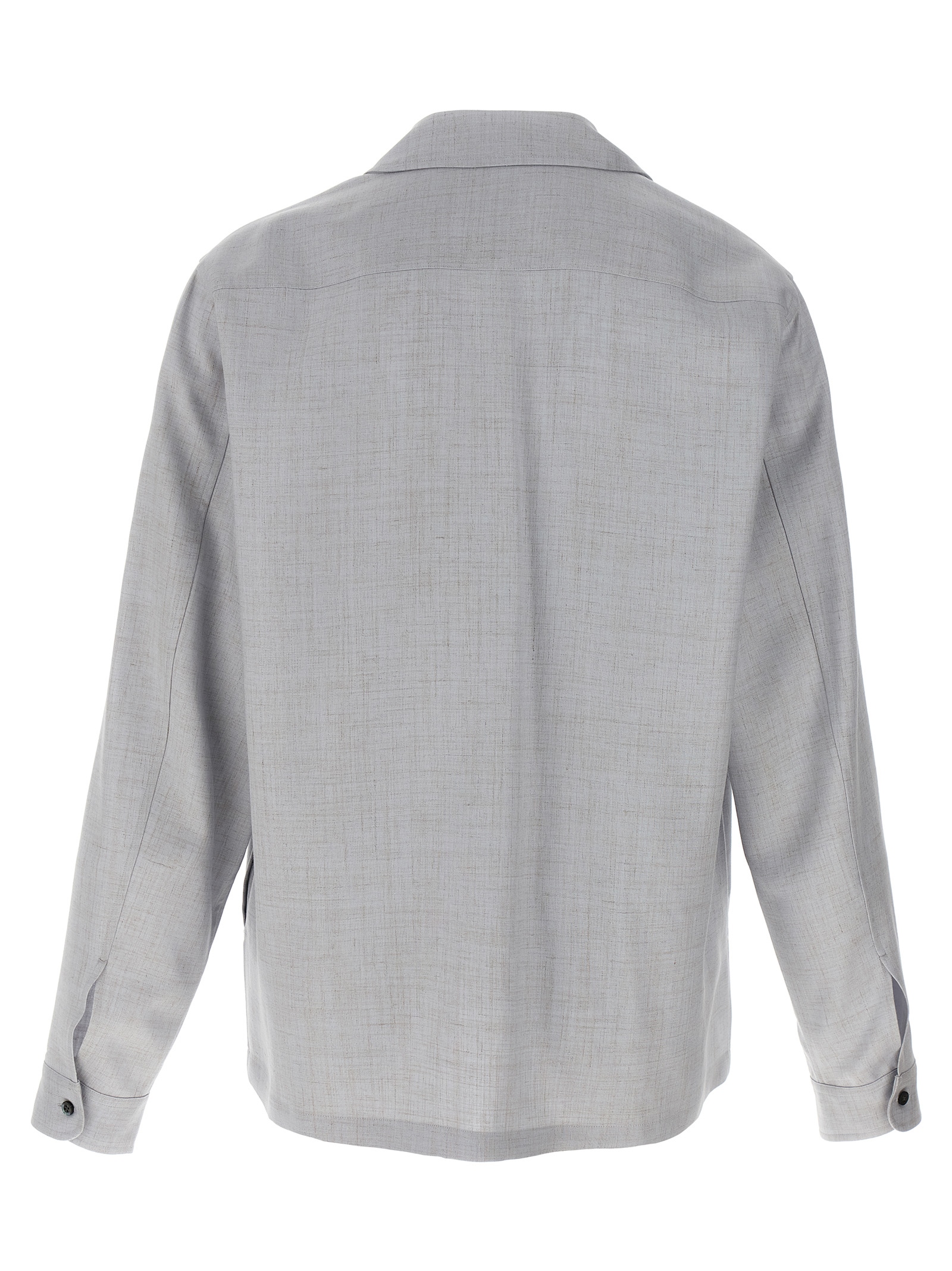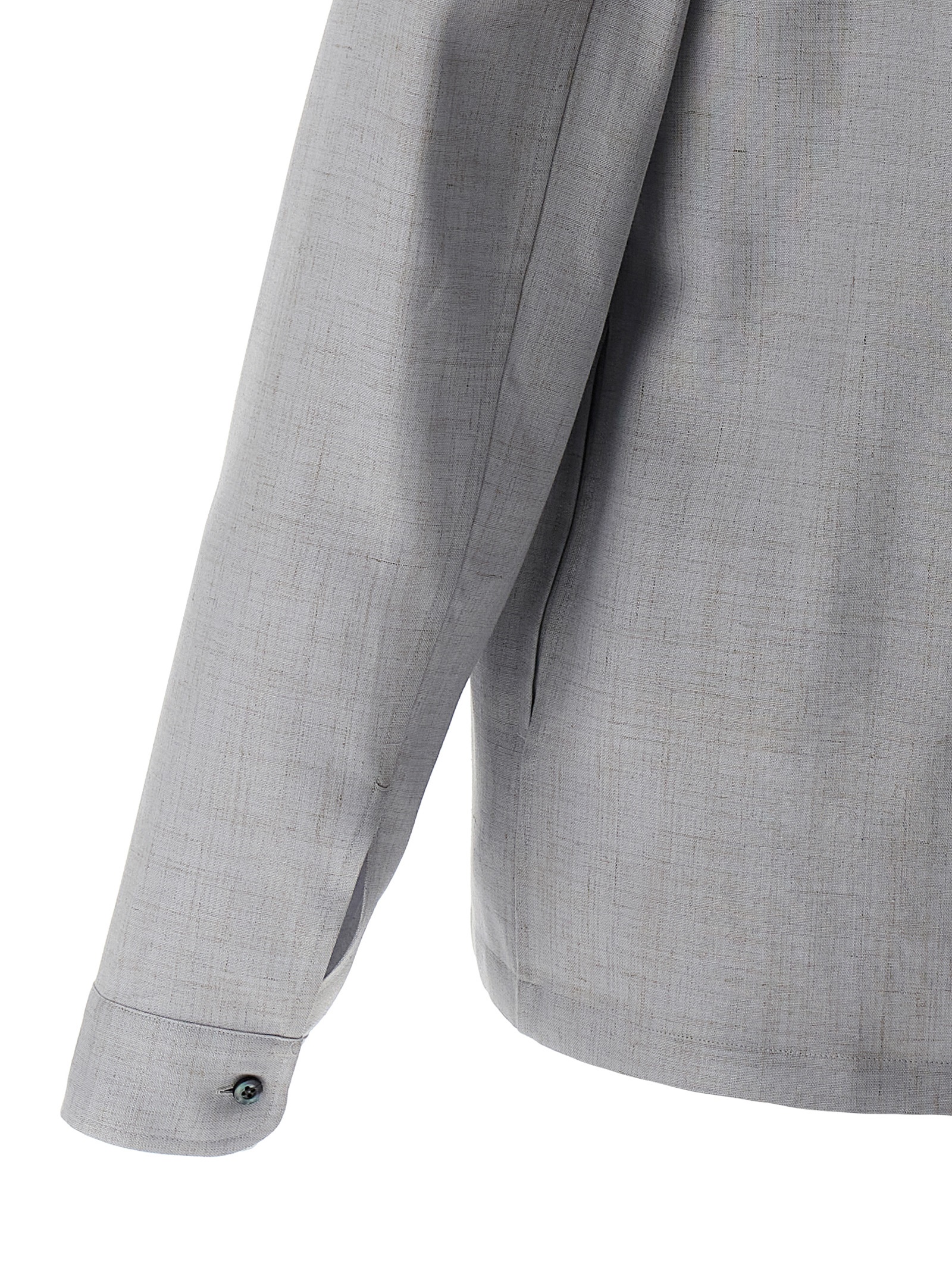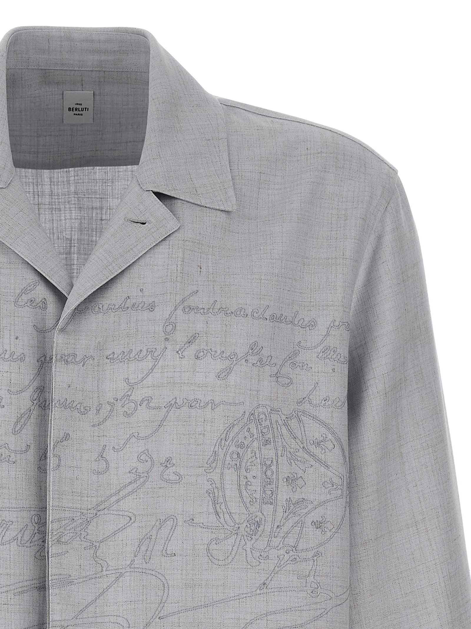 Viscose and linen blend overshirt with front ‘Embroidered Scritto’ embroidery, front button closure, long cuffed sleeves.