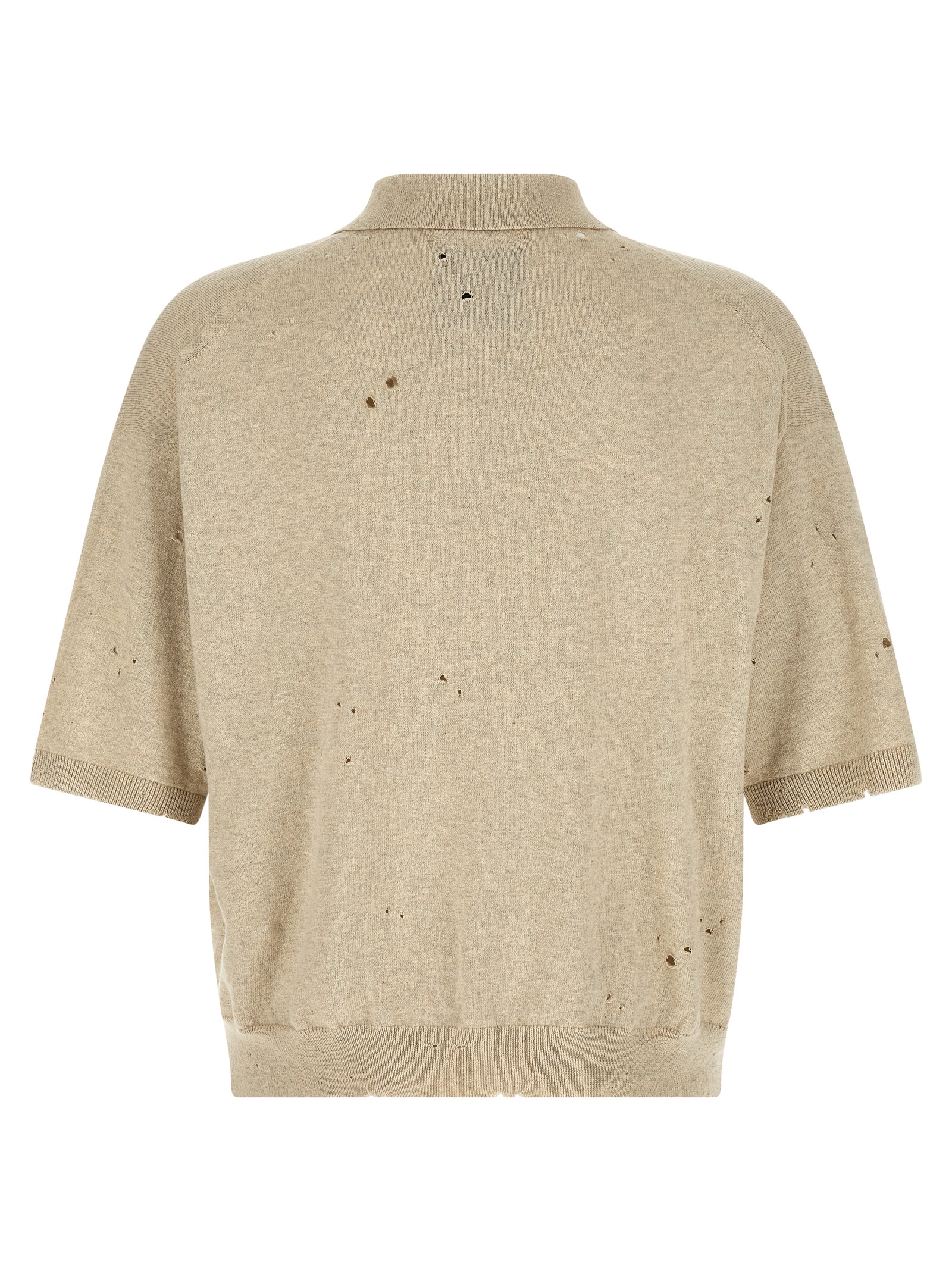 Used-effect cotton polo shirt with small holes, embroidery and front logo patch, open collar, short sleeves with cuffs and dropped shoulder, and headband on the hem.