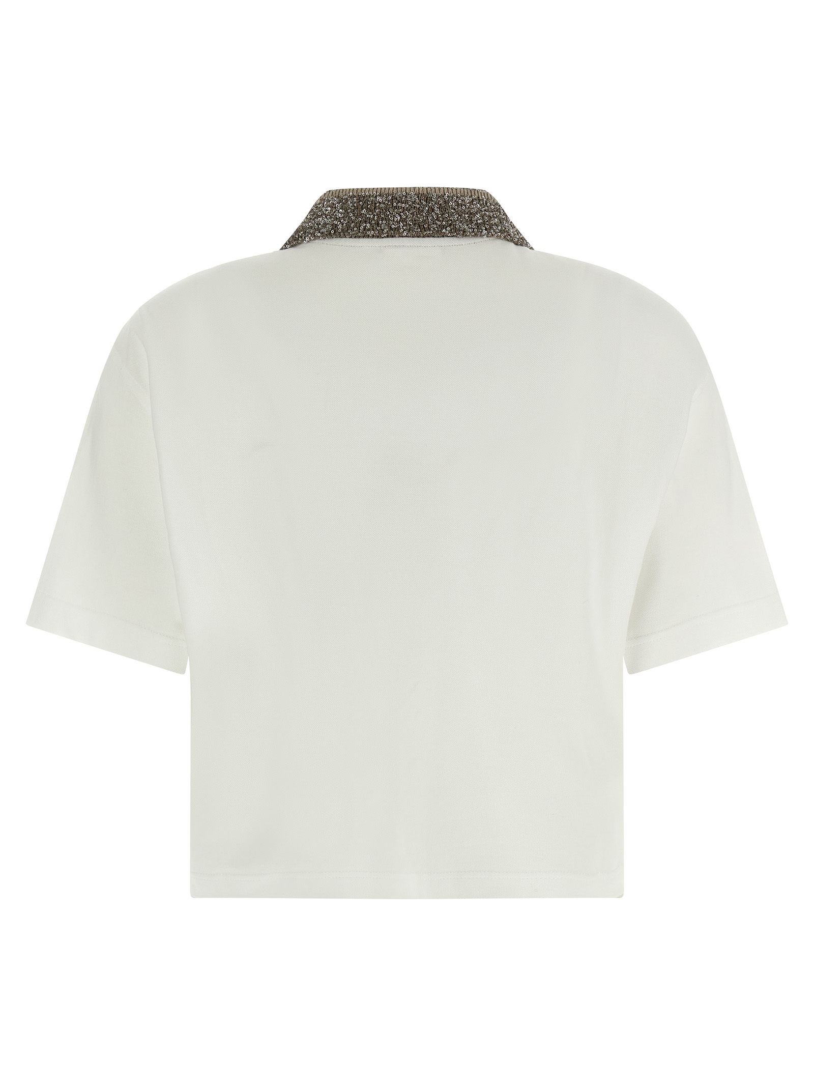 Piqué cotton polo shirt, contrast knit collar, ribbed knit with all-over microsequin embroidery, 3-button front closure, slightly cropped design, short sleeves