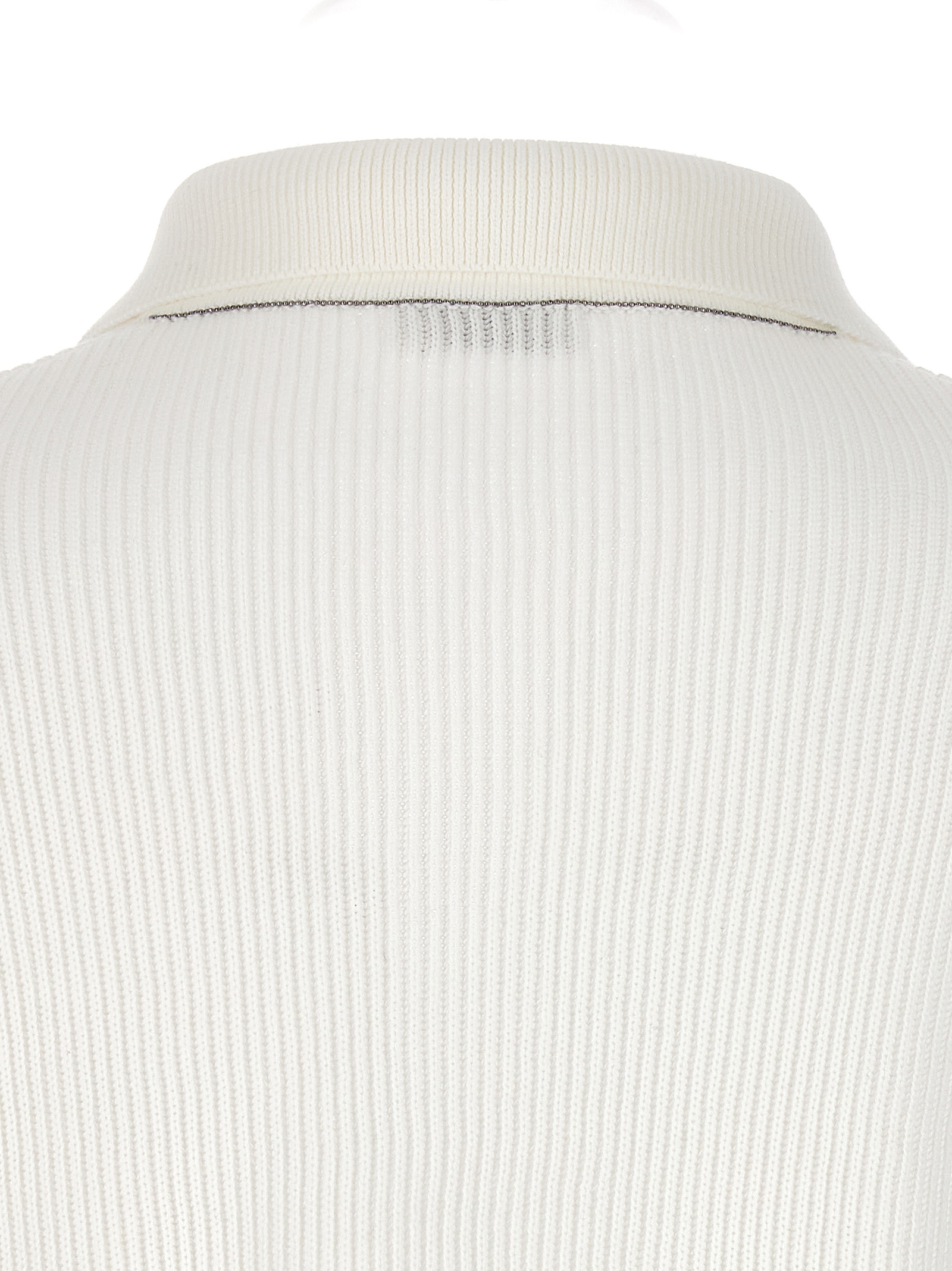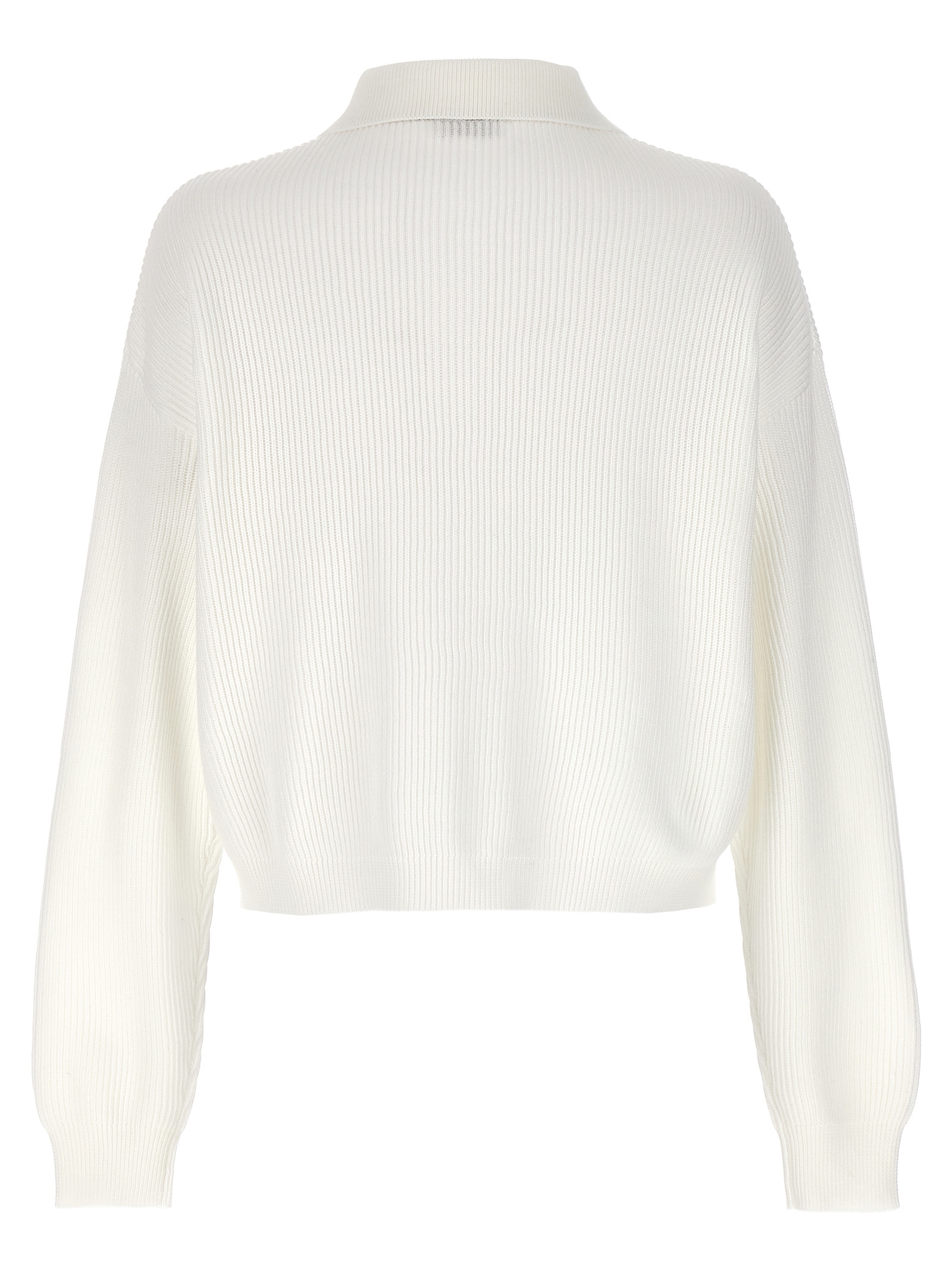 English rib knit cotton polo shirt, collar and buttons, Monile detail on the back, long sleeves with cuffs and dropped shoulders.