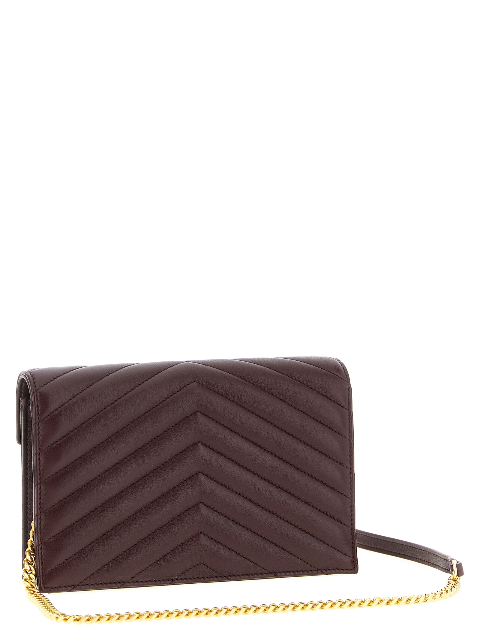 ‘Envelope Cassandre’ wallet on chain in chevron quilted leather, flap closure with snap button, front metal logo, removable chain shoulder strap.