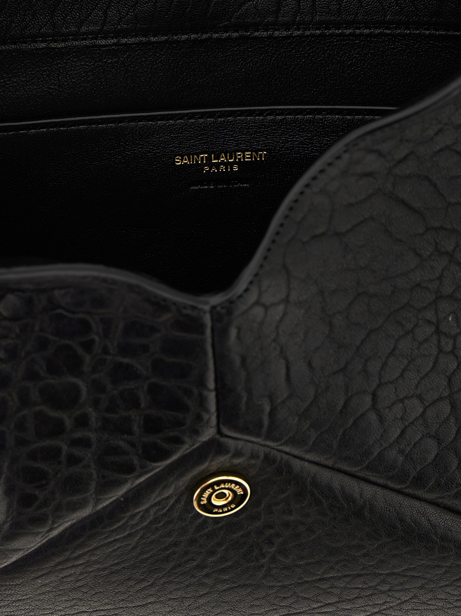 ‘Envelope’ large lambskin clutch bag with magnetic flap closure with metal Cassandre logo applied on the front, origami structure.