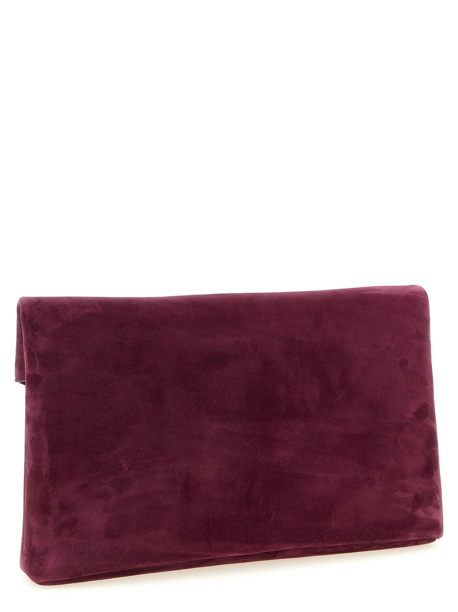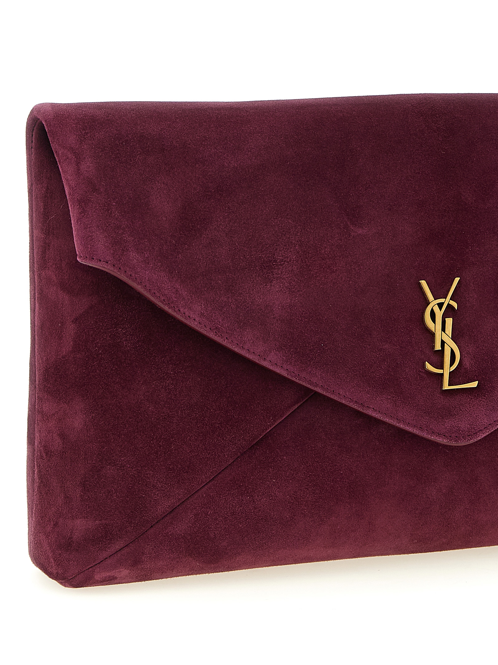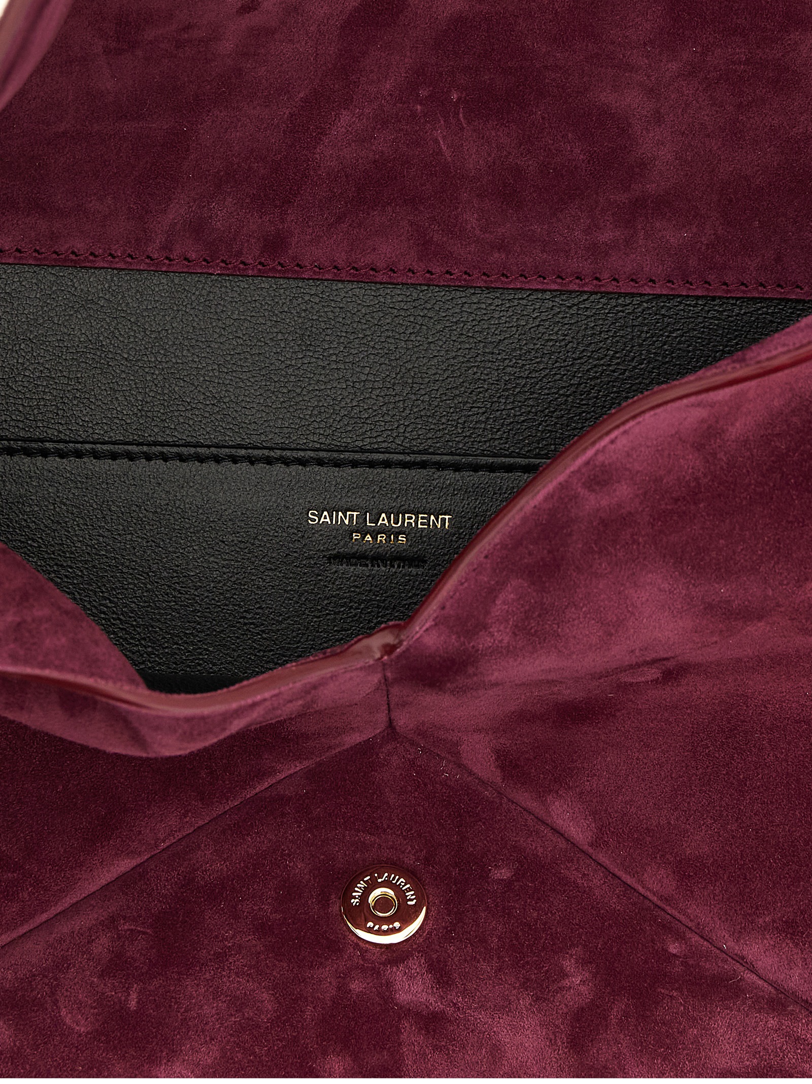 Maxi ‘Envelope’ suede clutch bag with magnetic flap closure with metal Cassandre logo applied on the front, cotton lining.