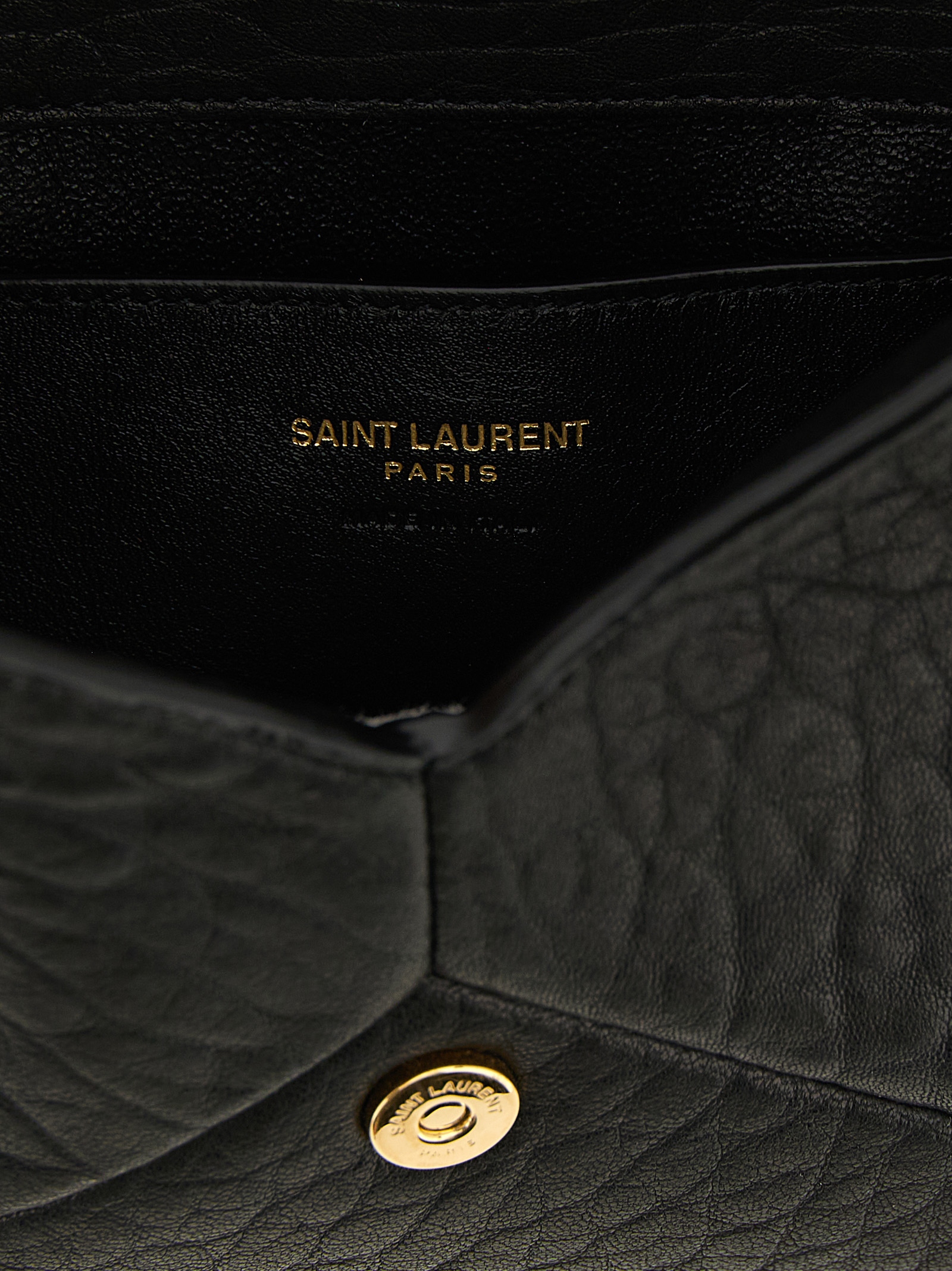 ‘Envelope’ embossed leather mini crossbody bag, flap closure with snap button and brass ‘Cassandre’ logo on the front, envelope structure, chain shoulder strap with leather protection.