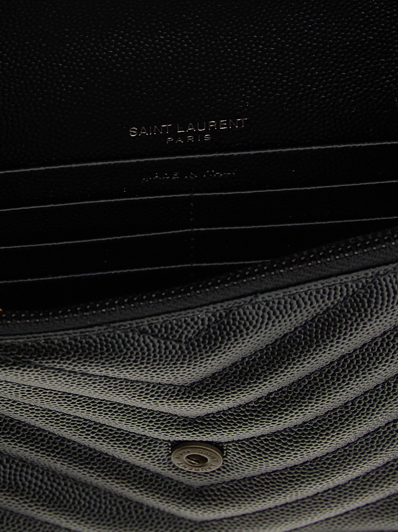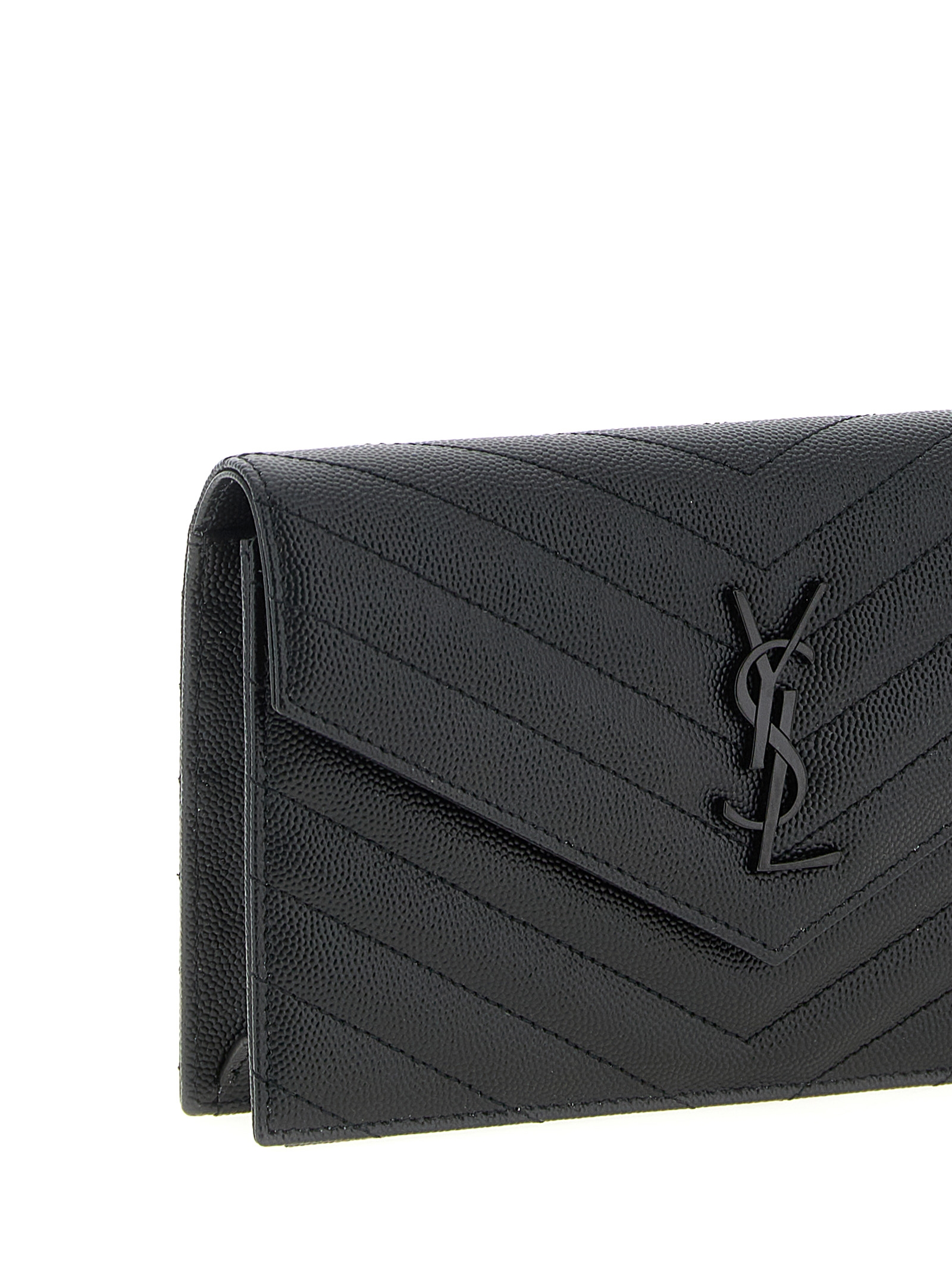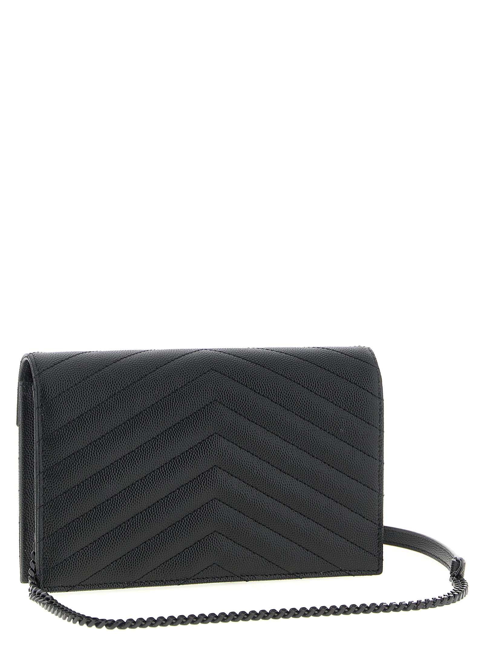 ‘Envelope’ wallet on chain in quilted grain de poudre leather with chevron pattern, flap closure with snap button and tone-on-tone metal Cassandra logo on the front, Cassandra chain shoulder strap with removable leather protection.