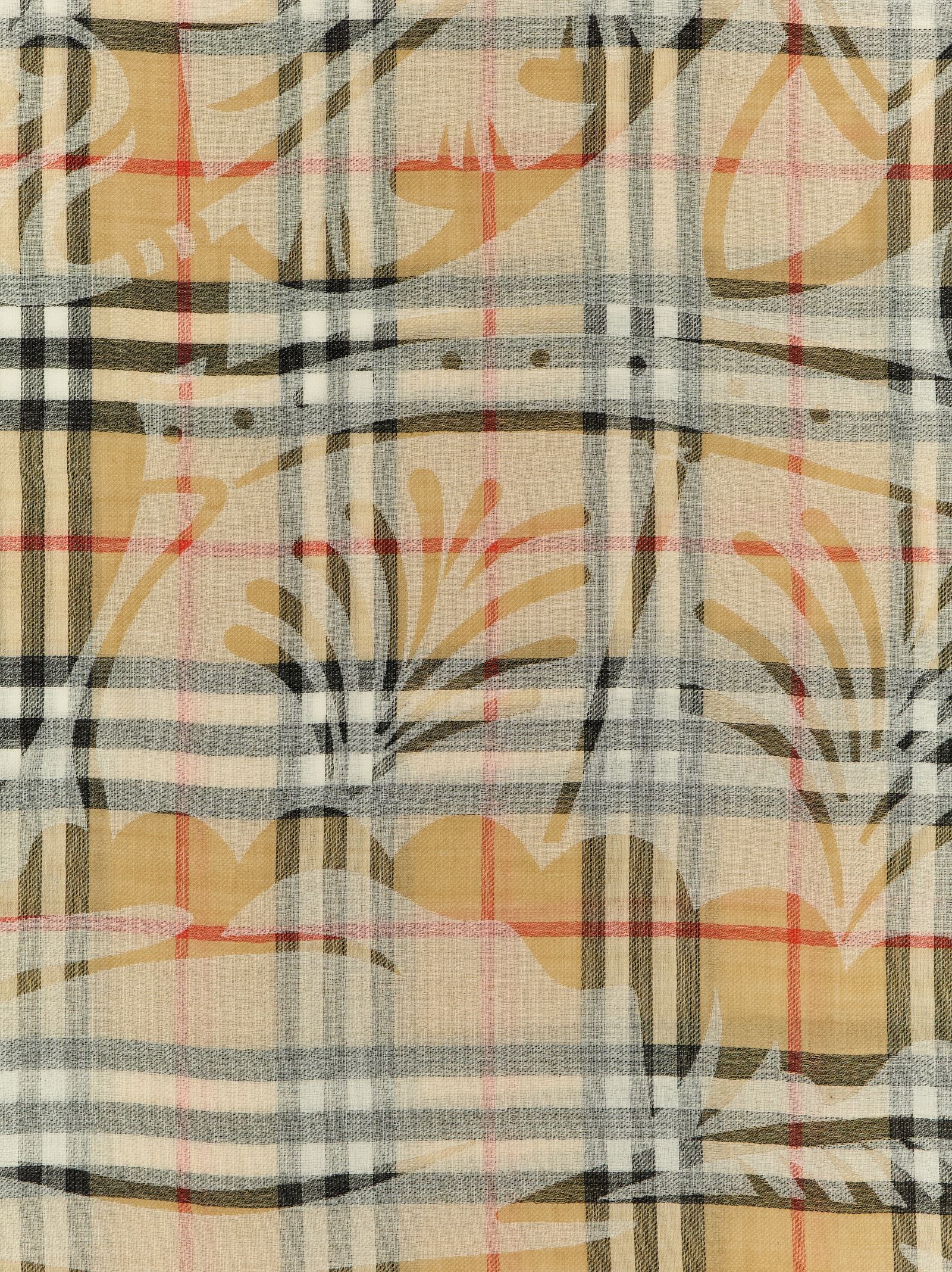 Mulberry wool and silk blend scarf woven in Burberry Check with jacquard ‘Equestrian Knight Design’ and fringed edges.