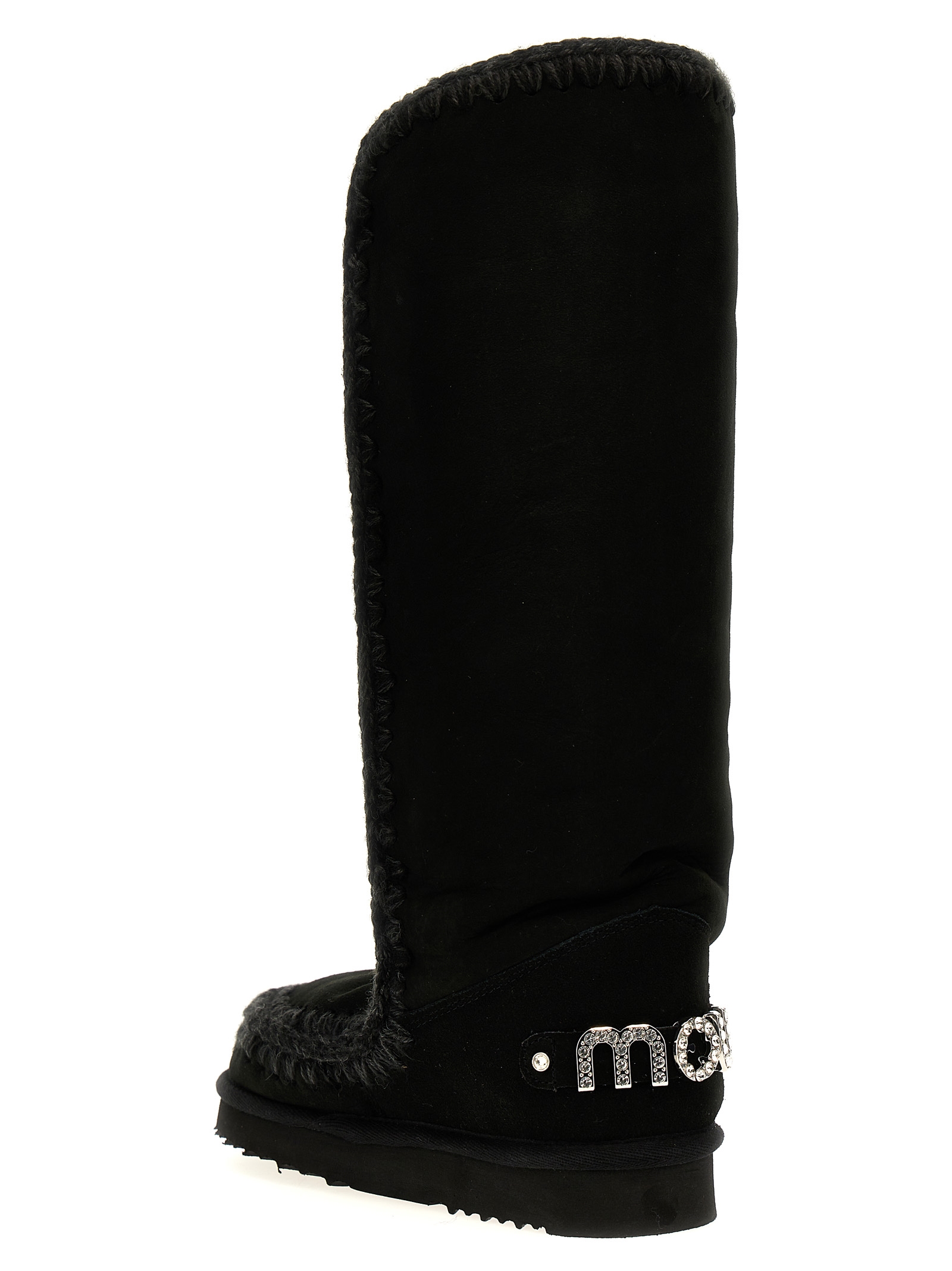Suede ‘Eskimo 40 Rhinestone Logo’ boots with visible stitching, fur lining, rubber sole, and back logo.