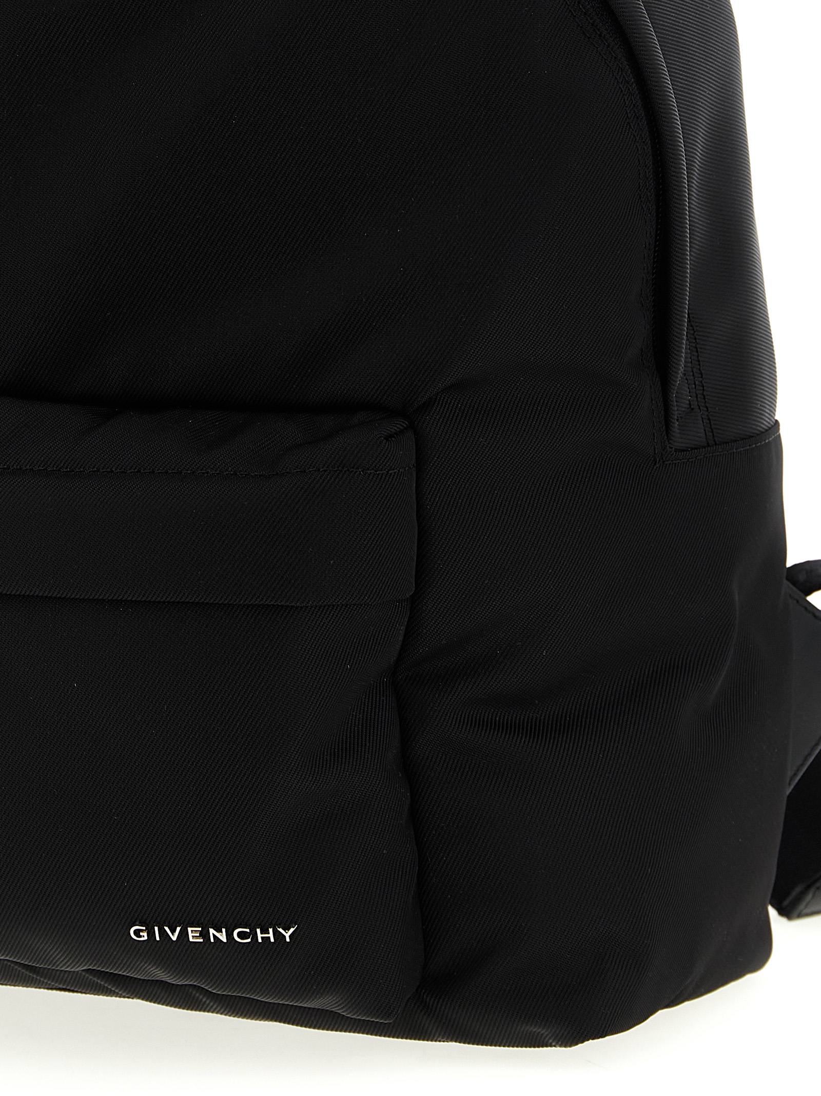 ‘Essential’ fabric backpack, fixed handle, top zip closure, front zip pocket and embossed logo, adjustable shoulder straps.