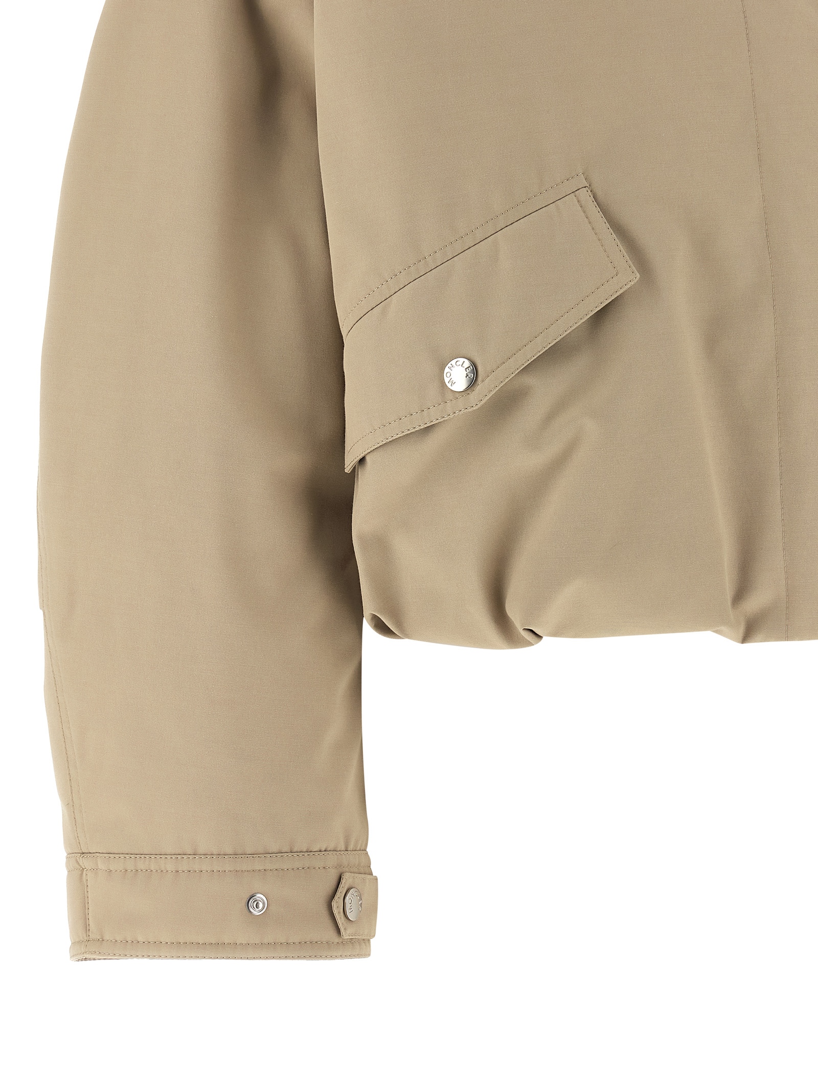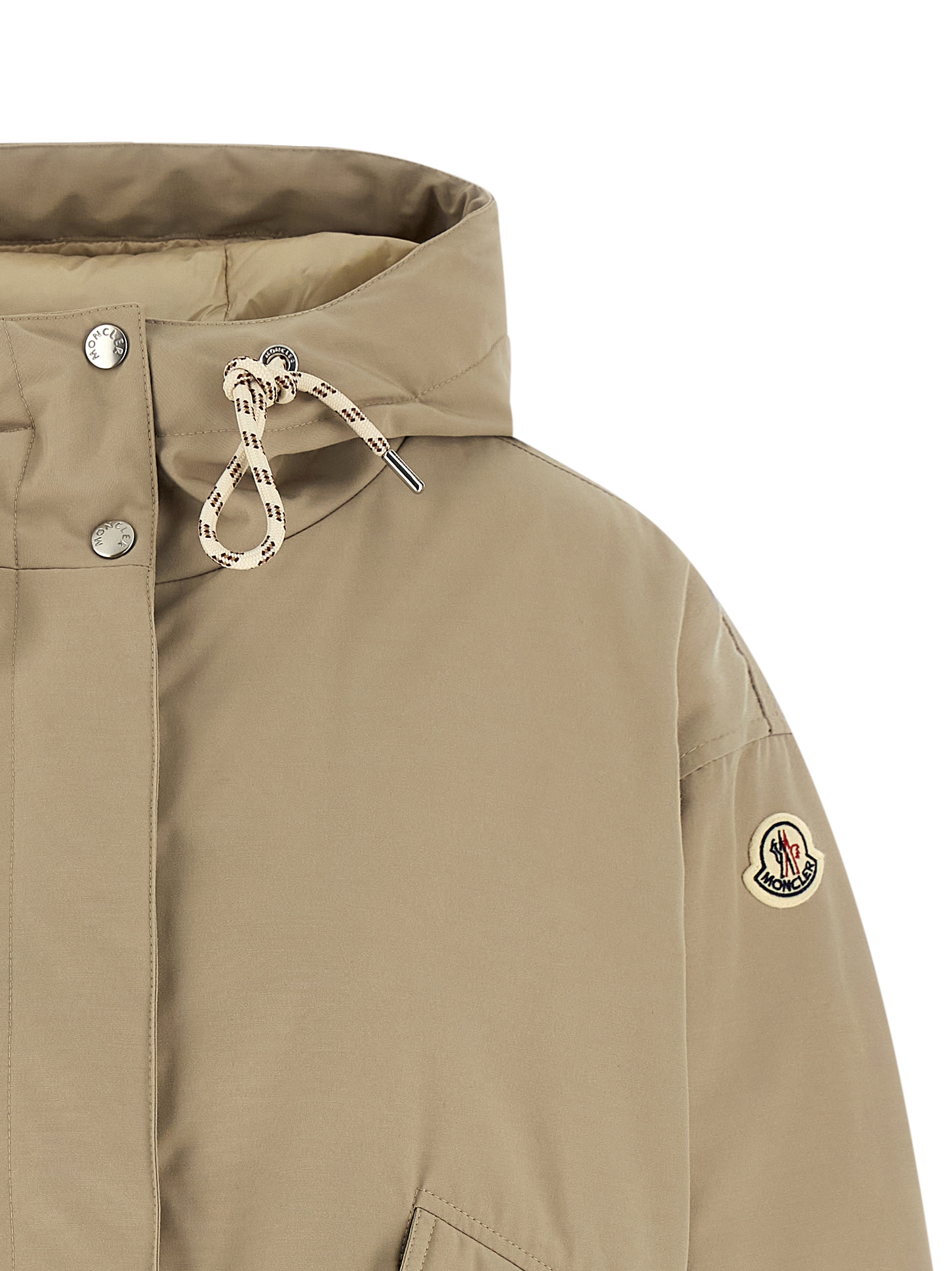 ‘Eucalyptus’ short down jacket in cotton and polyester blend, quilted and slightly quilted goose feather long saison ue lining, cropped style, adjustable hood, high neck, zip and snap button closure, pockets, long cuffed sleeves, dropped shoulders and felt logo patch, drawstring on the hem.