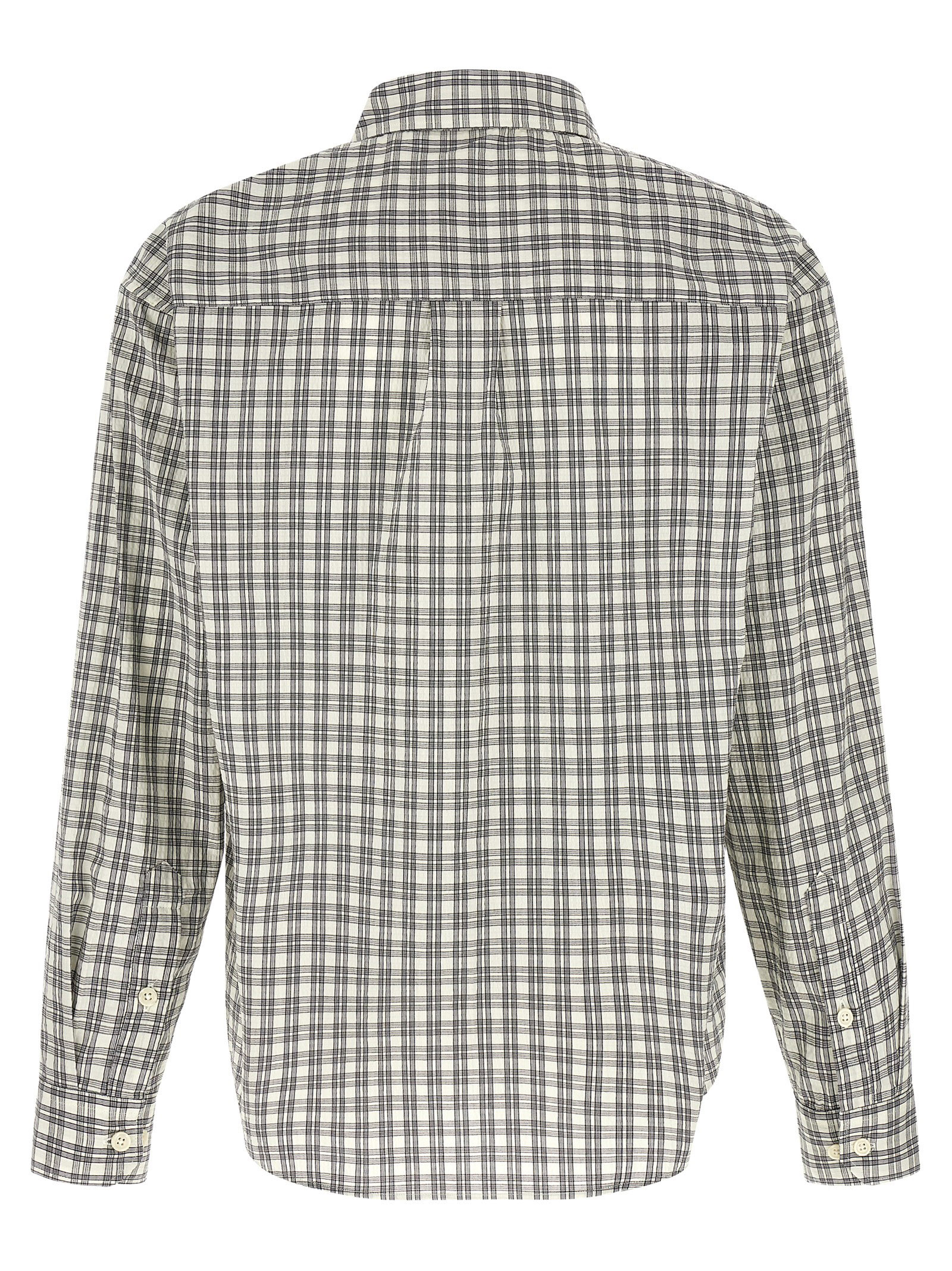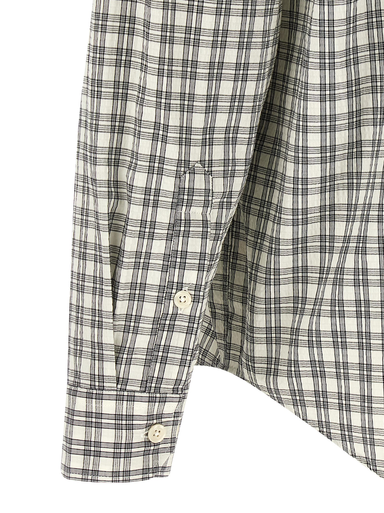 ‘Executive’ shirt in light cotton poplin with a soft hand with check pattern, Italian collar, breast pocket, front button closure, long sleeves with cuffs and dropped shoulder, pleats on the back rack, rounded hem.