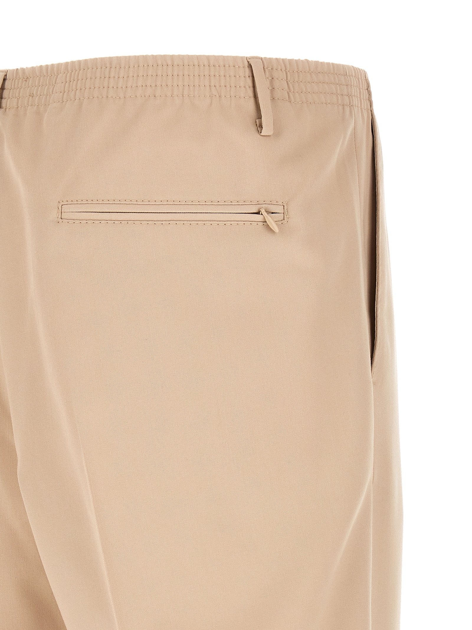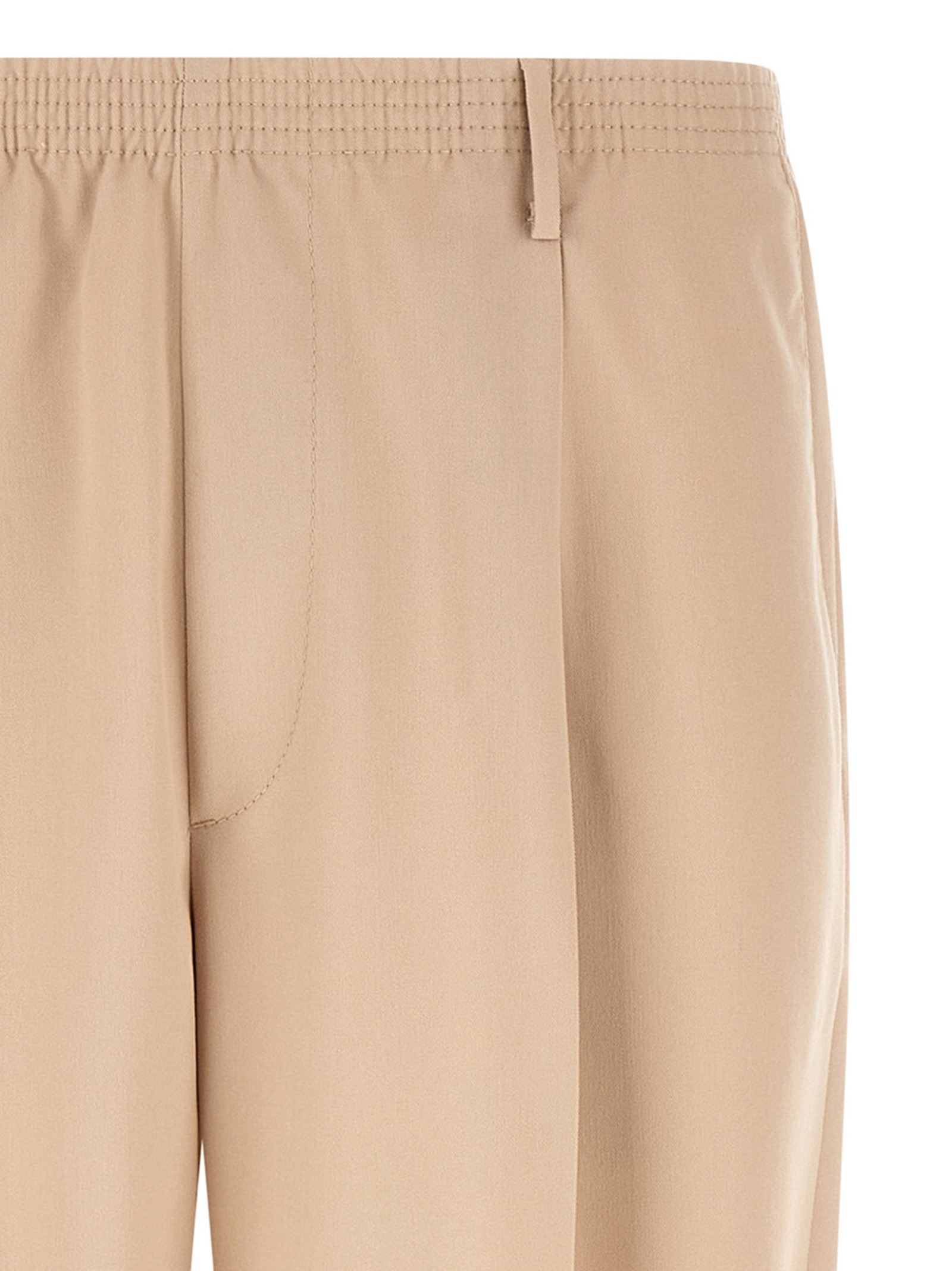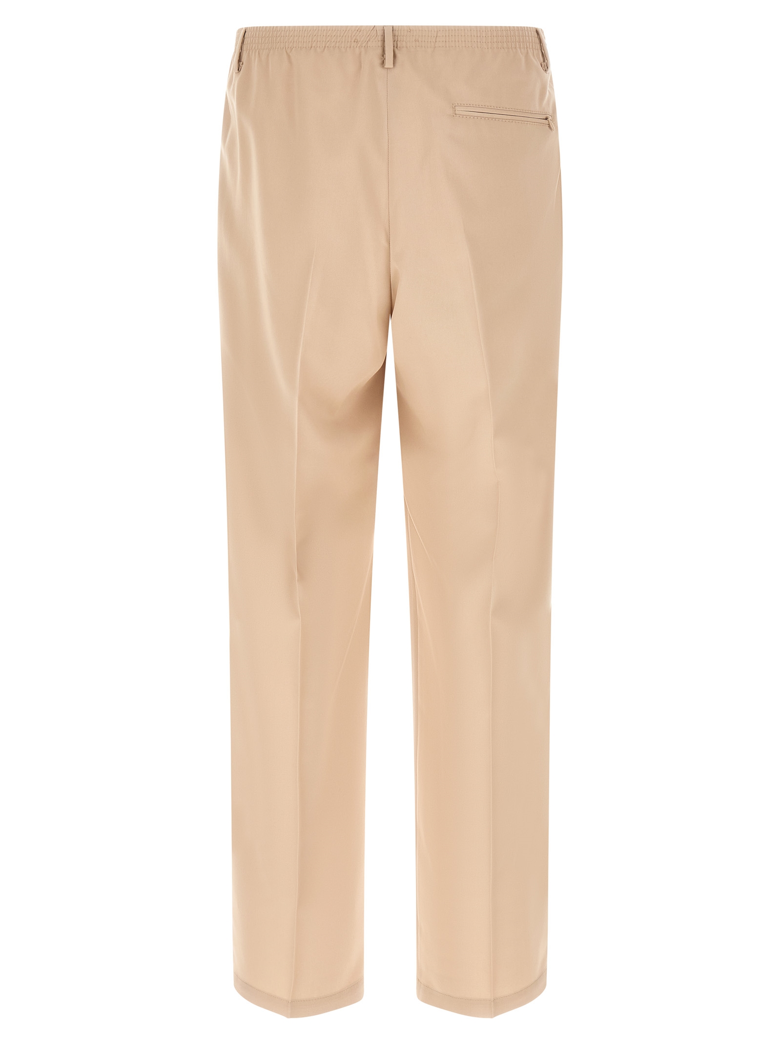 in viscose blend, elastic waistband, belt loops, slanted pockets and back pocket with hidden zip, straight leg, pleats, stretched pleat.