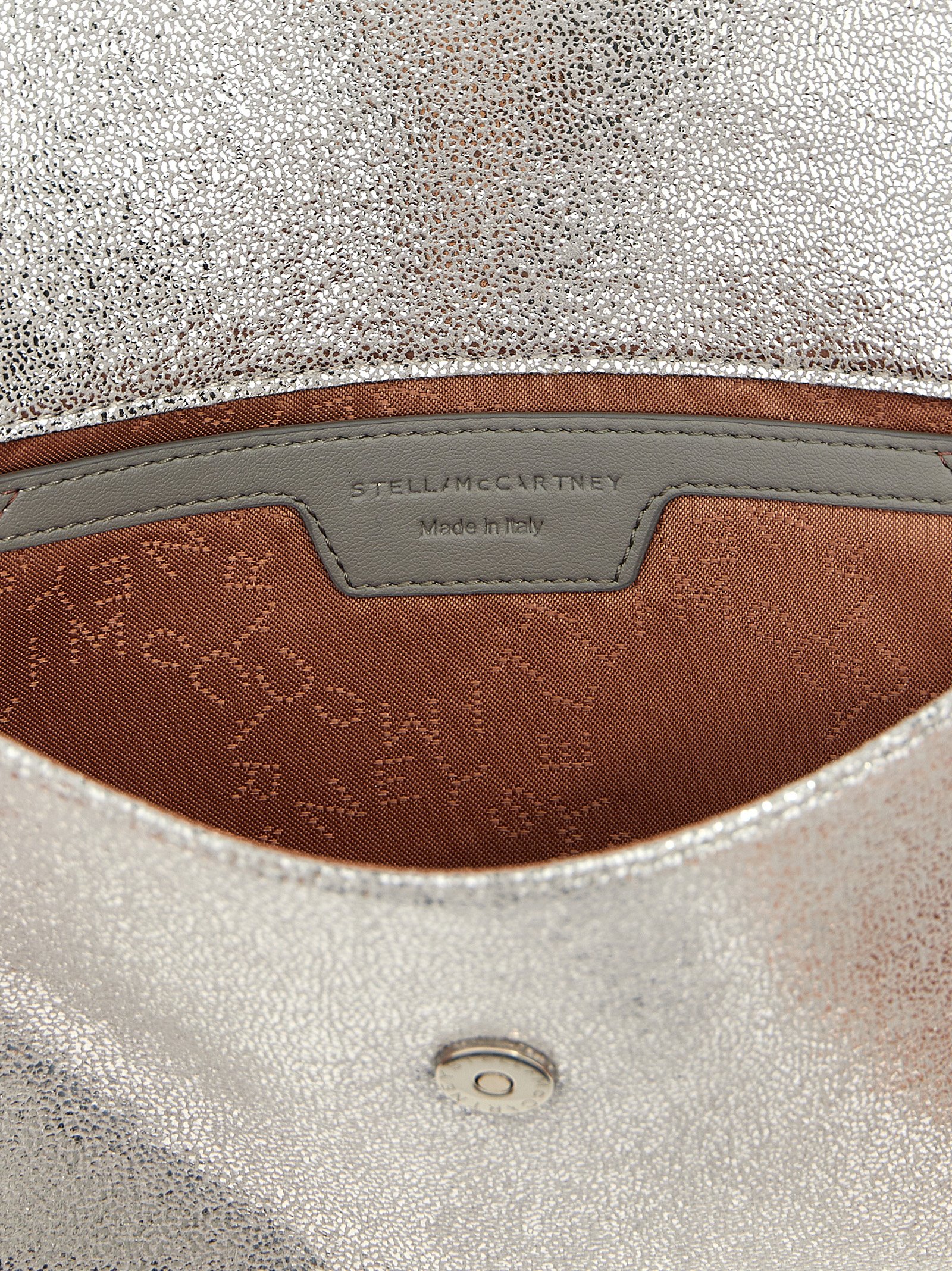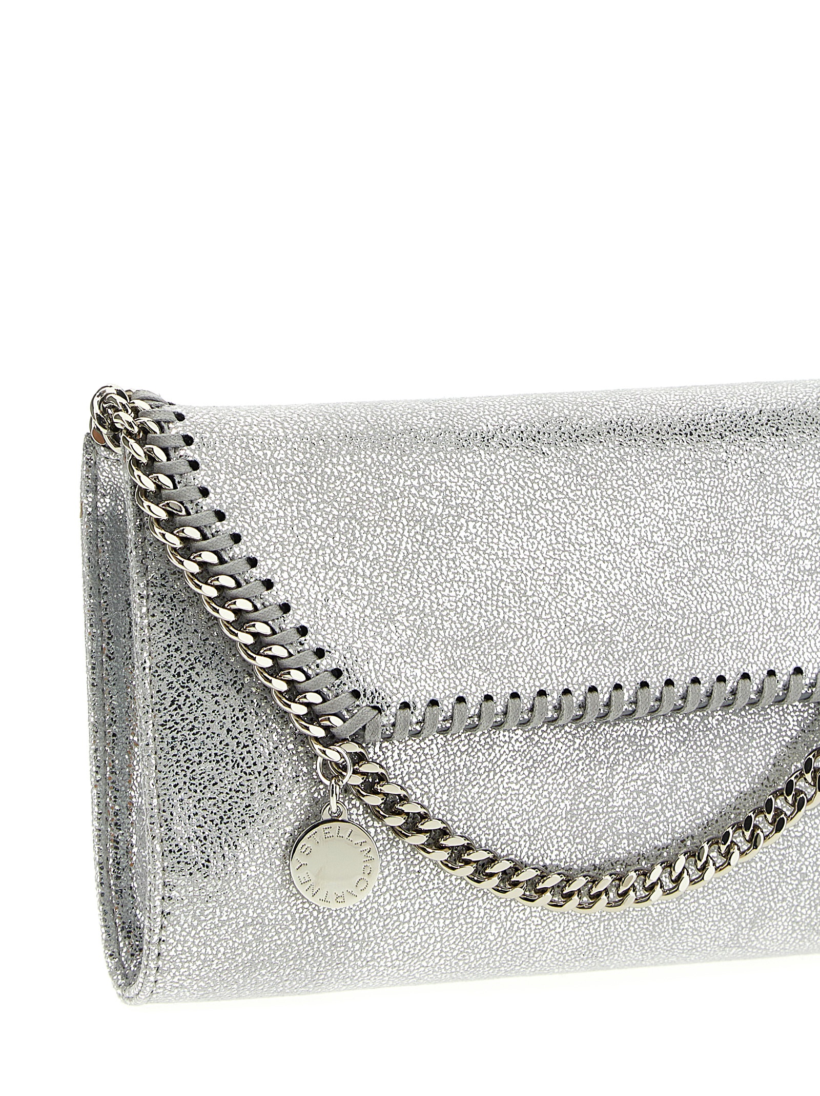 Chain wallet in Shaggy Deer vegan fabric with a semi-gloss finish, Falabella diamond chain, magnetic flap closure, chain shoulder strap, medallion charm with engraved logo.