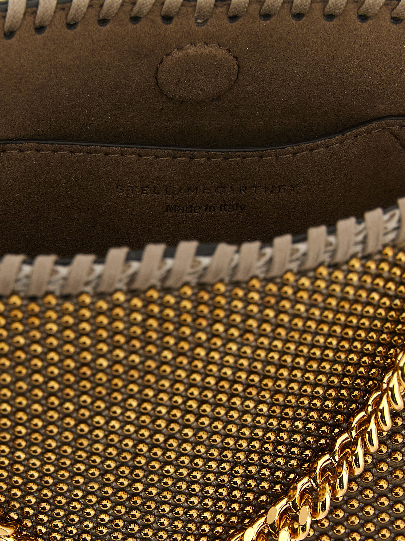 ‘Falabella’ mini handbag in Eco Hotfix Studs Mesh fabric, double fixed handle and diamond-effect chain shoulder strap in brass and removable aluminium, magnetic closure, medallion charm with engraved logo.