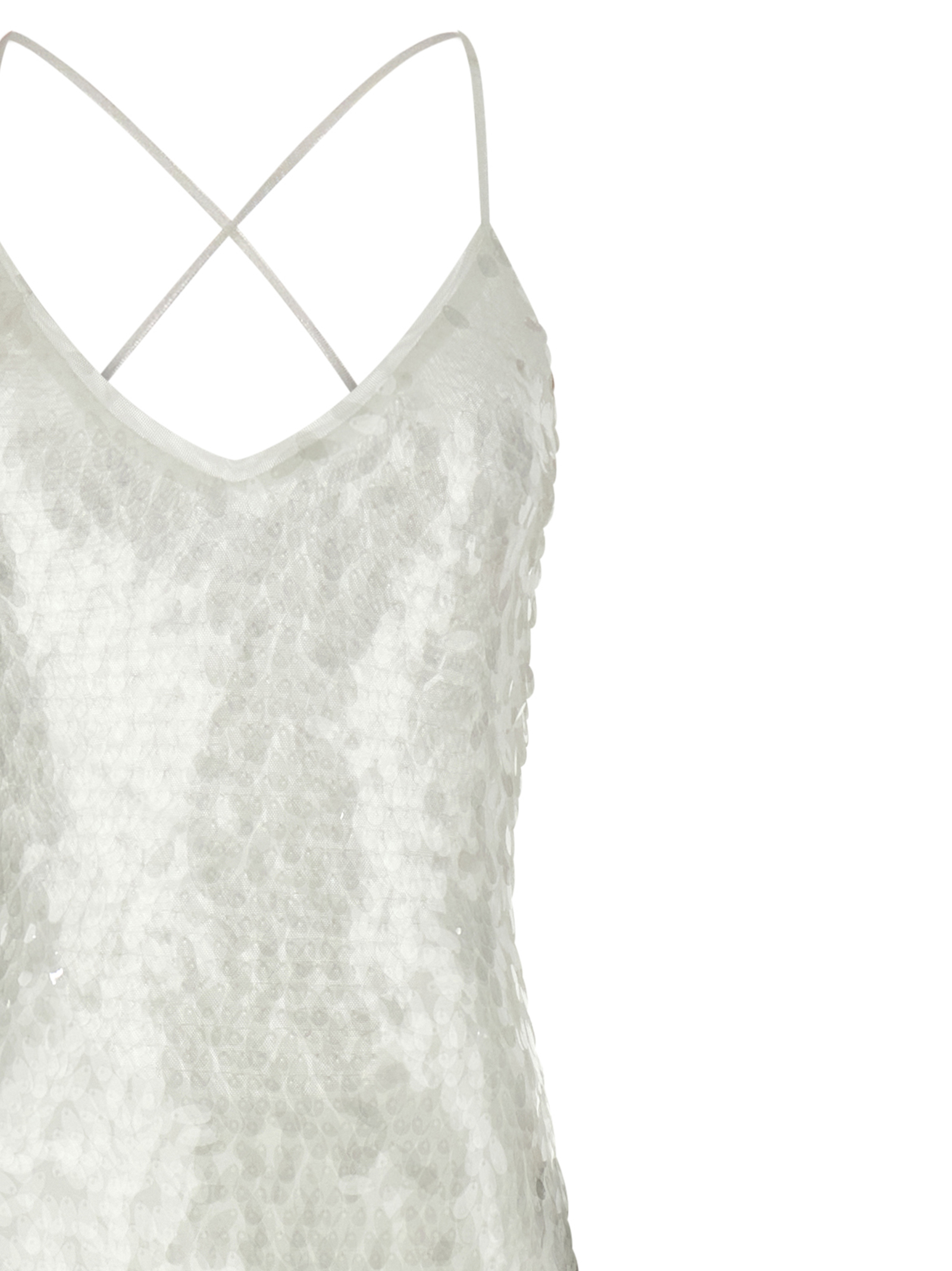 ‘Fara’ long dress in semi-transparent stretch fabric with all-over tone-on-tone teardrop sequins, wide front V-neck, wide back round neckline with crossover straps, sleeveless, mermaid skirt, inner mesh briefs.