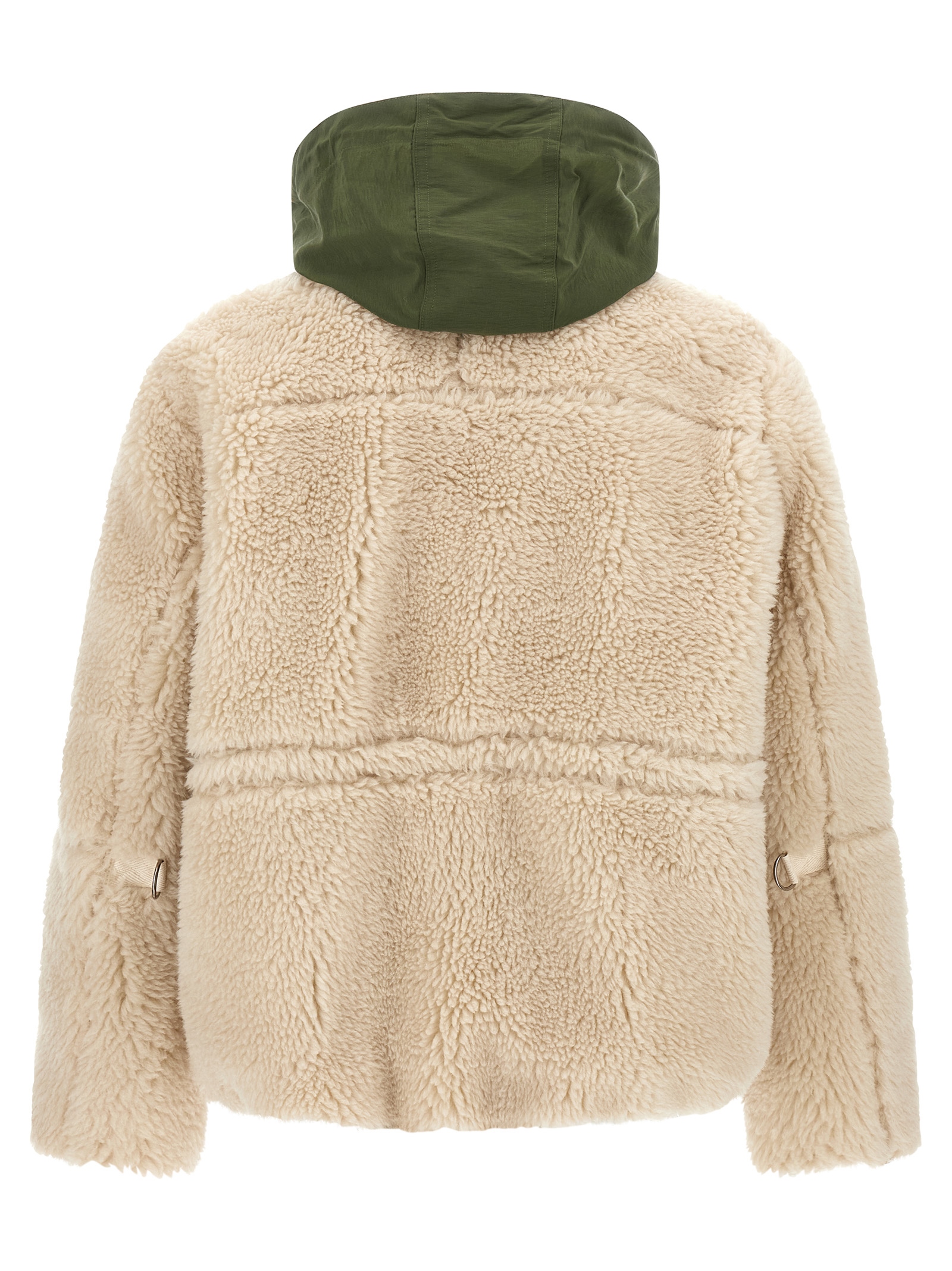 Wool parka with faux shearling inserts, front zip closure, high neck, adjustable hood, pockets, long sleeves, drawstring at the waist.