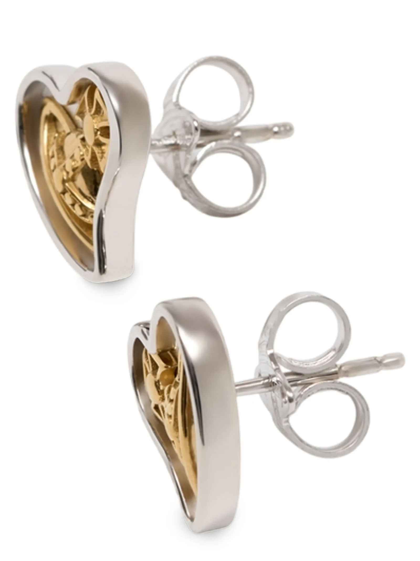 Asymmetric silver heart ‘Faye’ earrings with gold central Orb logo detail.