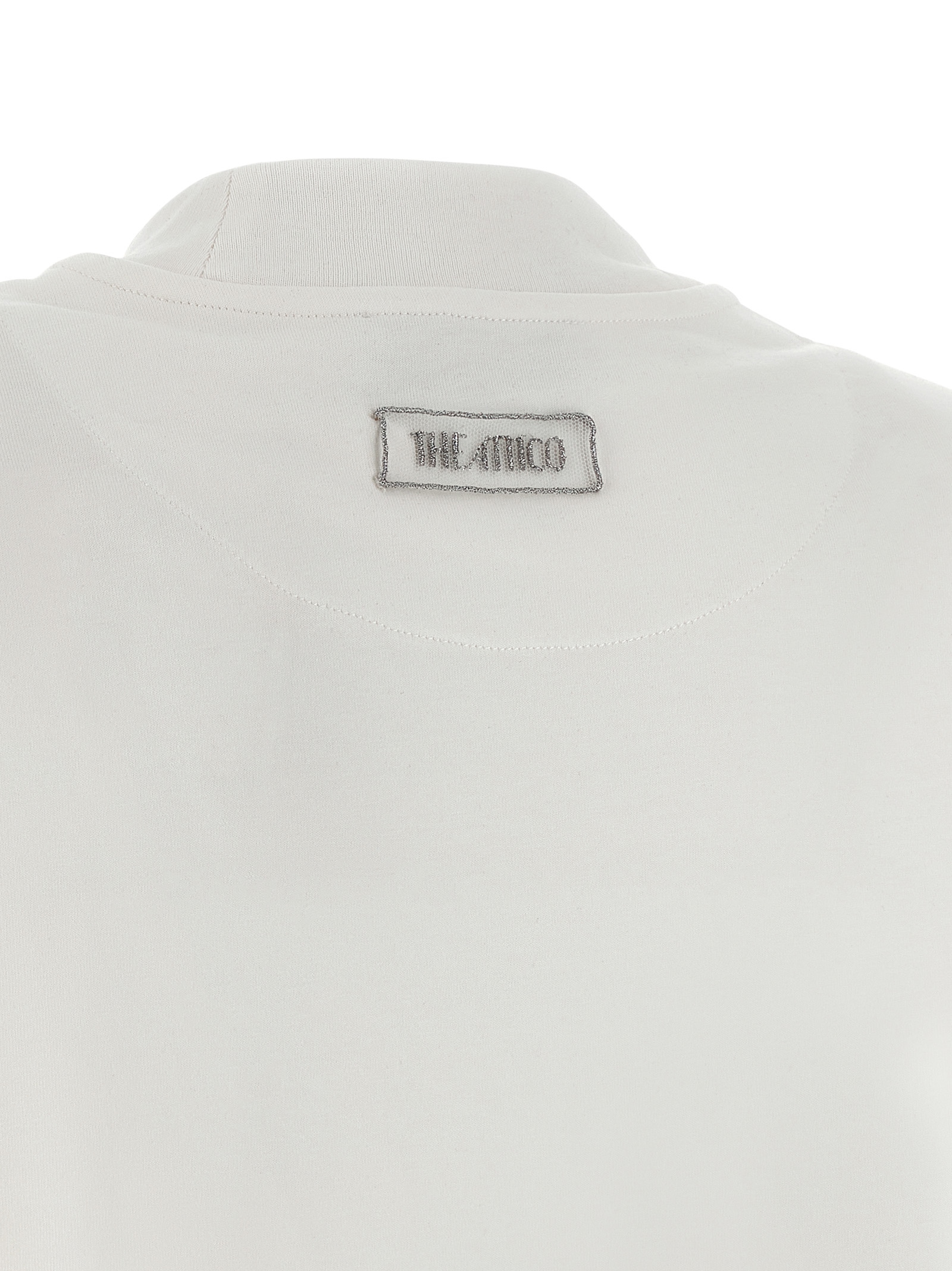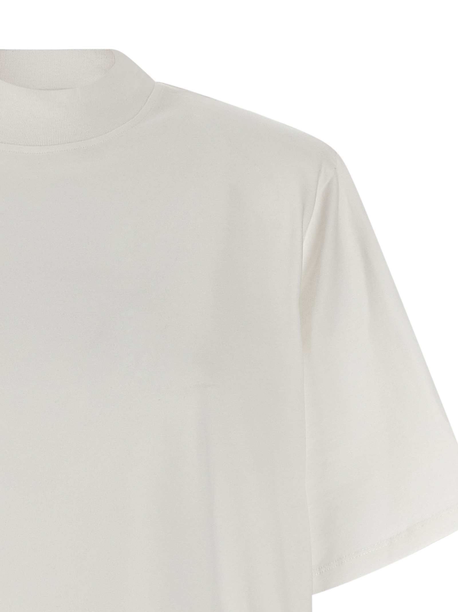 T-shirt mini dress in light cotton jersey with crewneck, removable padded shoulder straps, short sleeves, and hem with tone-on-tone marabu feather application.