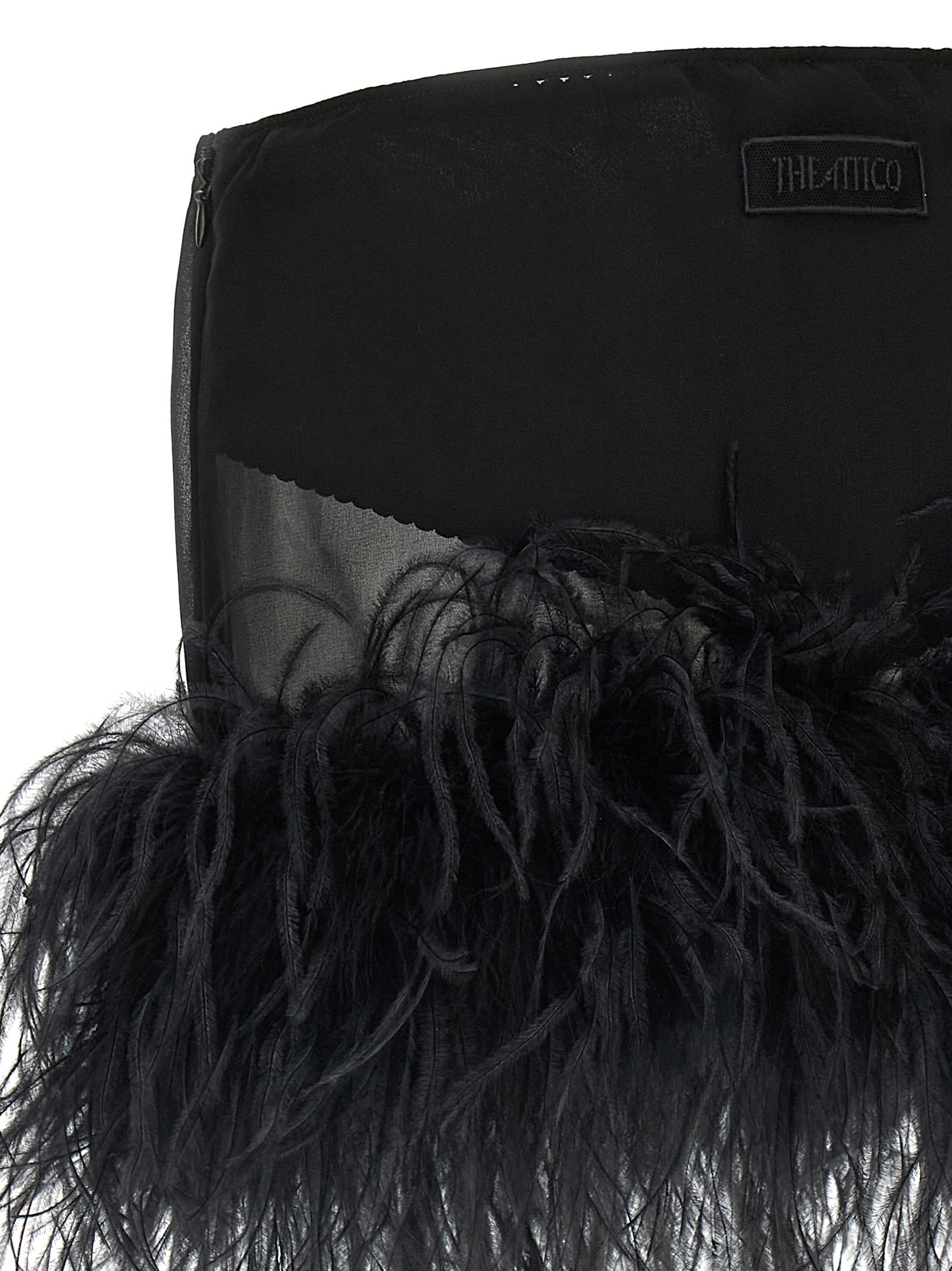 Mini skirt in semi-transparent georgette, garment hem with tone-on-tone marabu feather application, side zip closure, tone-on-tone inner briefs.