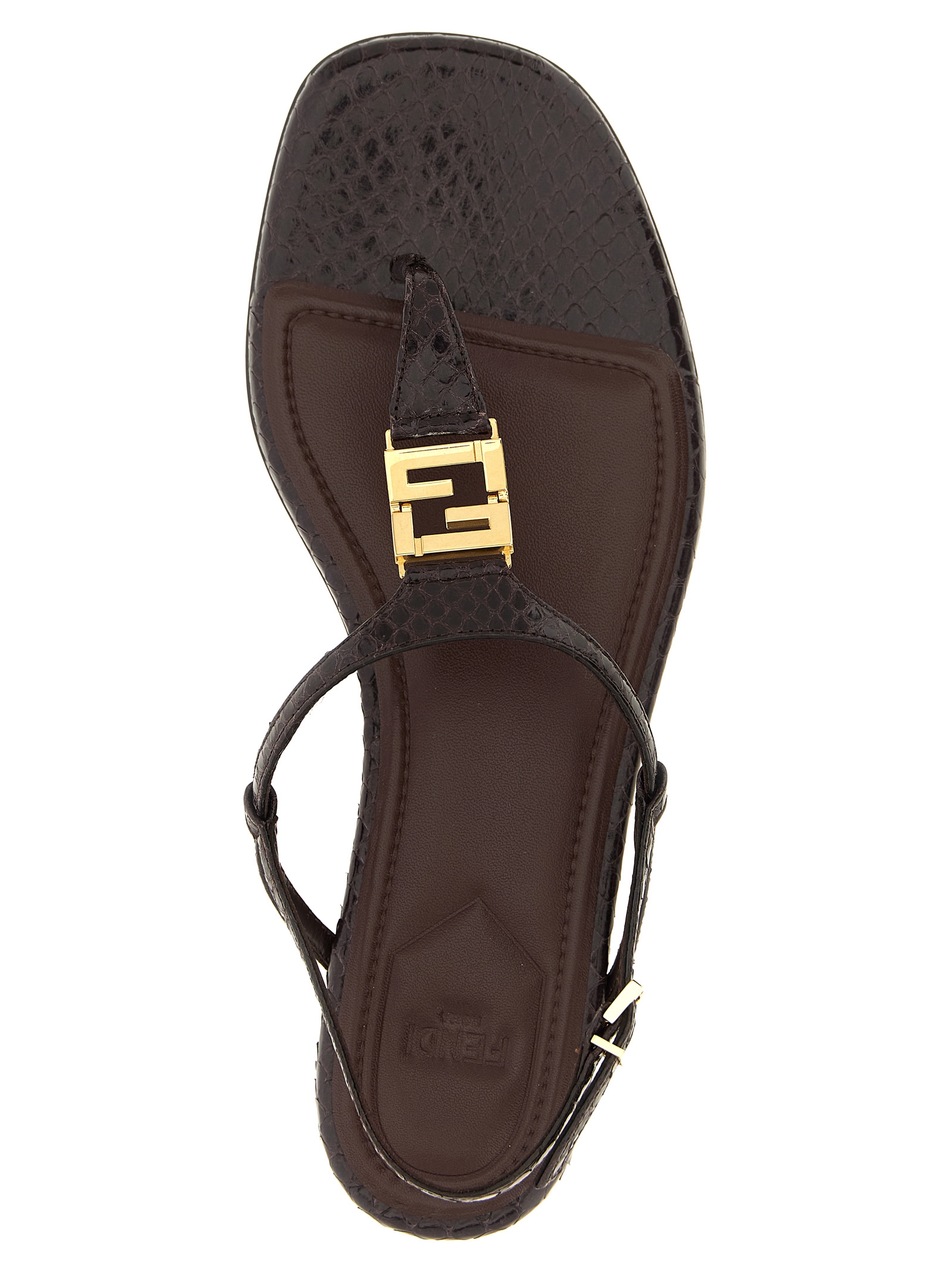 Fendi FFold’ ayers thong sandals with square toe and metal logo on the front, adjustable strap, leather sole.