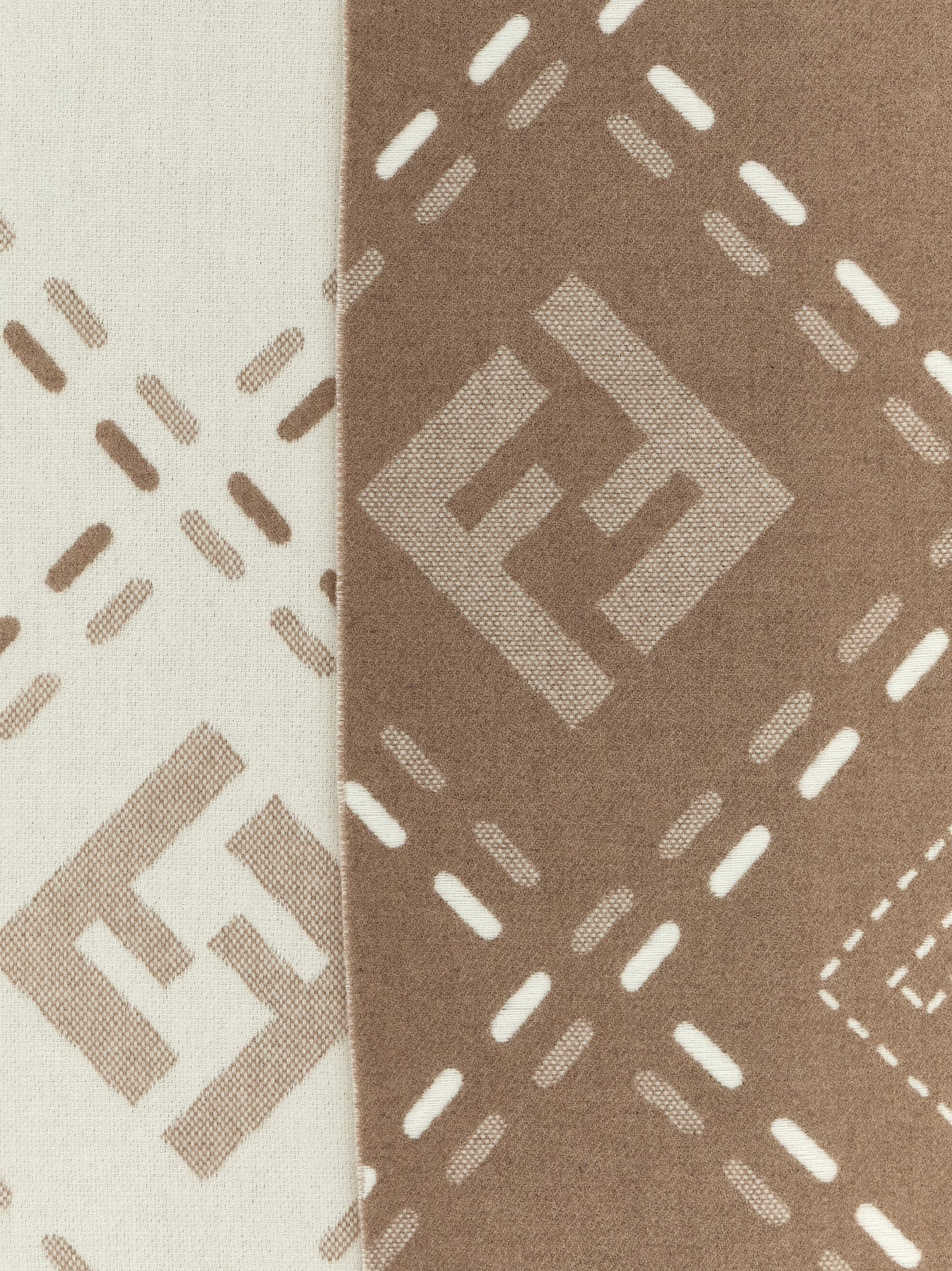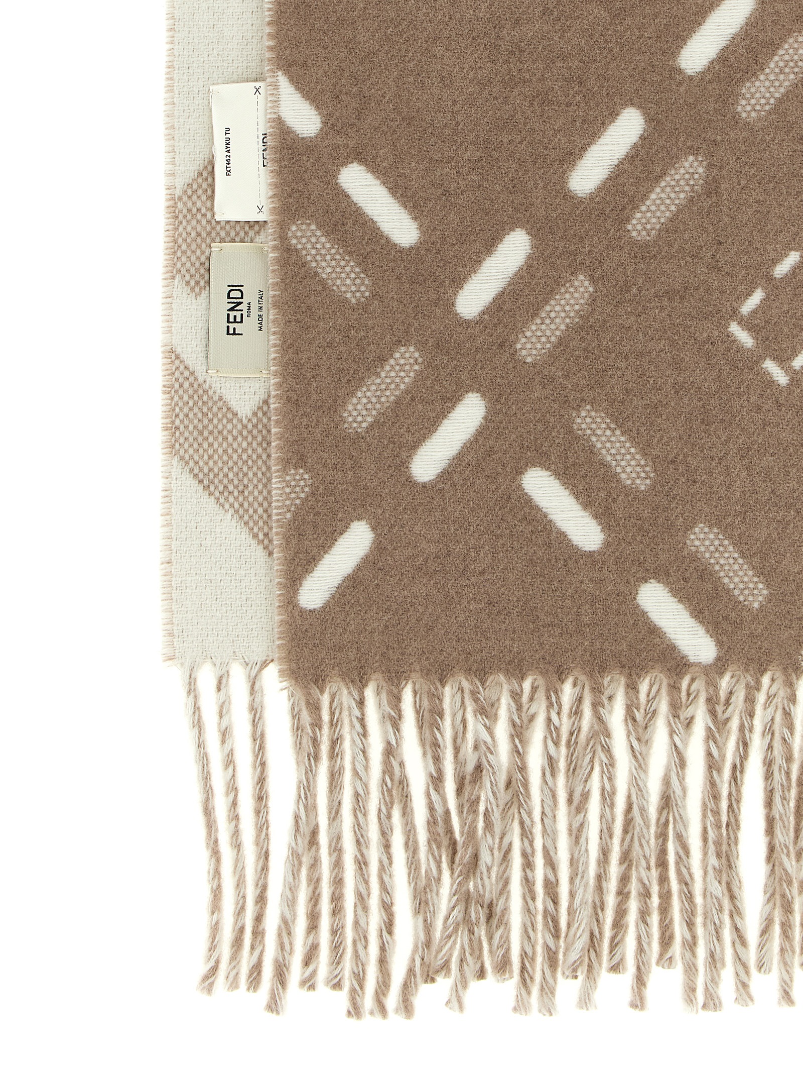 Selleria Macro Check ‘Fendi’ wool scarf with jacquard stitching pattern and FF logo in two different contrasting graphic textures, fringed edges.