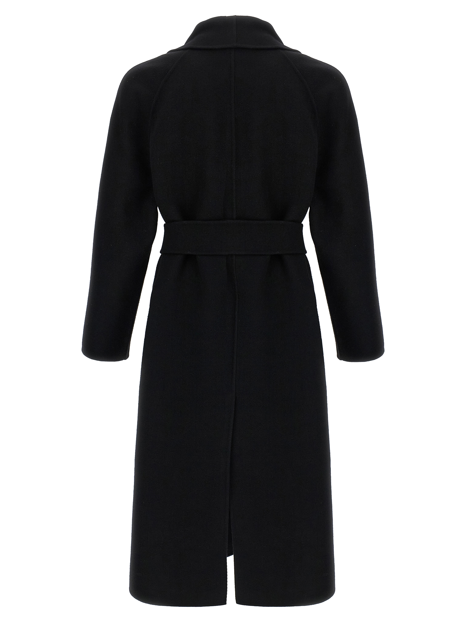Double felt wool Ferro’ coat with double breast button closure, shawl collar, pockets, long raglan sleeves, back split, silk lining, removable belt.
