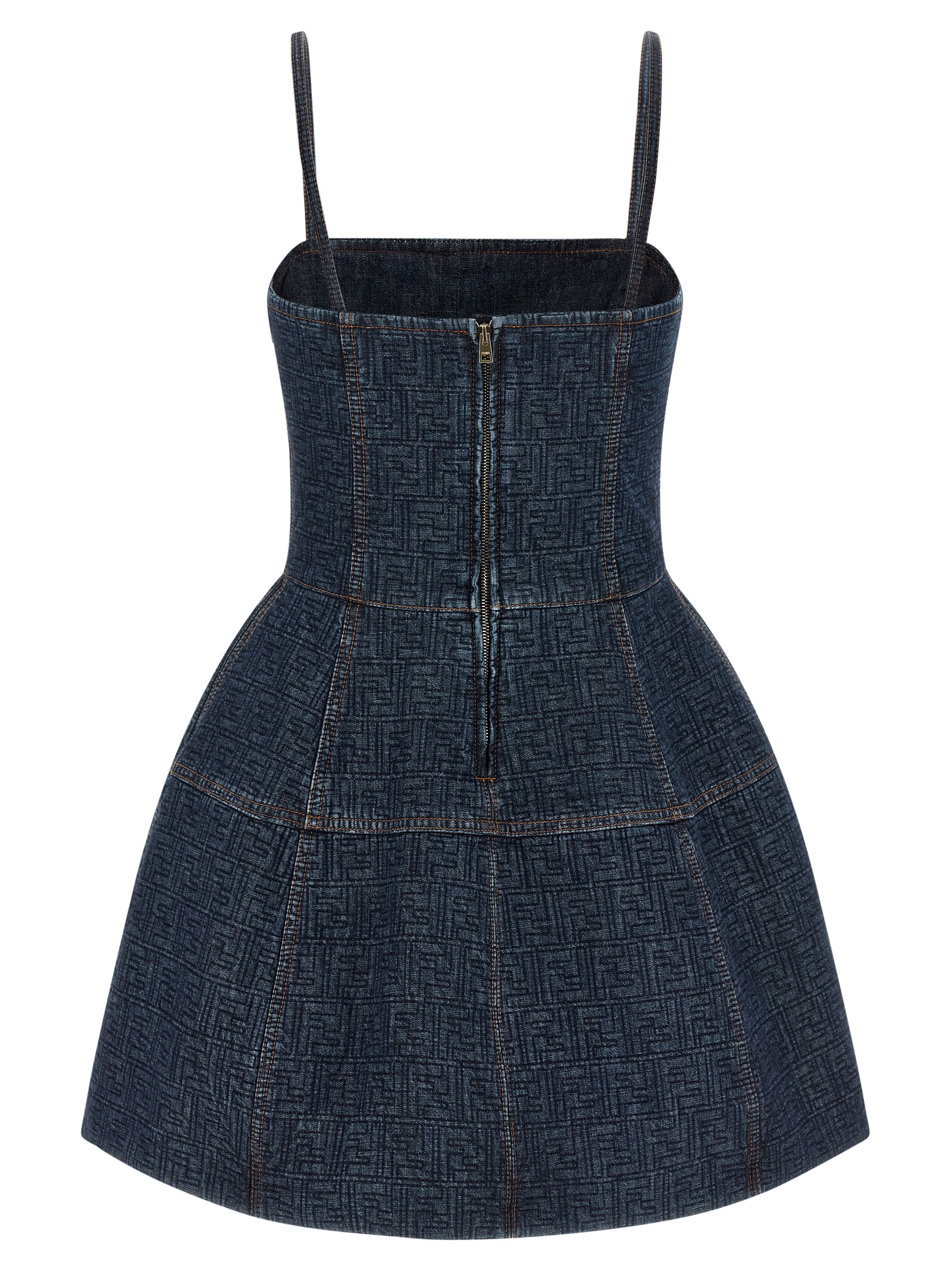 All-over quilted ‘FF’ denim mini dress, balloon bustier and skirt, back zip closure, thin straps.