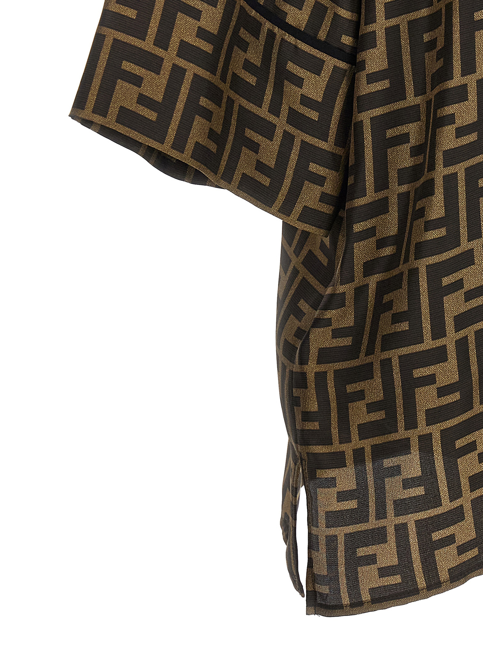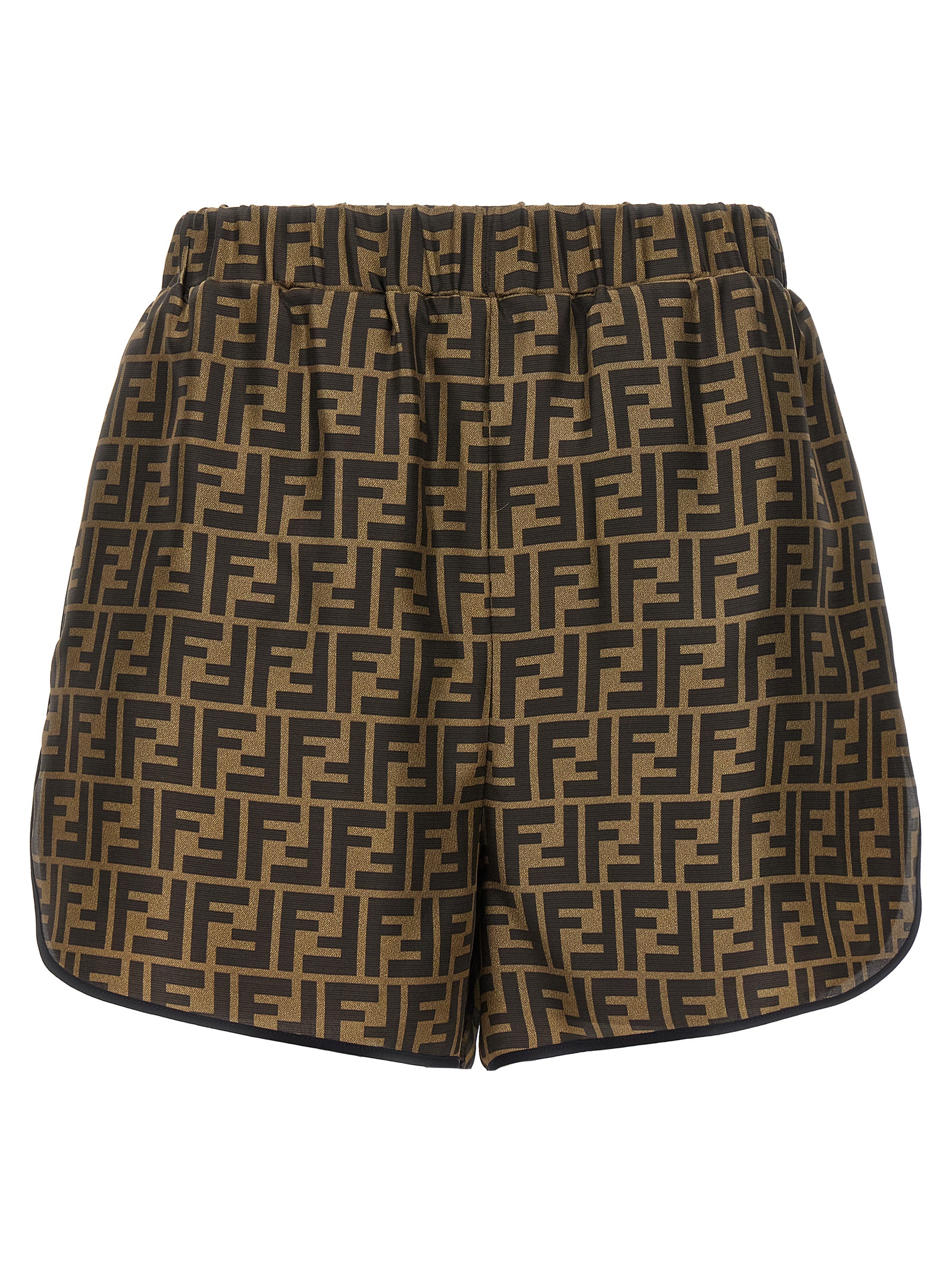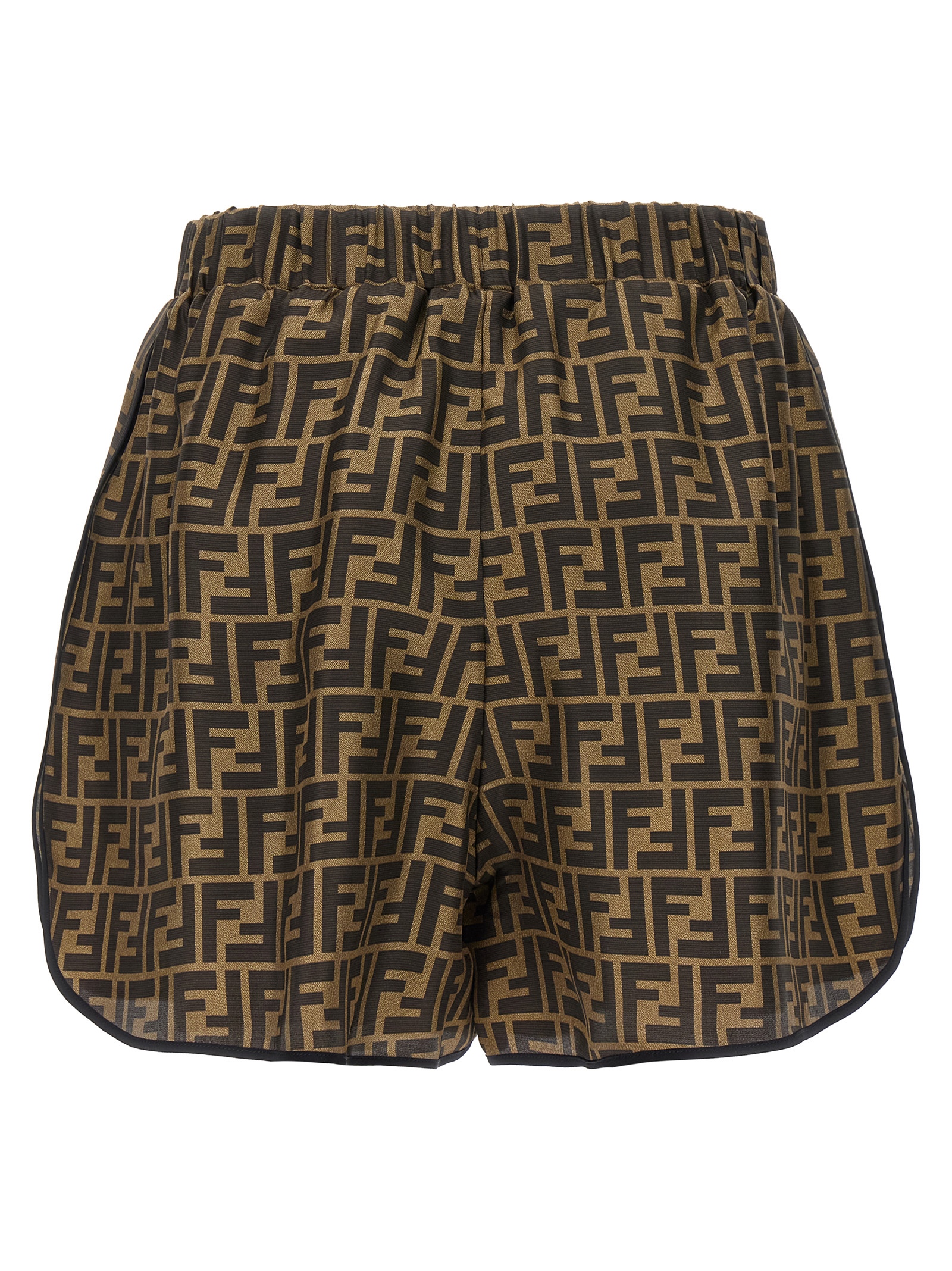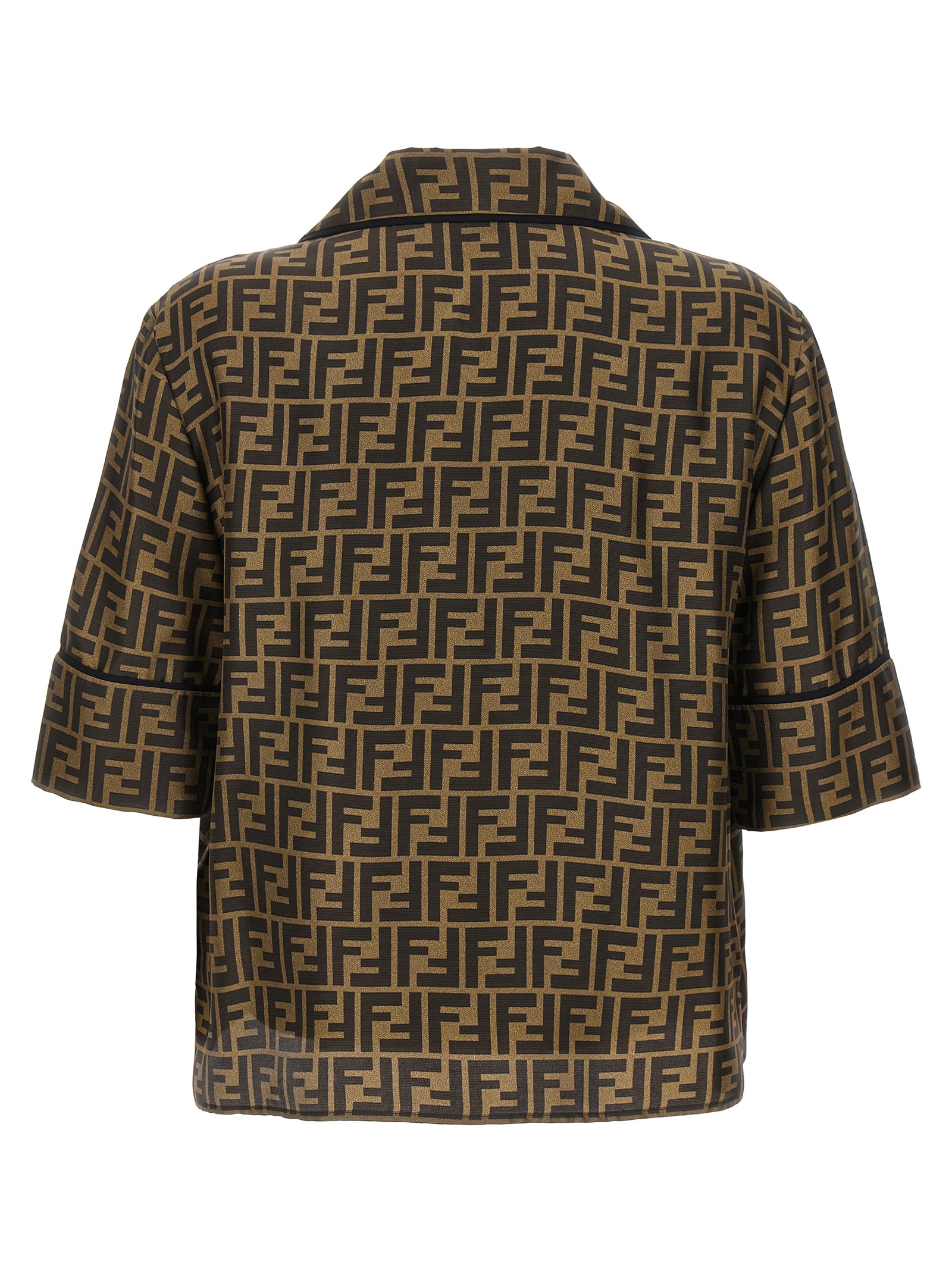 All-over ‘FF’ logo print silk pajama suit, short-sleeved shirt with button closure and front pockets, shorts with elastic and drawstring at the waist and pockets. Matching silk sachet.