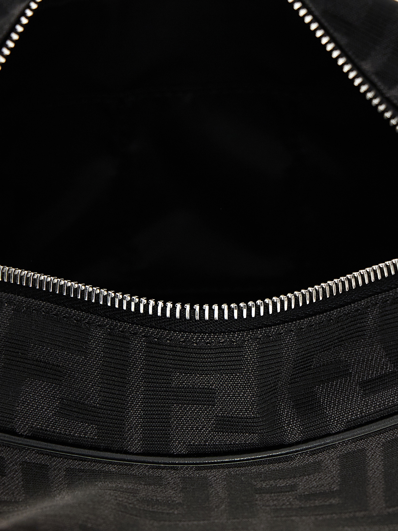 Small fabric ‘FF’ beauty bag with all-over logo pattern, leather details and handle, and zip closure.