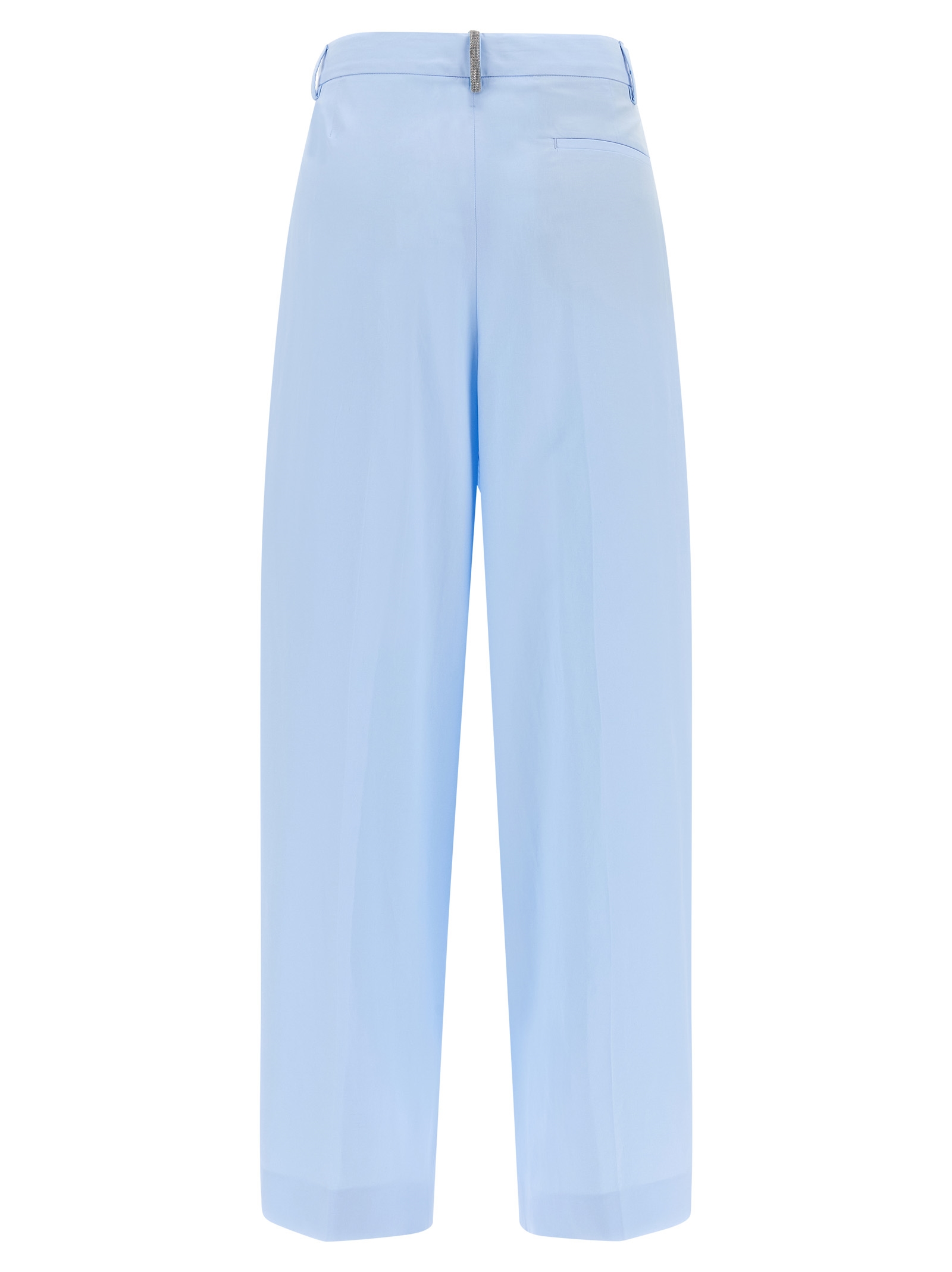 Cotton poplin pants, lining, wide and straight leg, pince, stretched pleat, high waist, front French pockets, welt pockets and ‘Filo Diamante’ detail at the back.
