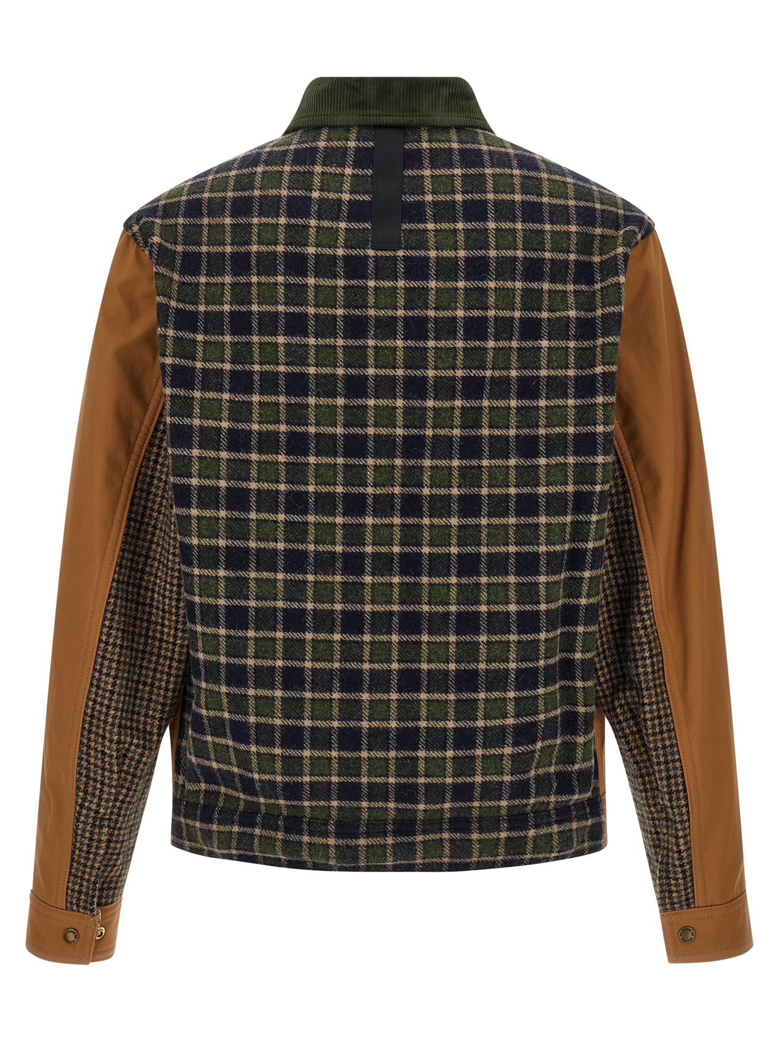 Filson x Junya Watanabe jacket consisting of front in cotton canvas and back in patterned wool check and houndstooth, unlined, corduroy shirt collar, logo patch and front snap button closure, pockets, long sleeves with cuffs.