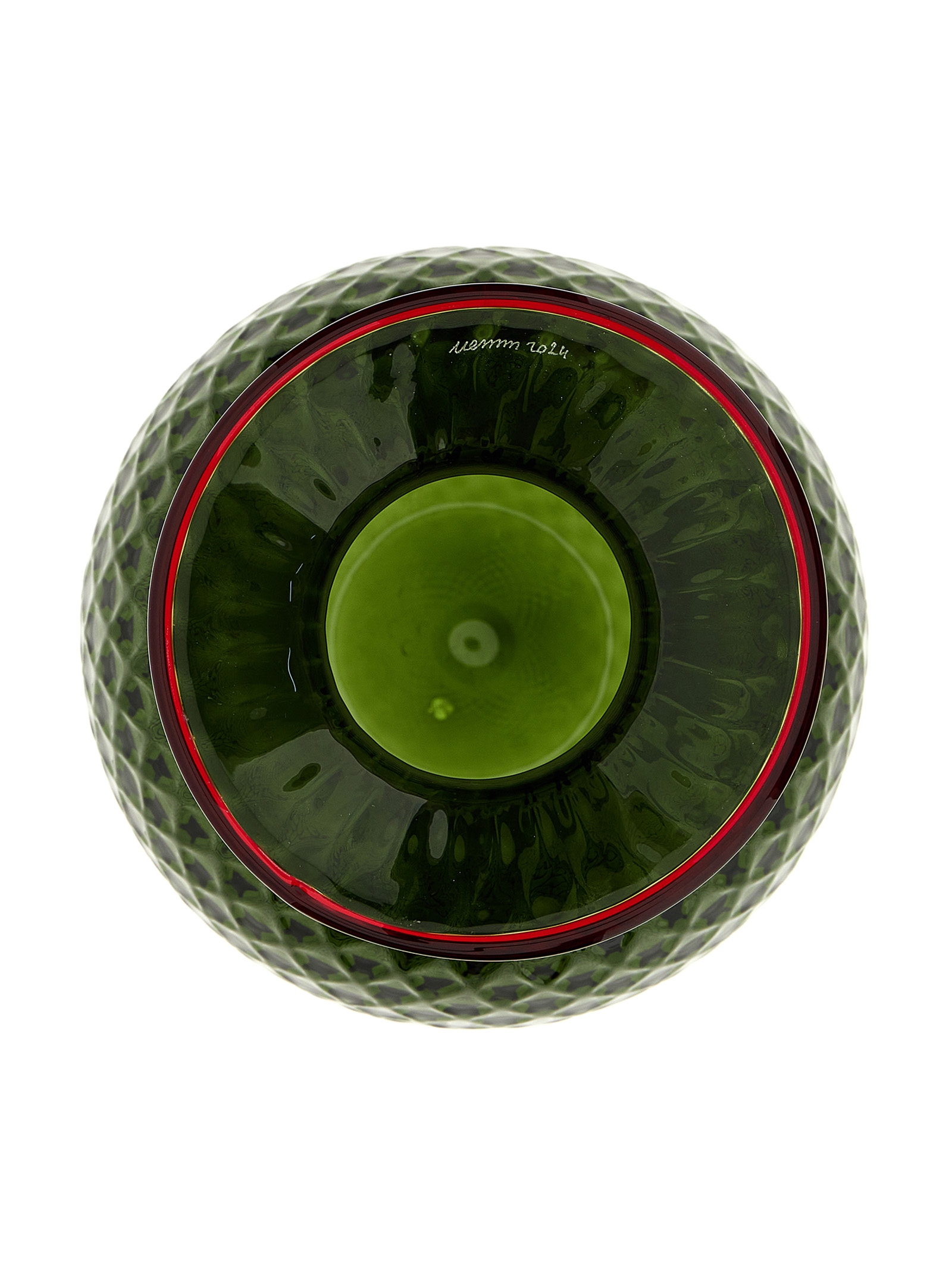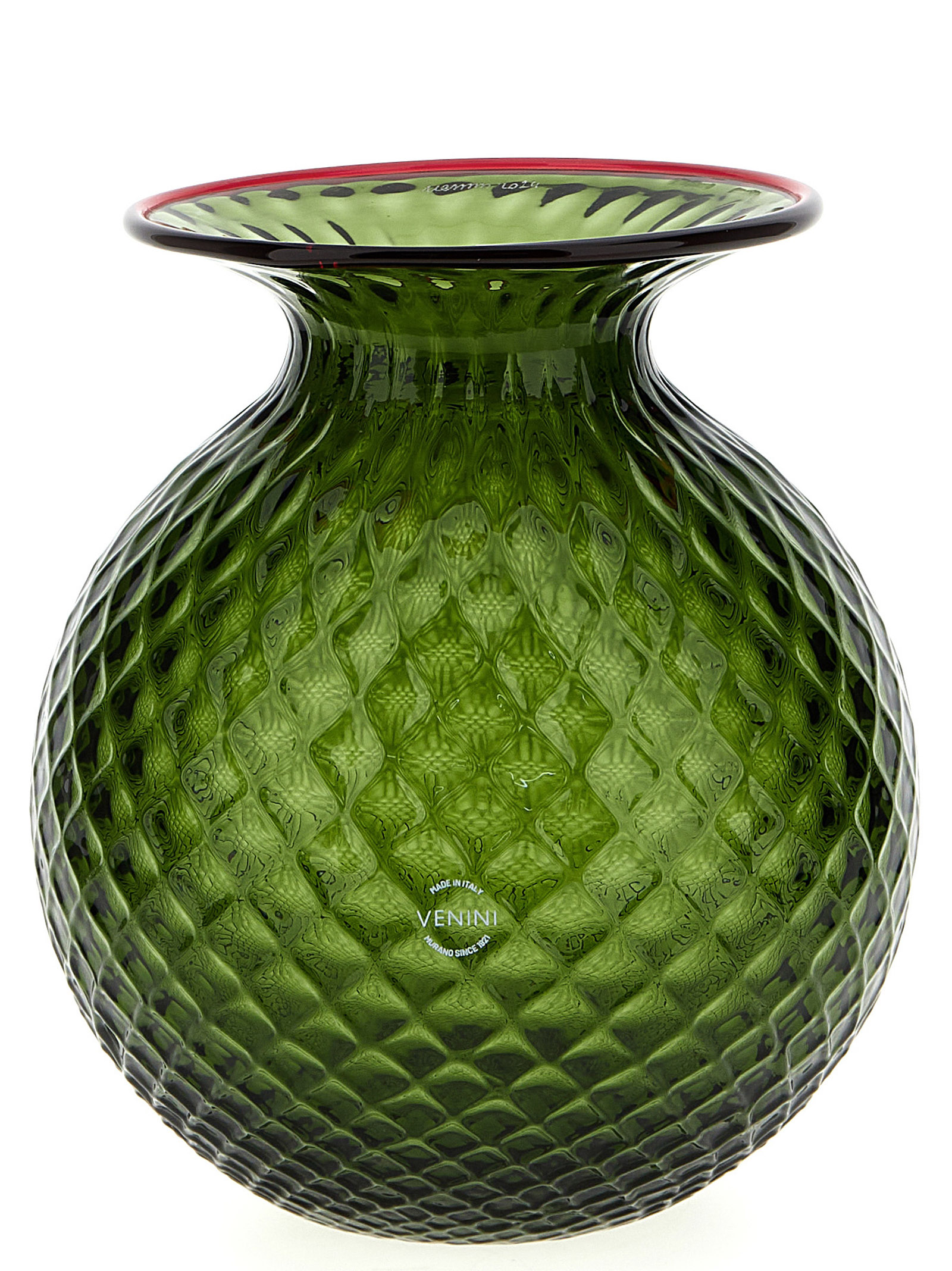 It looks soft, yet it is glass. The optical illusion of the 1970 Monofiori by VENINI is in its name: Balloton, the unique process that recreates the quilted effect on the surface. The work is handmade, blown in the characteristic metal mold and finished in the thin neck with a hot applied colored thread, which varies in color.