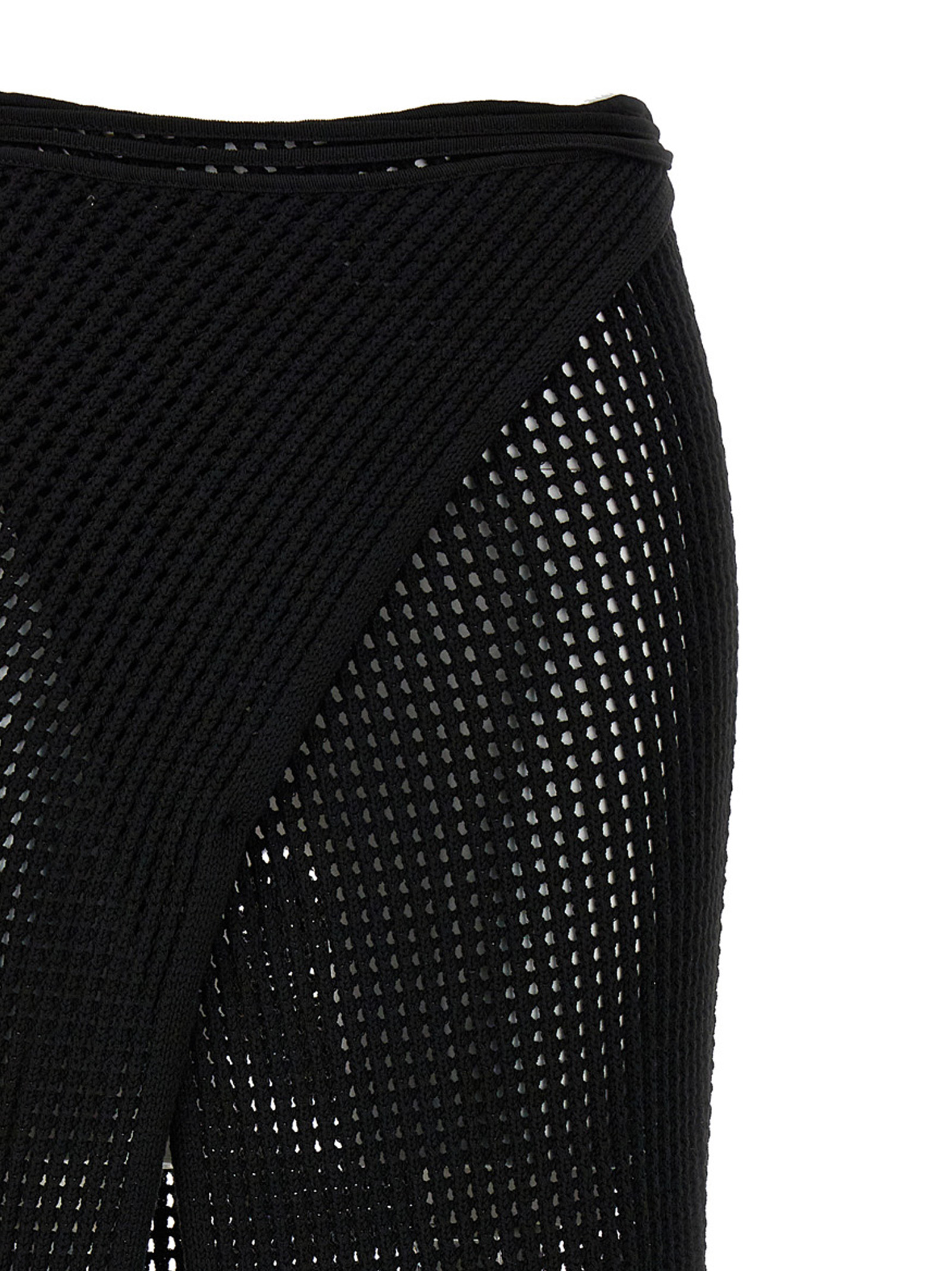 ‘Fishnet Knit Midi Wrap’ openwork viscose blend knit skirt, featuring a wrap closure and laces to be knotted around the waist.