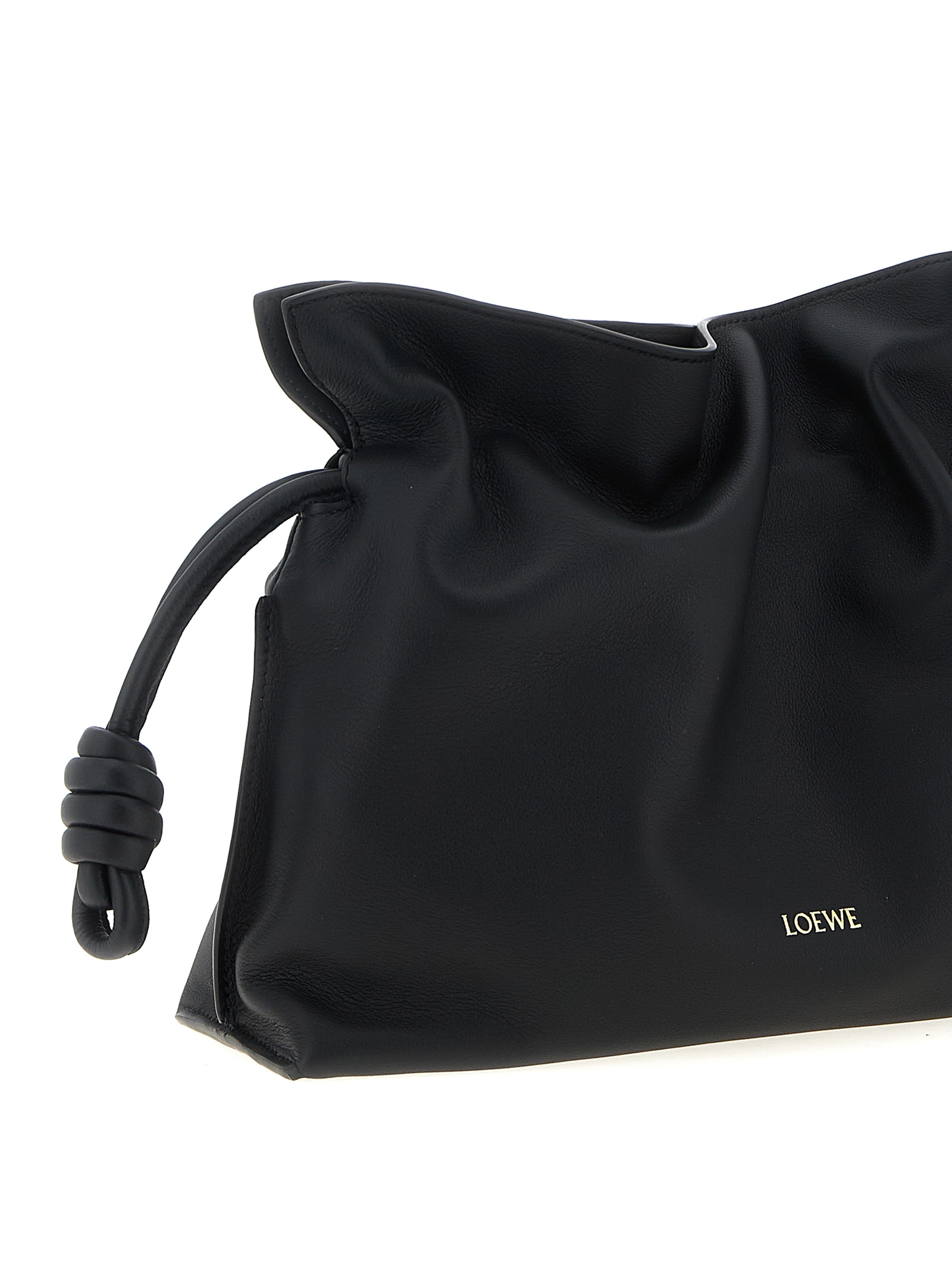 Nappa Flamenco Medium clutch with front embossed logo, drawstring closure, adjustable and removable shoulder strap.