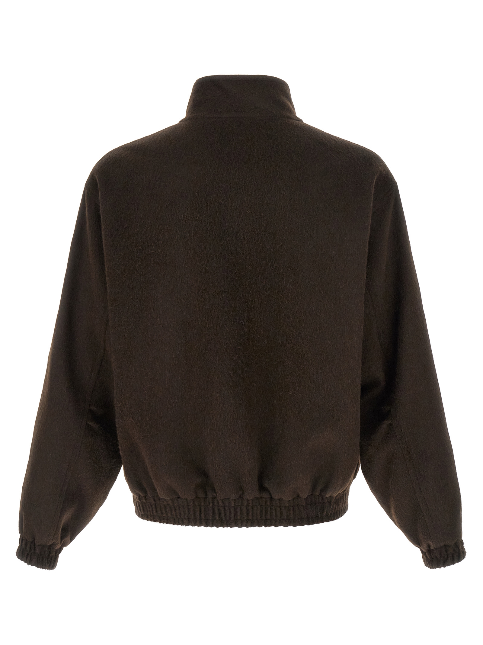 Brushed baby camel flannel bomber jacket, front zip closure, high neck, pockets, long sleeves with elastic cuffs and dropped shoulder, elastic hem.