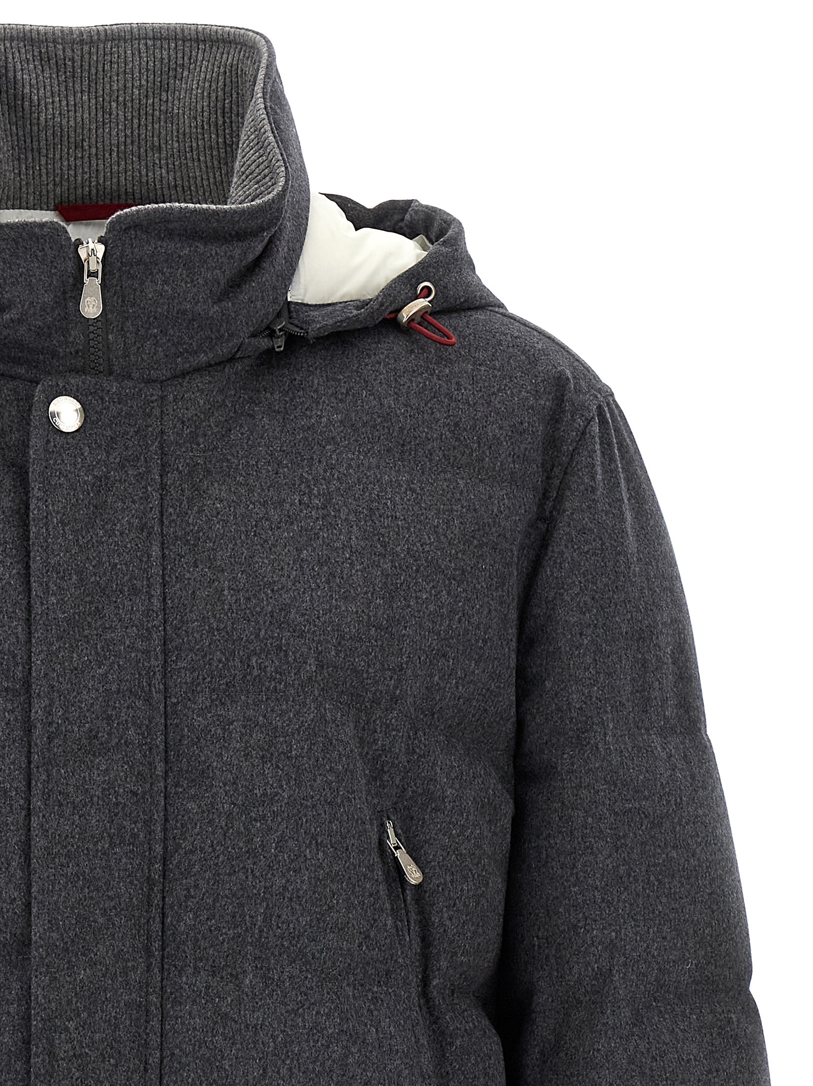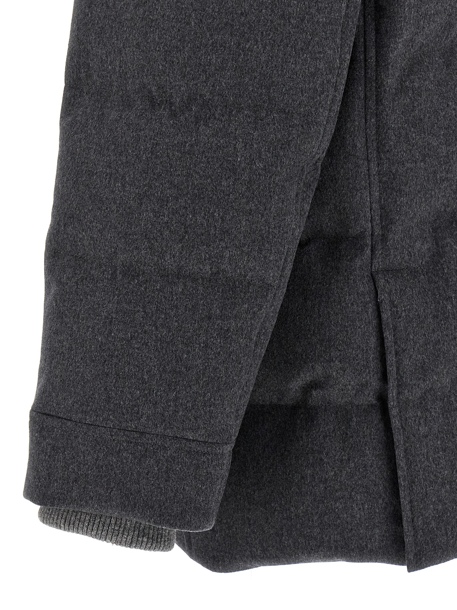 Quilted quilted membrane wool flannel jacket with goose down padding with ribbed cotton knit inserts, adjustable and removable hood, standing collar, front zip and snap button closure, pockets, long sleeves with elastic cuffs, adjustable slits with back snap buttons.