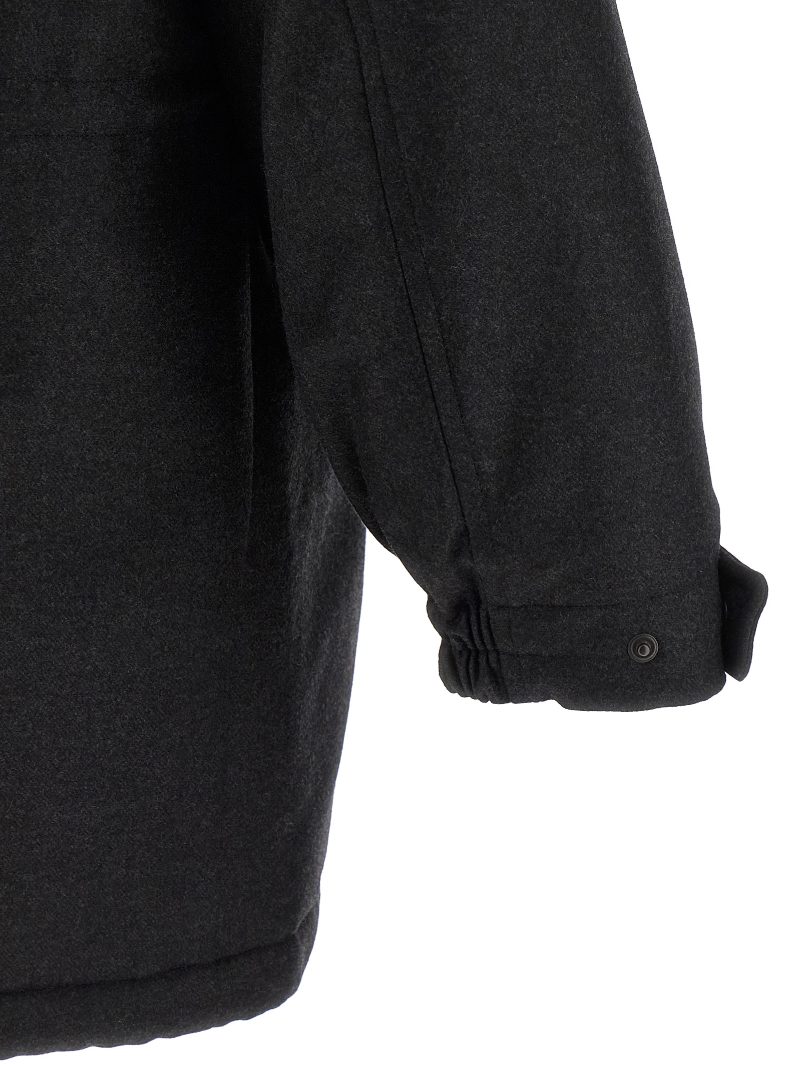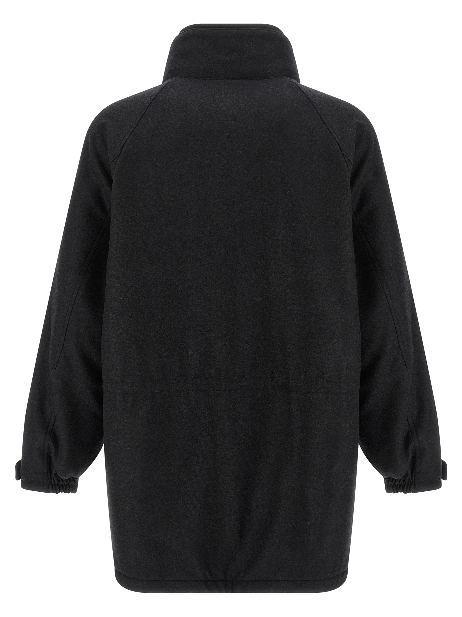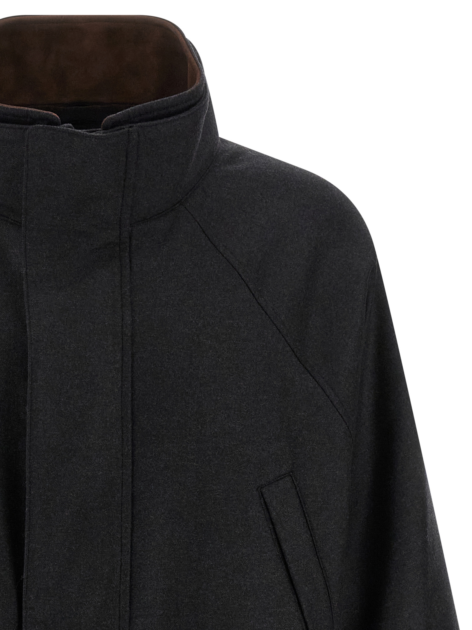 Ultra-fine Australian Merino wool flannel jacket, quilted and slightly padded nylon lining, standing collar with removable suede insert, front zip and snap button closure, pockets, long sleeves with adjustable elastic cuffs, drawstring at the waist and on the hem.
